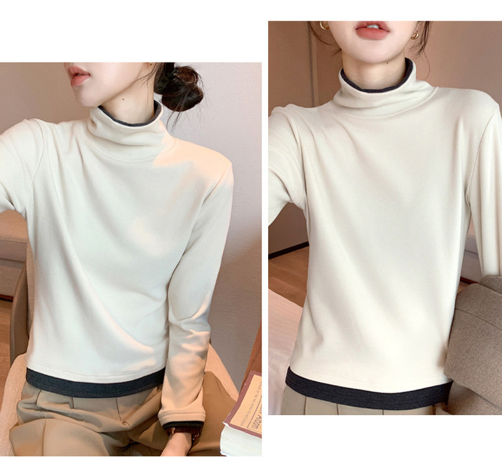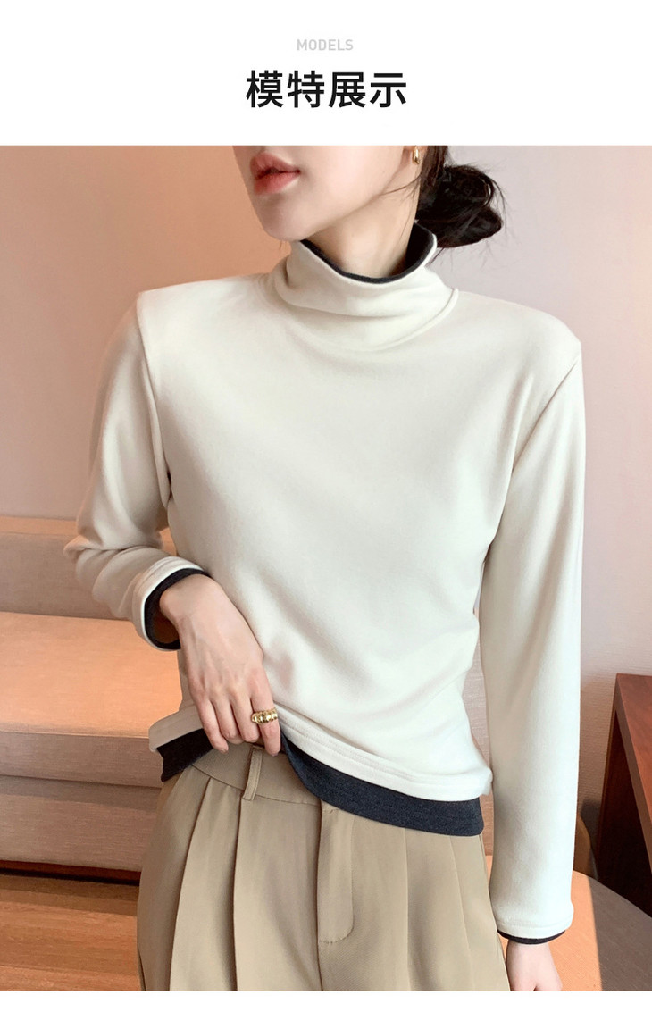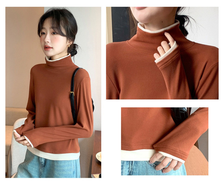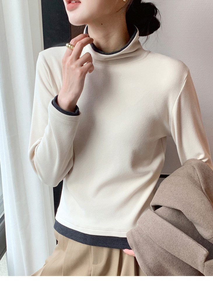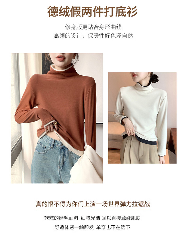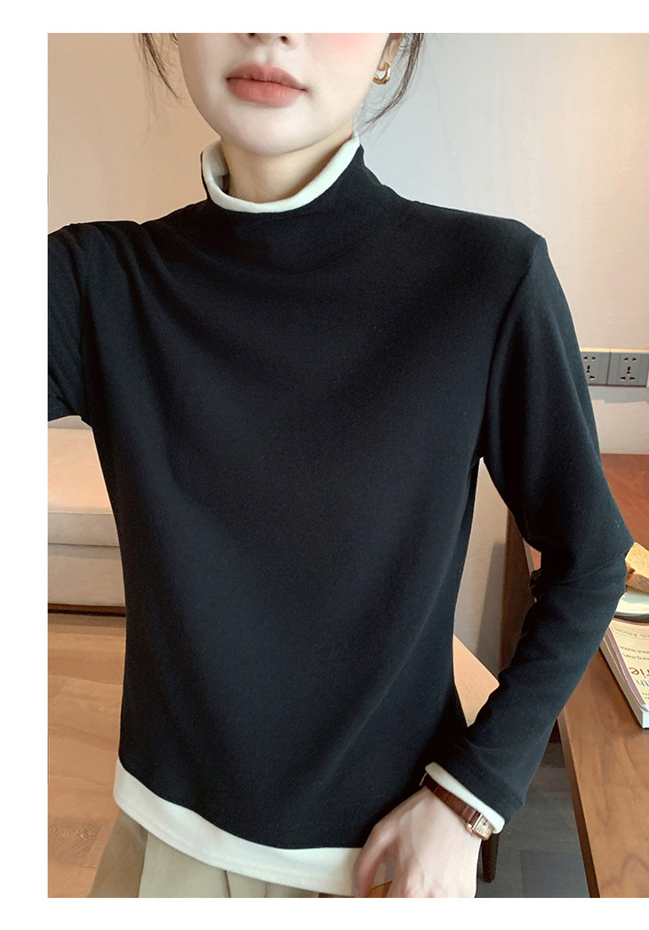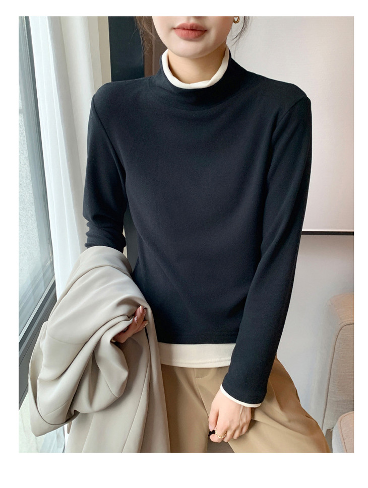 新款装假两件上衣长袖t恤女打底衫叠穿拼接撞色高领内搭