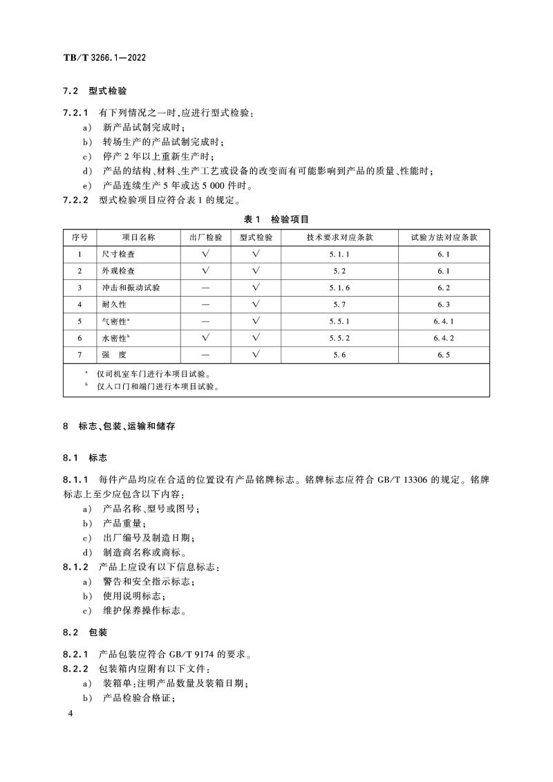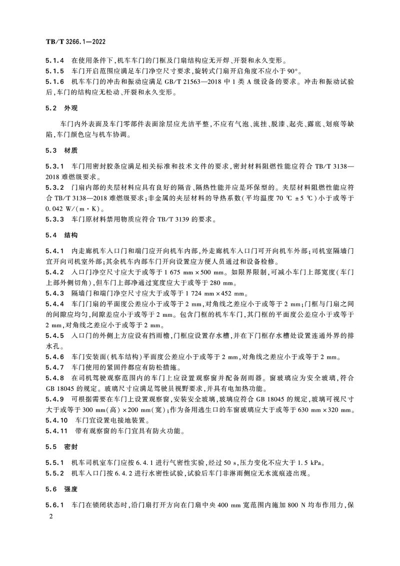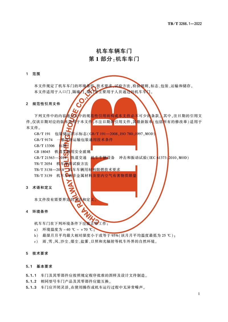本标准为国家铁路局发布的铁道行业标准,技术标准2022年第2批(共5项标准),国铁科法﹝2022 〕7号,铁标名称:机车车辆车门 第1部分:机车车门 (TB/T3266.1-2022)是机车车辆车门的系列标准之一,代替TB/T3266-2011。