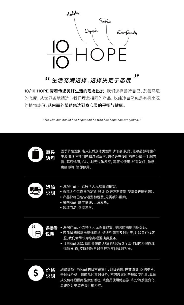 10/10 HOPE 将“健康”、“天然”、“正能量”、“环保”为理念的小众轻奢品牌带入中国,引领小众、高品质的乐活新方式。