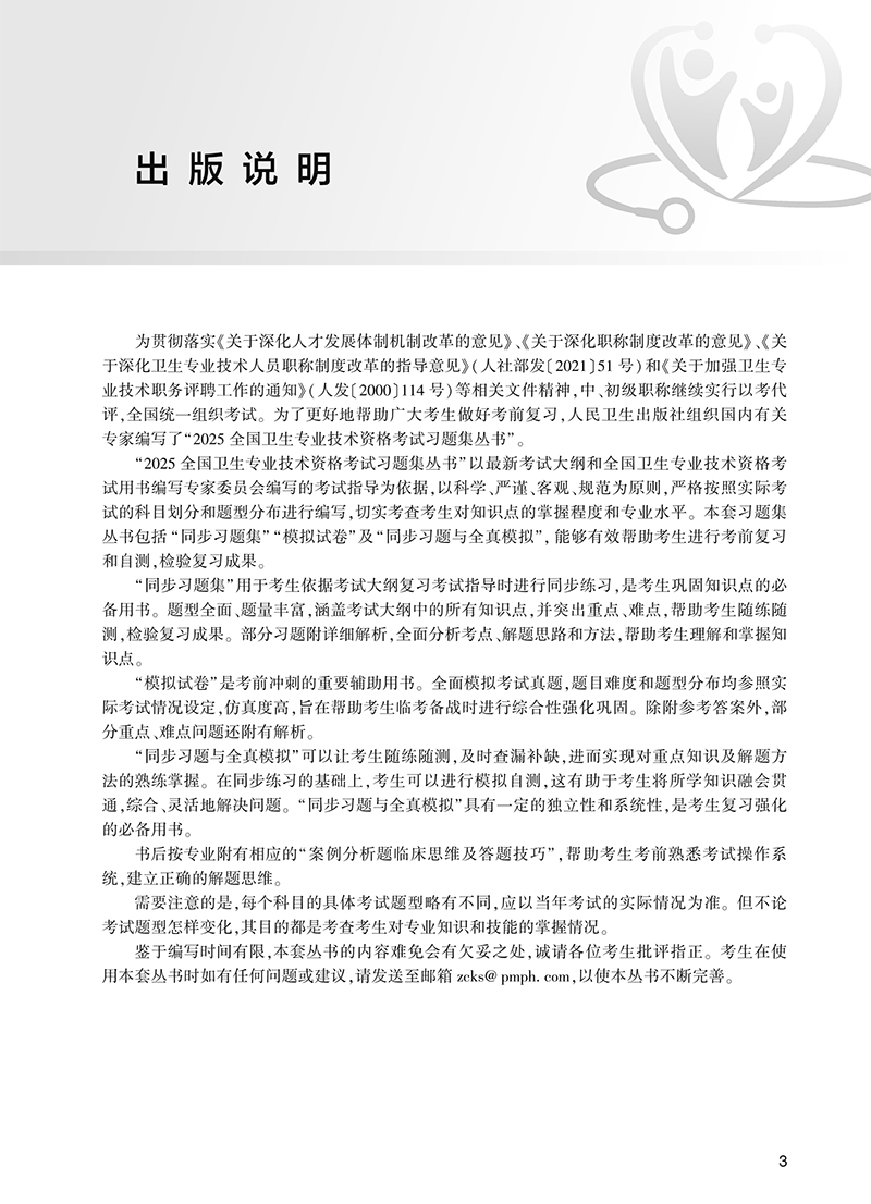 “全国卫生专业技术资格考试习题集丛书”以最新考试大纲和全国卫生专业技术资格考试用书编写专家委员会编写的考试指导为依据,编写工作遵循科学、严谨、客观、规范的原则,严格按照实际考试的科目划分和题型分布进行编写,切实考查考生对知识点的掌握程度和专业水平。本套习题集丛书包括《同步习题与全真模拟》《同步习题集》《模拟试卷》,能够有效帮助考生考前复习、自测和反馈学习成果。《同步习题与全真模拟》按考试指导的章节编写,题型全面,题量丰富,涵盖考试大纲的所有知识点,突出重点、难点。附有模拟试卷,方便考生综合检测。