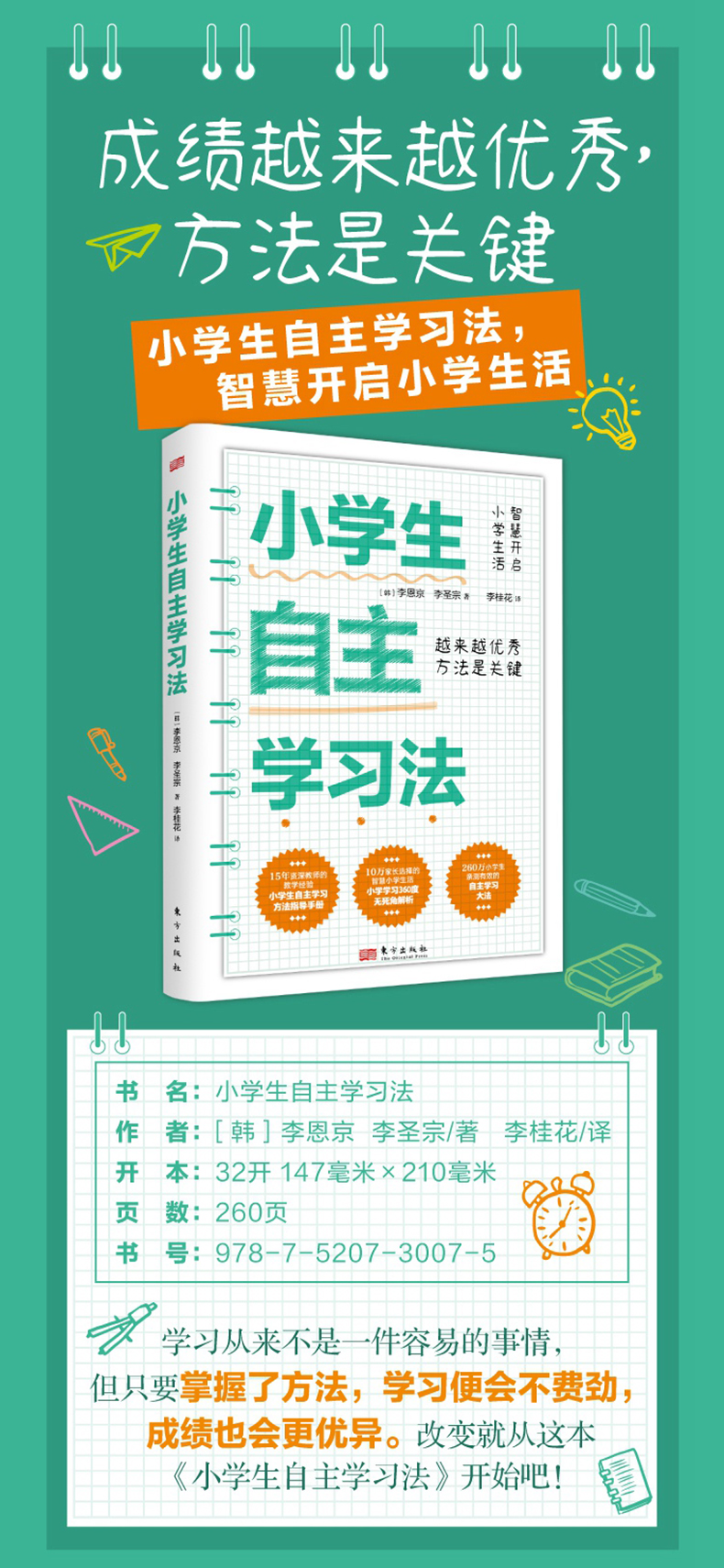 1.越来越优秀,方法是关键!会自主学习的孩子成绩才会优异。这本书是你不能错过的引导孩子进行自主学习的宝典,帮助你培养一个会学习、爱学习的孩子。 2.260万小学生亲测有效的自主学习方法和解决方案,实践价值高、持续性强,最终帮助孩子自我主导学习,解放焦虑的父母。 3.覆盖不同科目、不同年级、不同水平的学习方法,一手掌握小学阶段的各科学习法,全方位引导孩子自主学习。 4.兼顾小学生活习惯的养成,诸如饮食习惯、睡眠习惯、运动休息、专注力、时间规划能力、电子产品使用方法等,都将在书中一一解析。助力孩子健康成长。