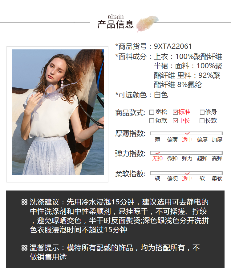 - “精致”是欧芮儿olrain品牌文化的核心,欧芮儿认为,精致的女人,不但要外在动人,更要内在迷人,内外兼修,有魅力、有气质、有内涵,自信而不自傲,优雅而不矫揉,自有万种风情而不轻浮,更不故作矜持。