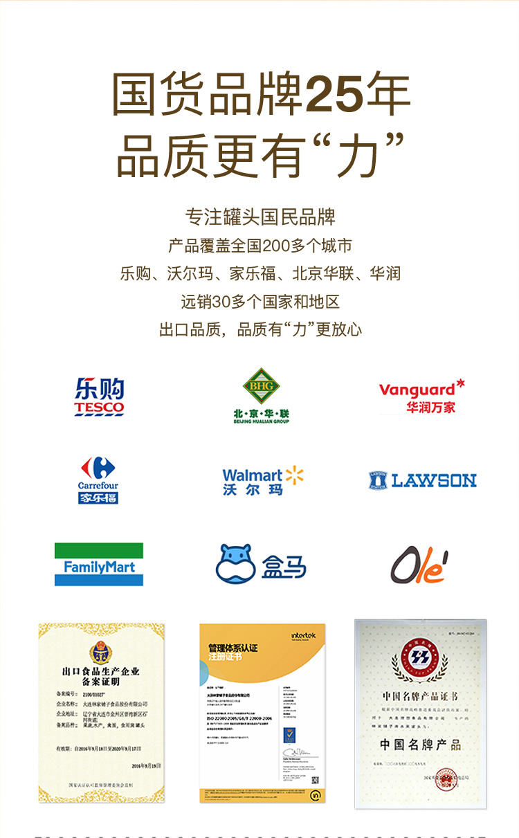 大连林家铺子食品股份有限公司成立于1996年,是中国知名及东北地区最大的罐头生产商、出口商。公司坚持“赋予产品以文化,做世界上最好的罐头”,不断最求高品质打造成年轻人也爱吃的国民零食