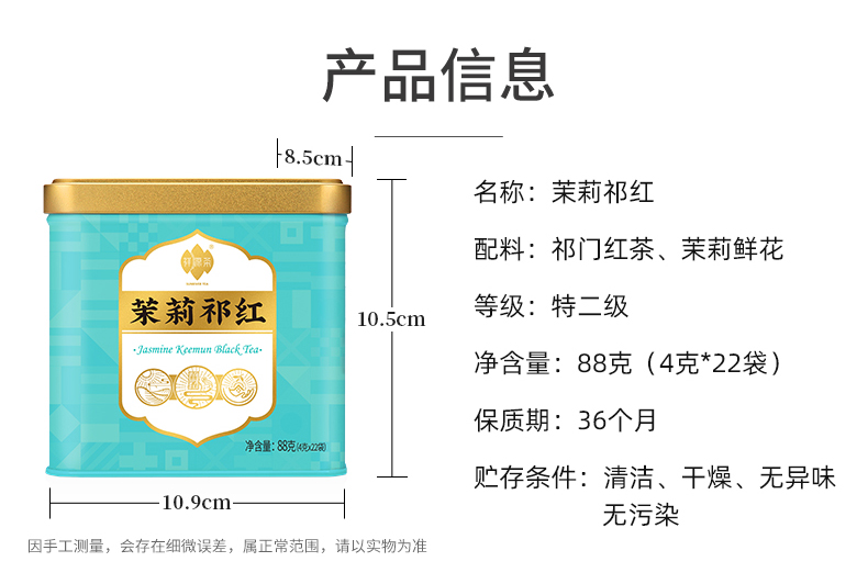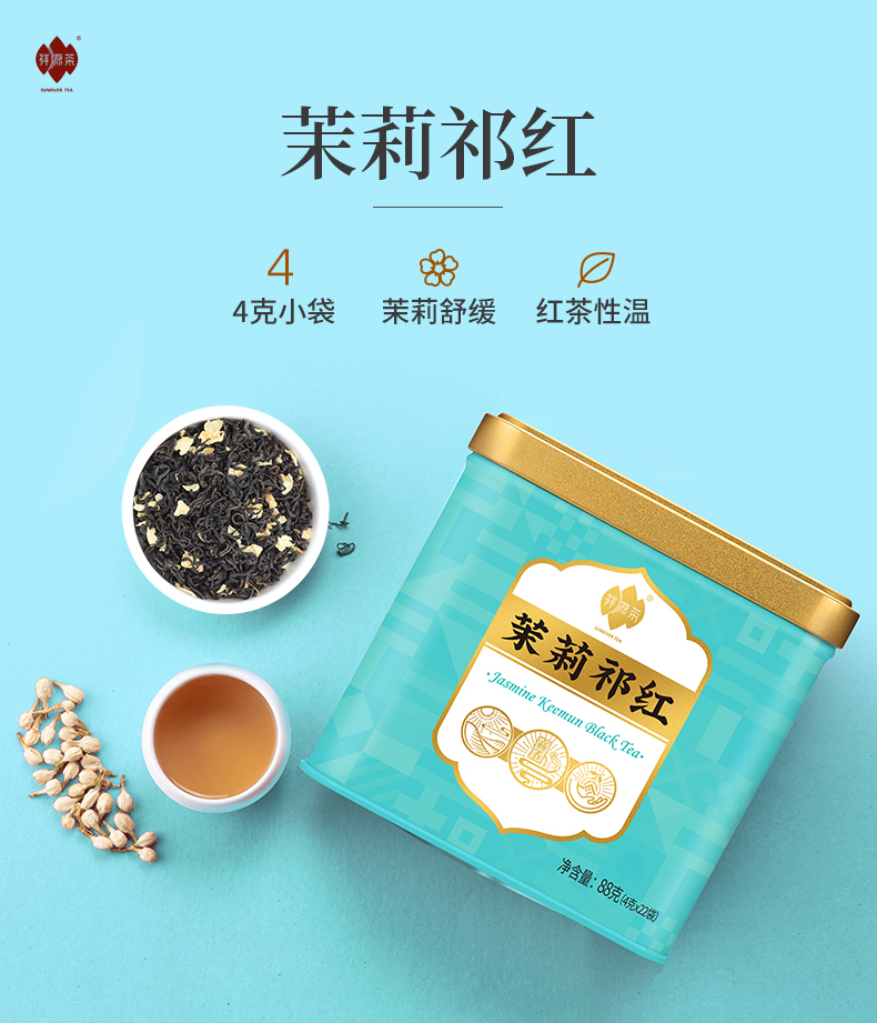 祥源茶祁红茉莉红茶特二级横县茉莉花茶祁门红茶香螺88g小袋装
