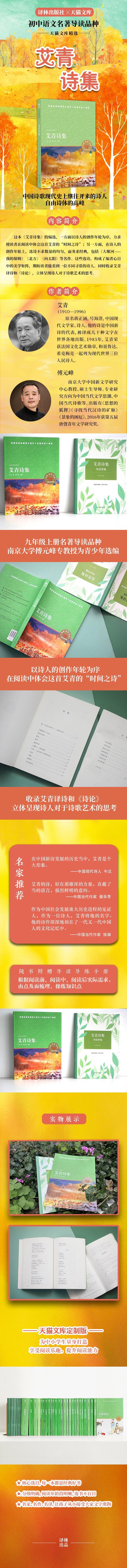 “小译林中小学阅读丛书”专为中小学生量身打造,核心选目,名家、名作、名译,引领学生“读好书,读整本书”,高附加值,实用,有趣,长知识。本版《艾青诗集》由南大文学院教授傅元峰专为青少年选编。这本诗集的编选,一方面以诗人的创作年轮为序,力求使读者在阅读中体会这首艾青的“时间之诗”,另一方面,在诗人的创作年轮上,选诗又不求数量的均匀。这些选诗,构成了编者心目中的美学矩阵,期盼读者能看到一位不同寻常的诗人。特别收录艾青译诗和《诗论》,立体呈现诗人对于诗歌艺术的思考。