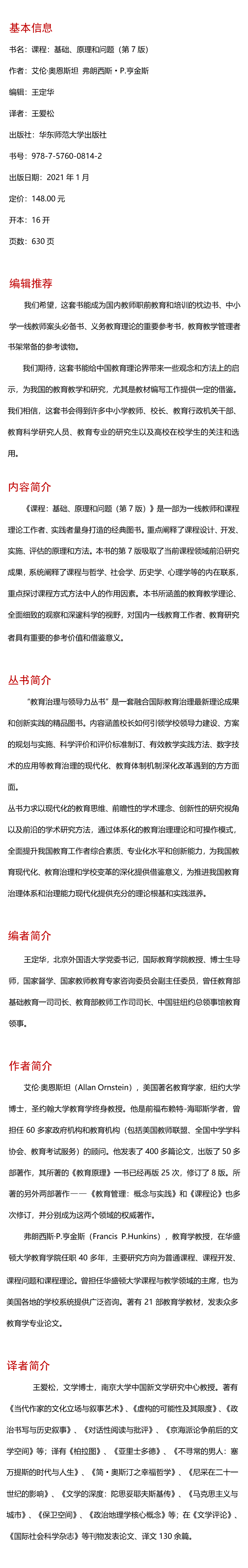 《课程:基础、原理和问题(第7版)》是一部为一线教师和课程理论工作者、实践者量身打造的经典图书。重点阐释了课程设计、开发、实施、评估的原理和方法。本书的第7版吸取了当前课程领域前沿研究成果,系统阐释了课程与哲学、社会学、历史学、心理学等的内在联系,重点探讨课程方式方法中人的作用因素。本书所涵盖的教育教学理论、全面细致的观察和深邃科学的视野,对国内一线教育工作者、教育研究者具有重要的参考价值和借鉴意义。