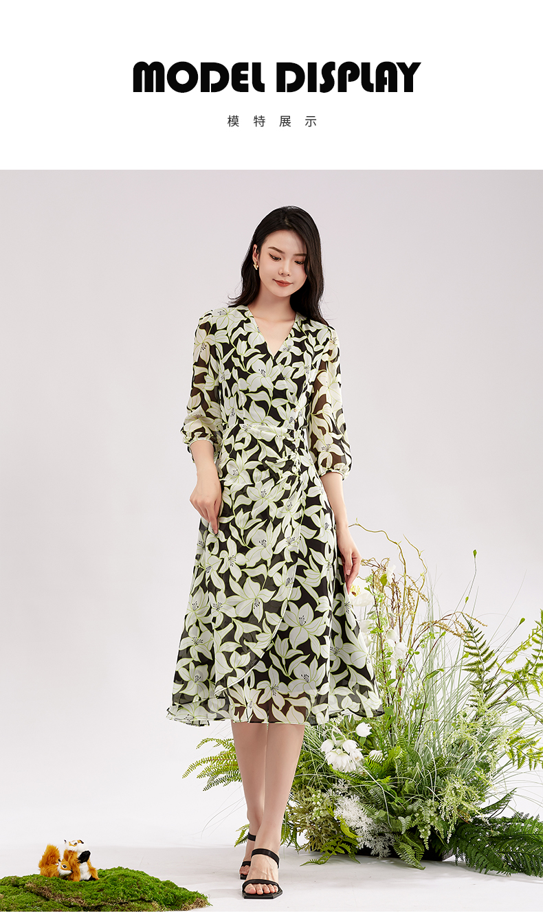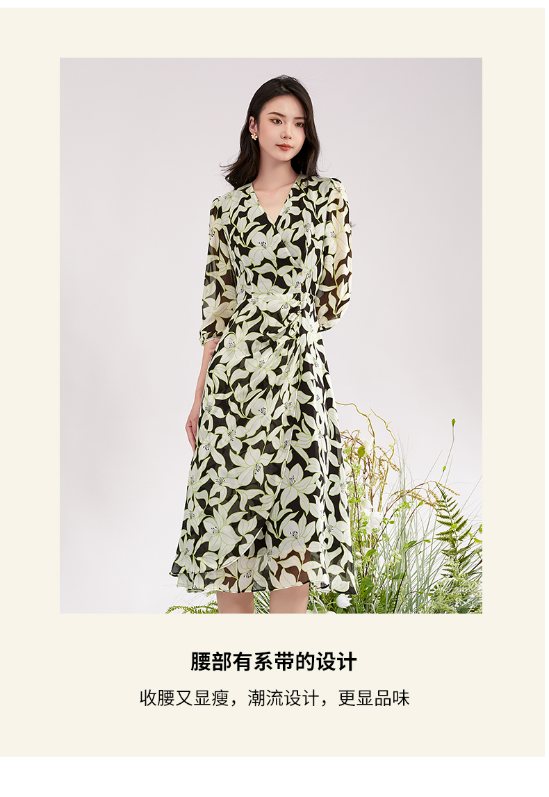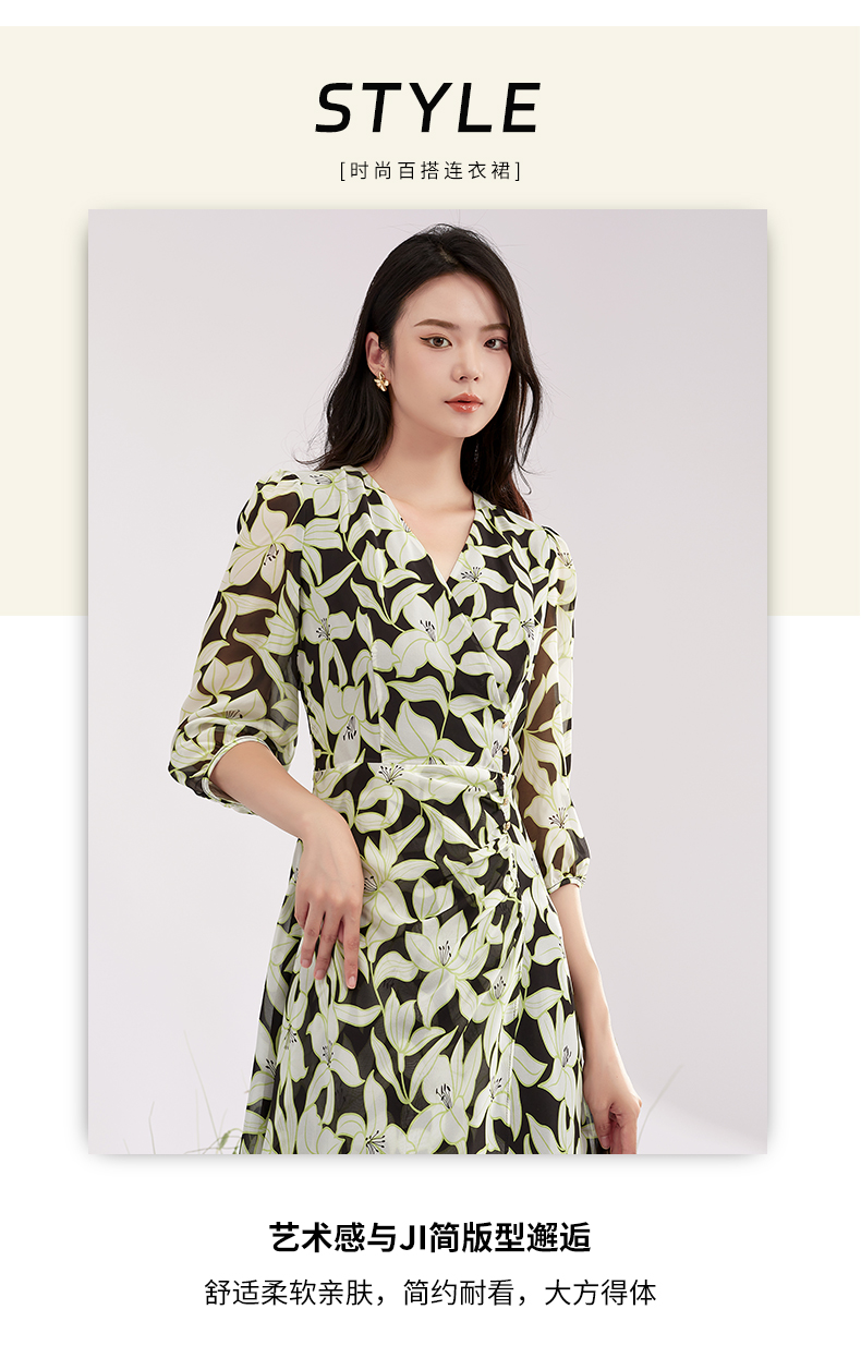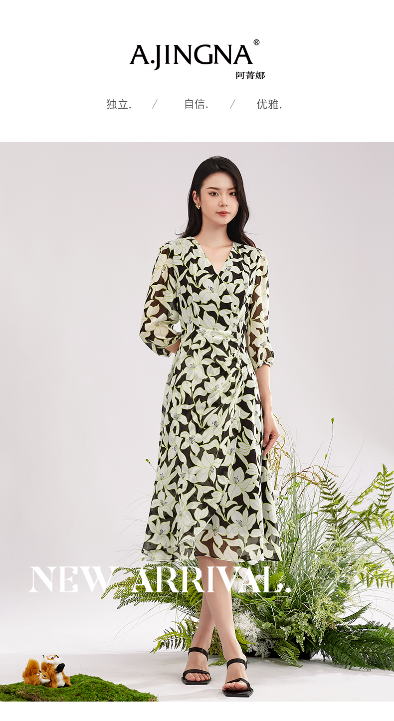 【积分兑换】阿菁娜时尚气质优雅V领桑蚕丝印花连衣裙A28X112092