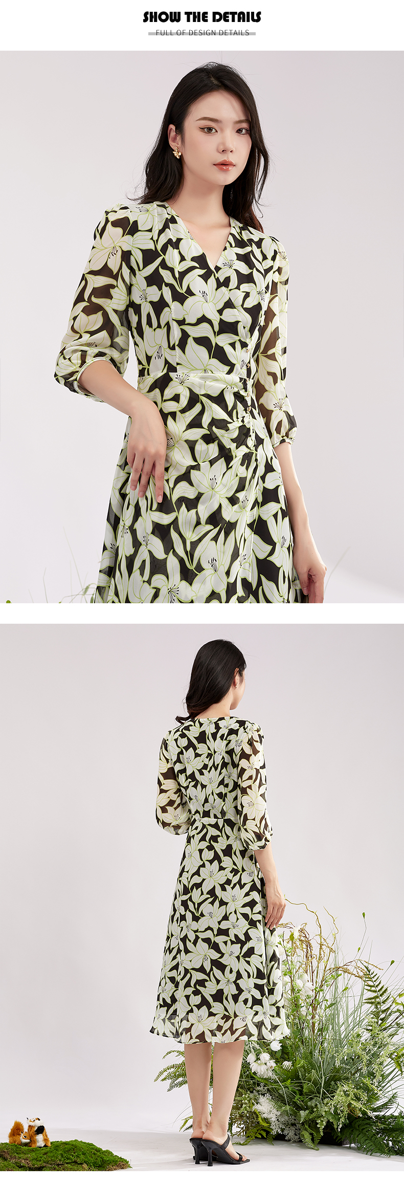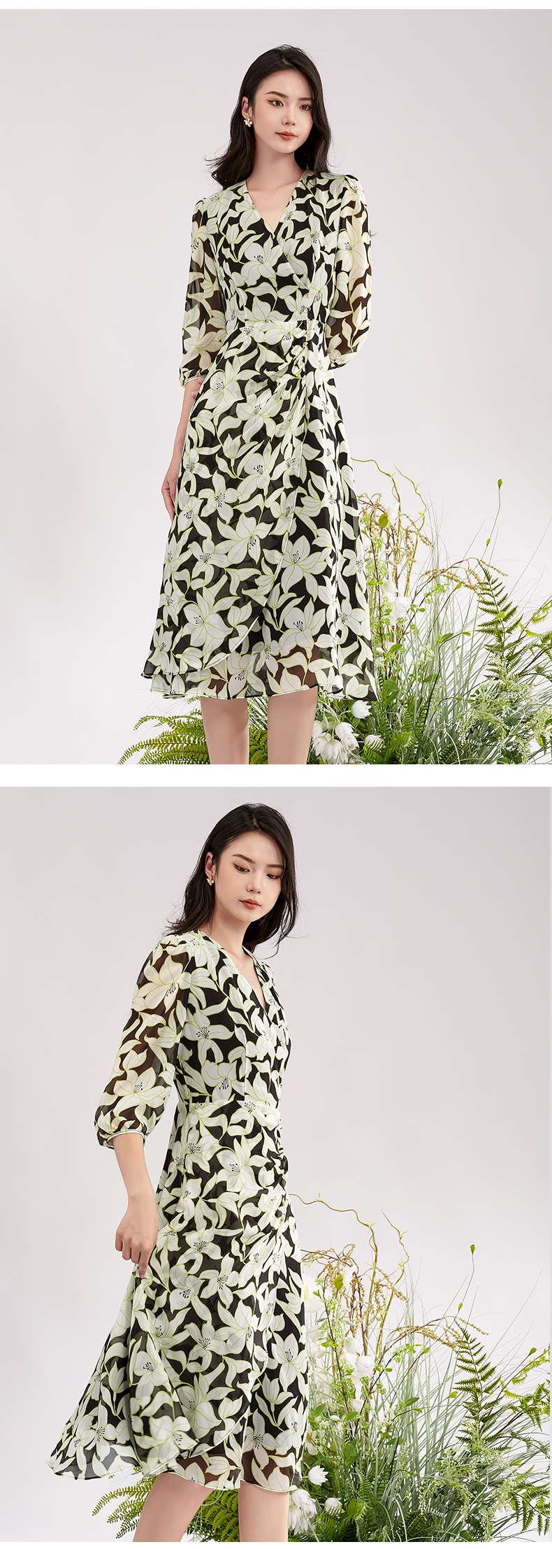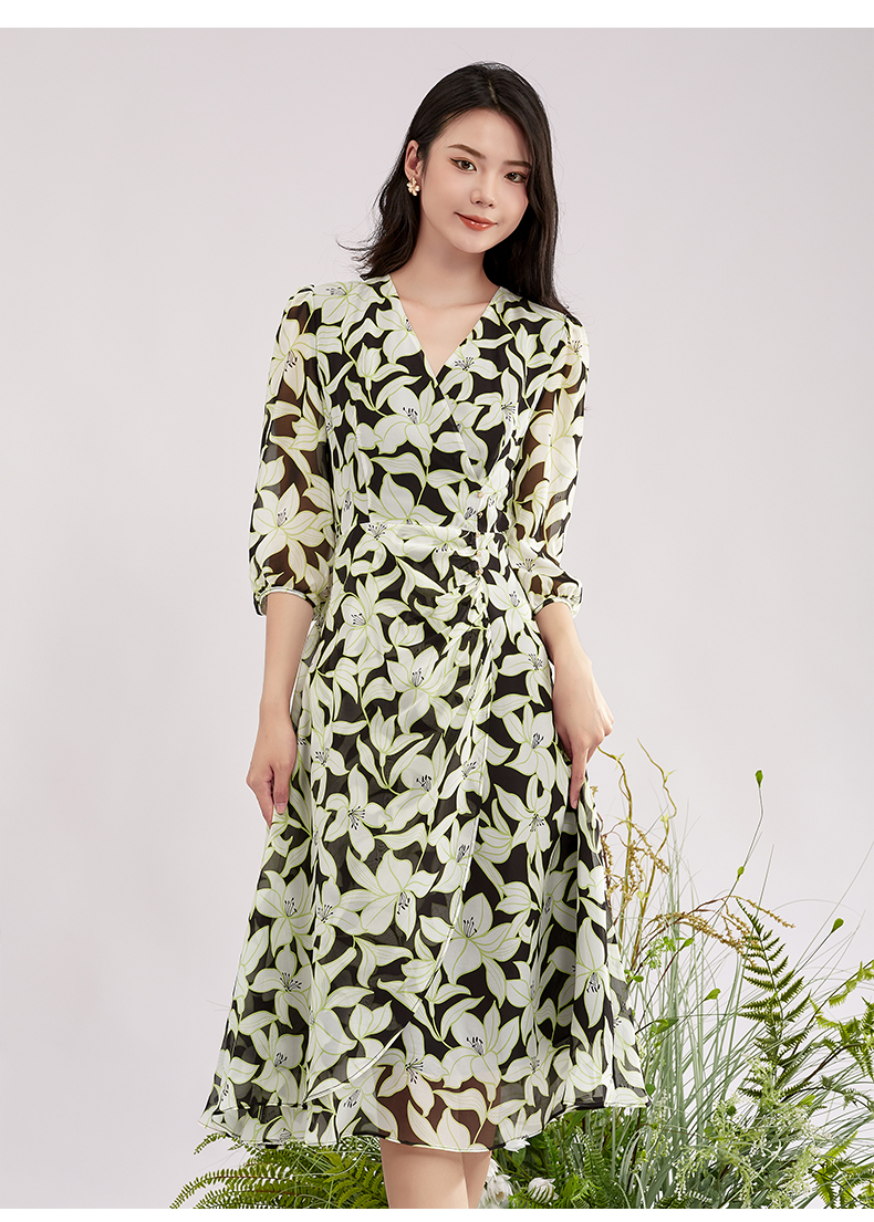 【积分兑换】阿菁娜时尚气质优雅V领桑蚕丝印花连衣裙A28X112092