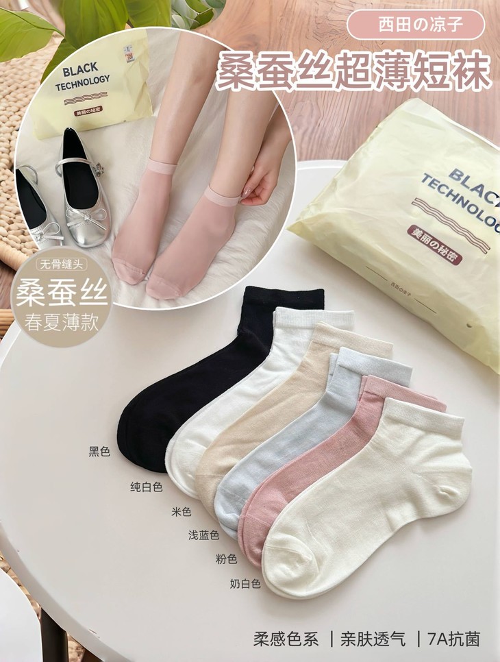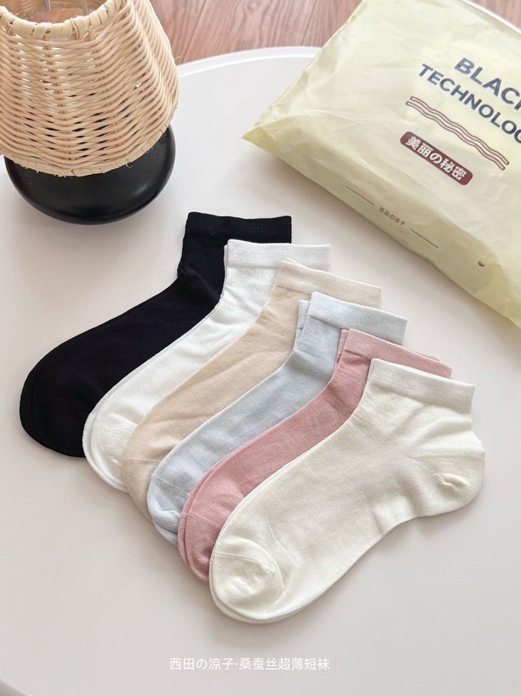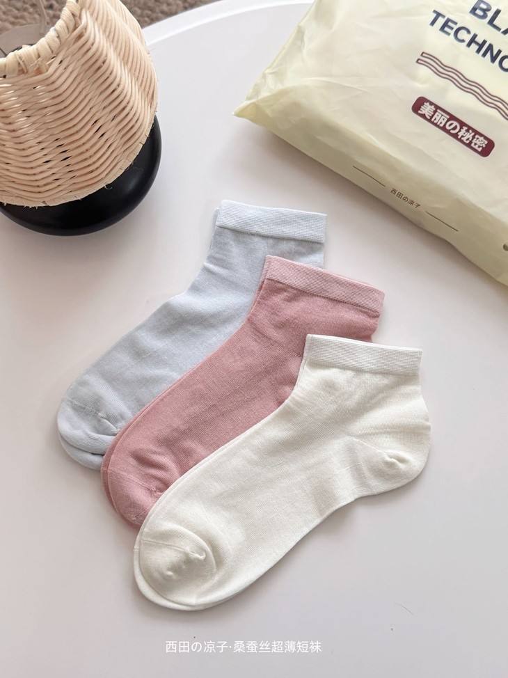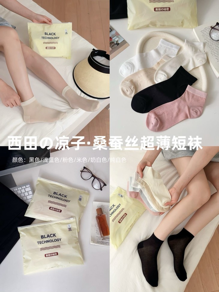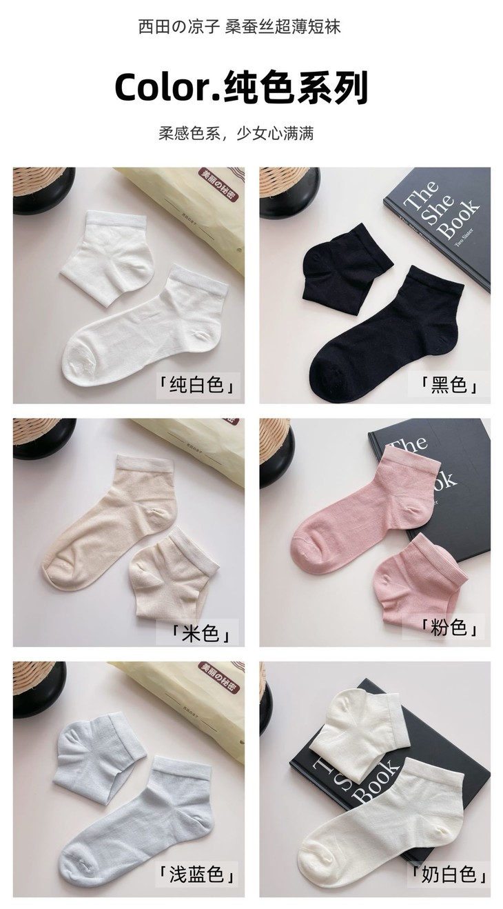 轻奢配色,多种选择,点缀夏日时尚 「西田の凉子」桑蚕丝超薄短袜 精心打造六款百搭柔感色系 每一款颜色都经过精细调配,温柔治愈不失格调 让袜子不仅是基础单品,更是点亮穿搭的小心机 自由选择,搭出你的专属风格演绎夏日轻盈魅力
