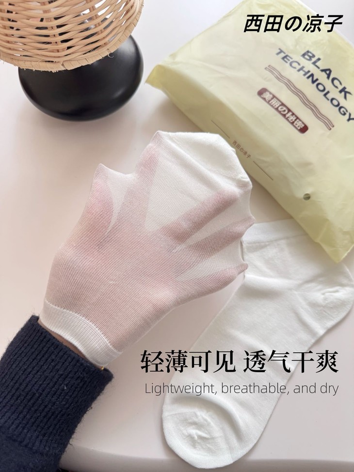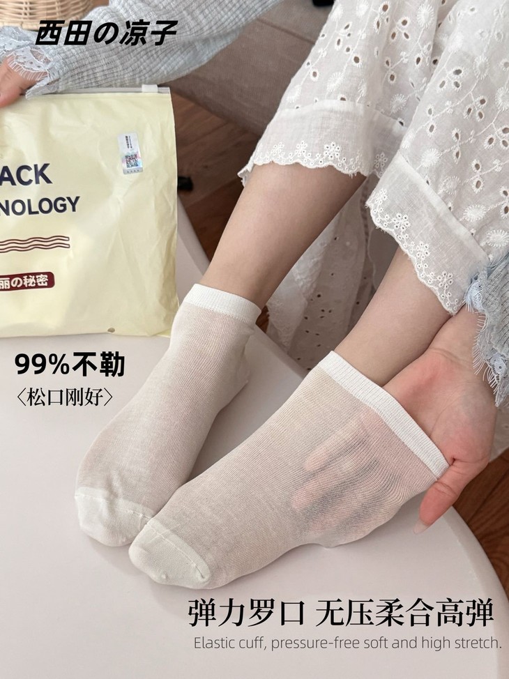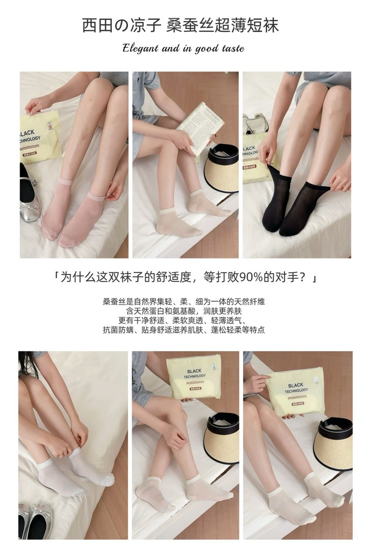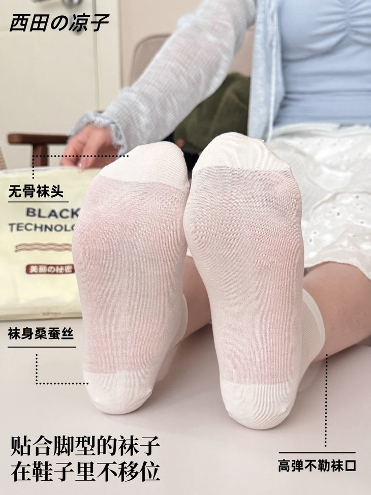 轻薄舒适透气,一秒感受“裸足自由” 「西田の凉子」桑蚕丝超薄短袜 专为追求极致舒适的人群打造 轻薄透气的面料 如同肌肤的第二层屏障 温柔贴合足部,带来无负担的穿着体验 袜子更加轻盈柔软,不仅亲肤无感 还能高效排汗透气 让双脚时刻保持干爽,不闷不腻