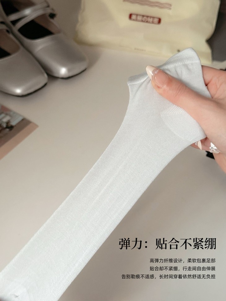 适合日系、法式、通勤等各种风格 搭配浅色鞋子更显温柔知性 轻盈透气的桑蚕丝面料 让你在炎炎夏日也能拥有裸足般的清爽体验 米色袜子就像一杯温热的拿铁 带来满满的舒适感,既能衬托肤色 又能凸显气质,时髦又高级