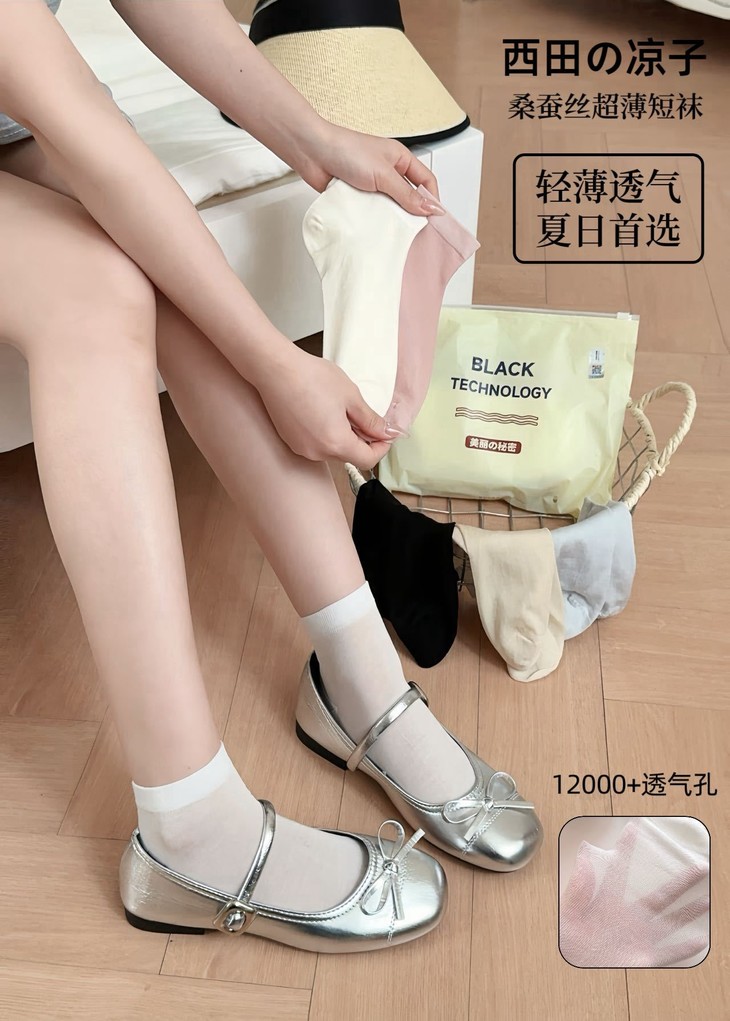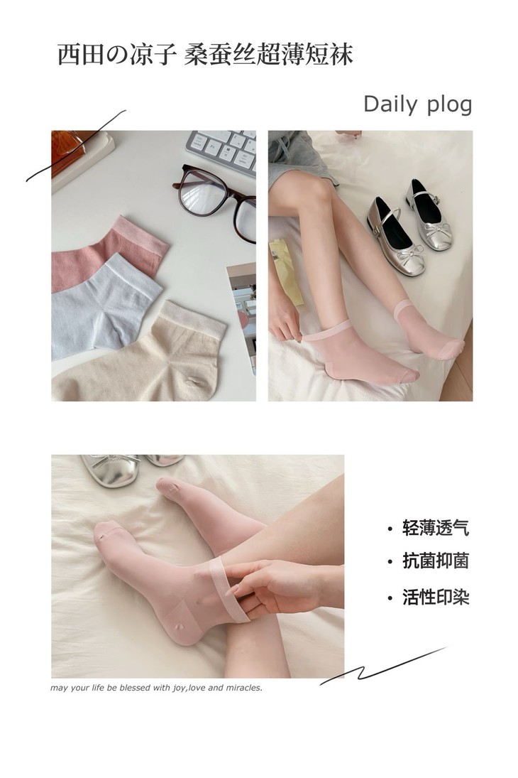 你的夏日清凉搭档,值得入手 一双好袜子不仅提升舒适度 更能改善穿鞋体验 「西田の凉子」桑蚕丝超薄短袜 轻盈透气、柔软细腻、7A抗菌 给你带来如云朵般的脚感享受 现在就入手,让双脚在这个夏天也能自由呼吸!