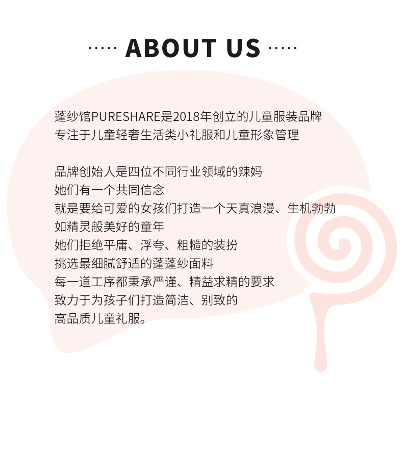 - PureShare蓬纱馆,2018年创立的儿童服装品牌,专注于儿童轻奢生活类小礼服,主张“让孩子做最独特的自己”的品牌理念,为孩子们提供时尚简洁、优雅而又不失童真的生活类礼服。