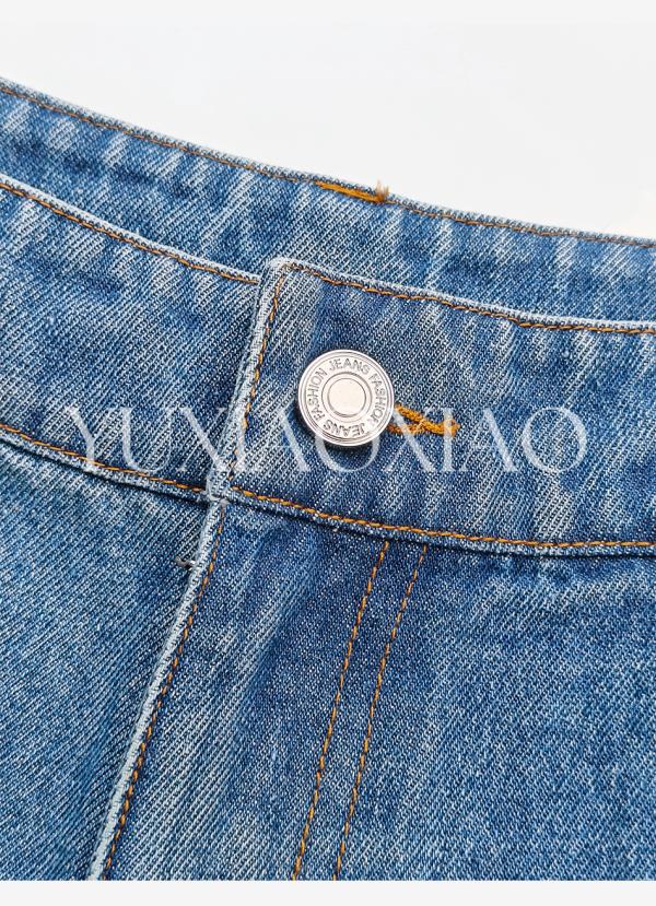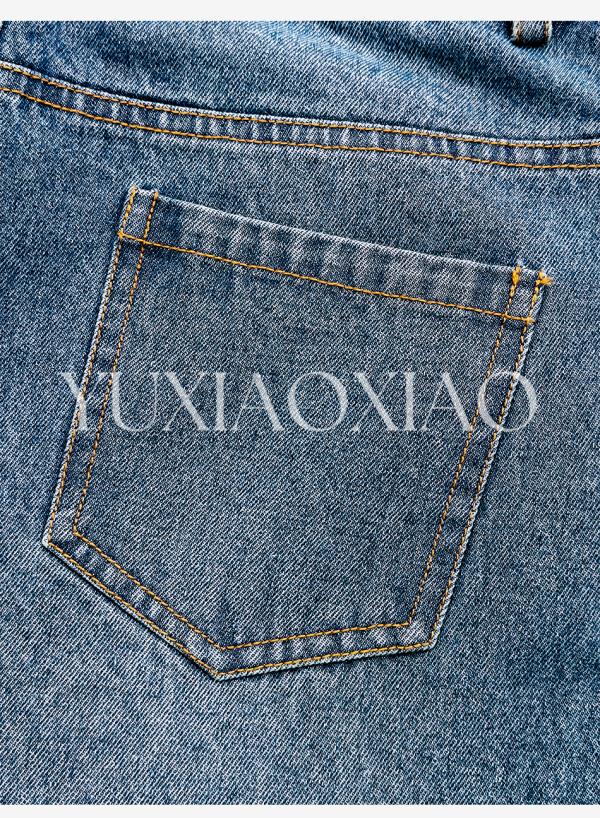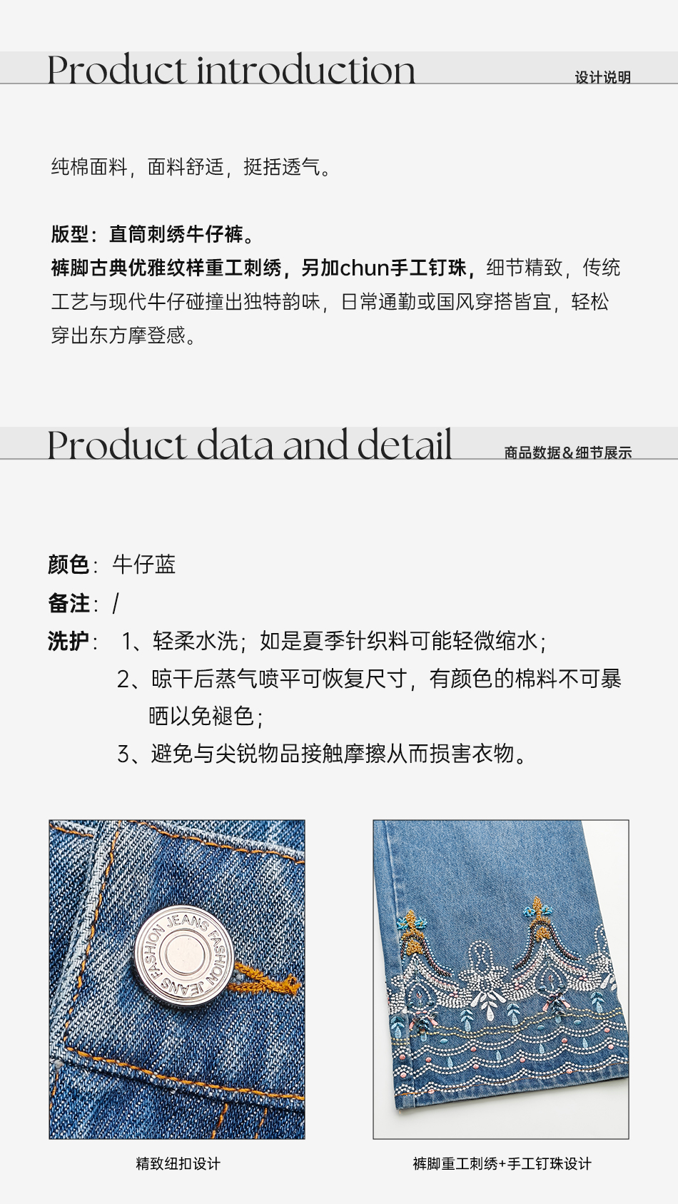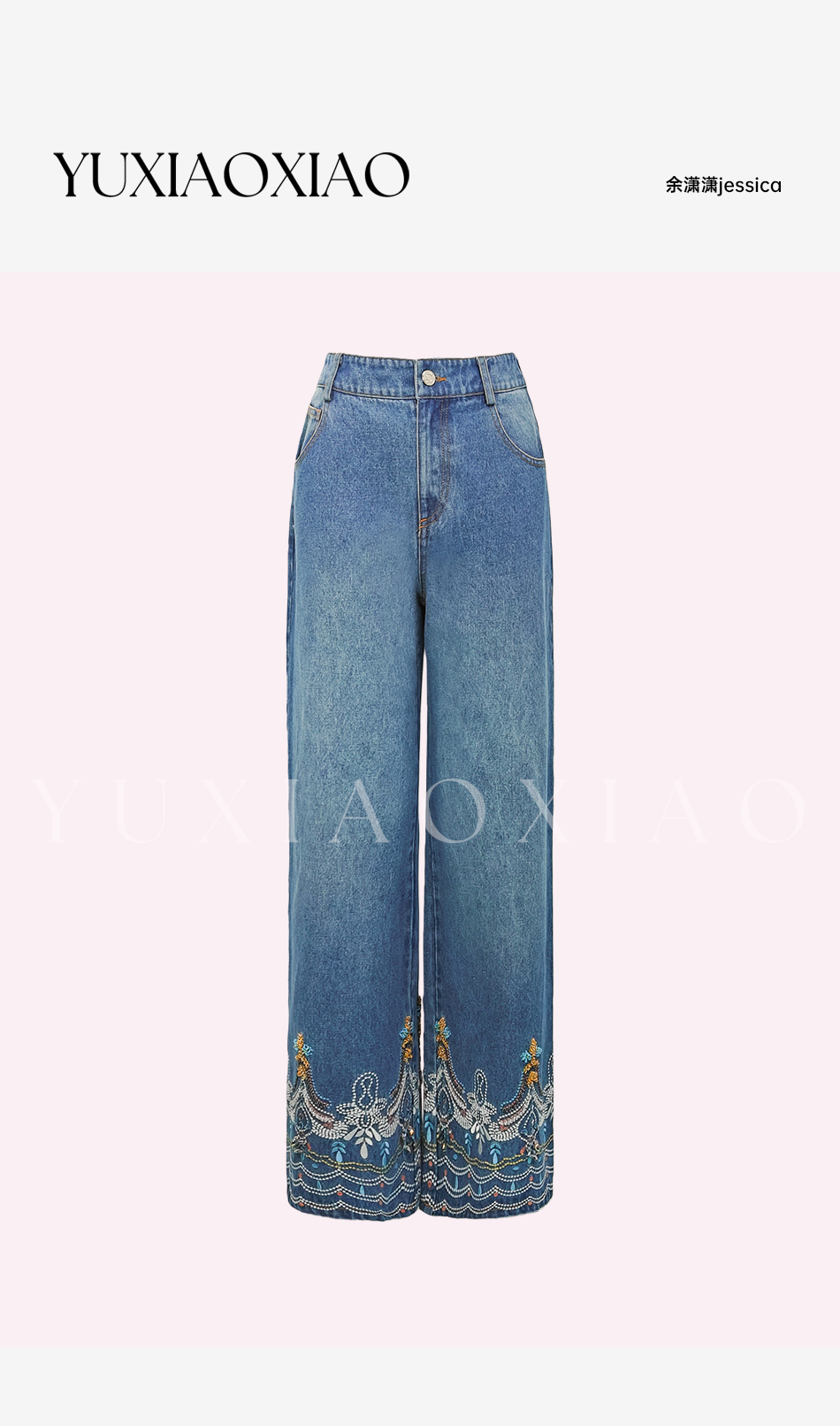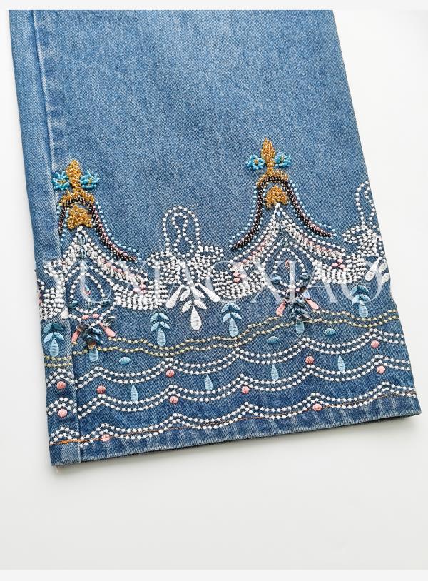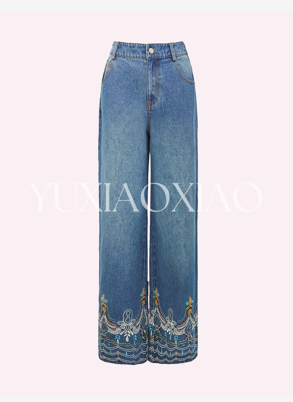 余潇潇【时光游记】时尚100棉拼手工钉珠重工刺绣直筒牛仔裤