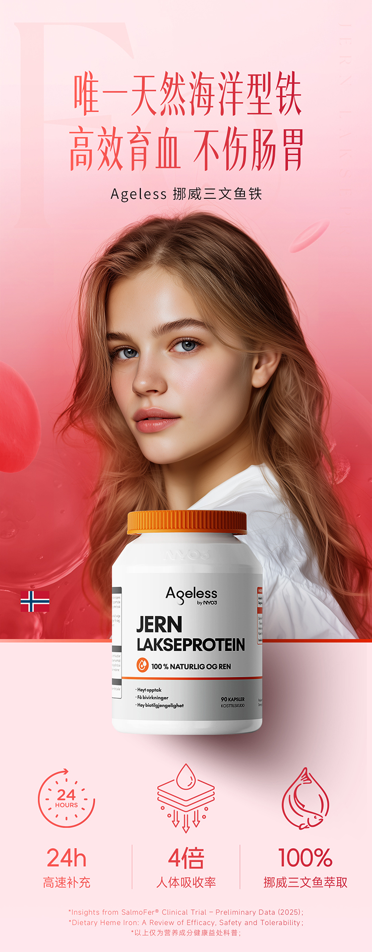 【三文鱼铁】补血补铁NYO3 ageless挪威三文鱼铁 90粒/瓶 商品图4