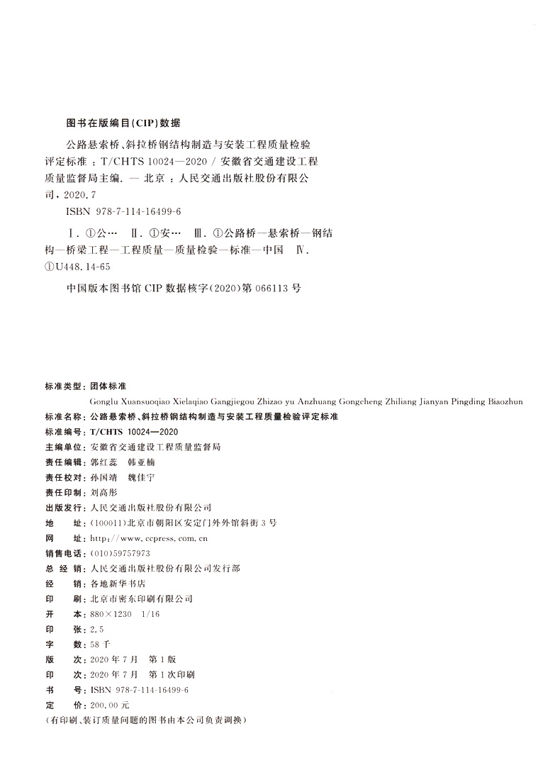 书名:公路悬索桥、斜拉桥钢结构制造与安装工程质量检验评定标准(T/CHTS 10024—2020)