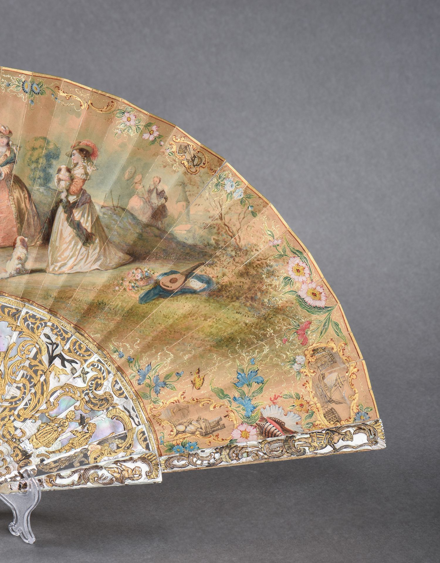 独角鹿西洋古董贵族出游主题手绘小羊皮扇面描金镂雕母贝扇骨折扇