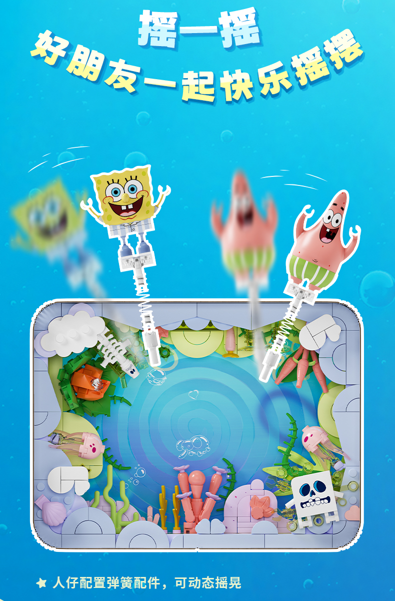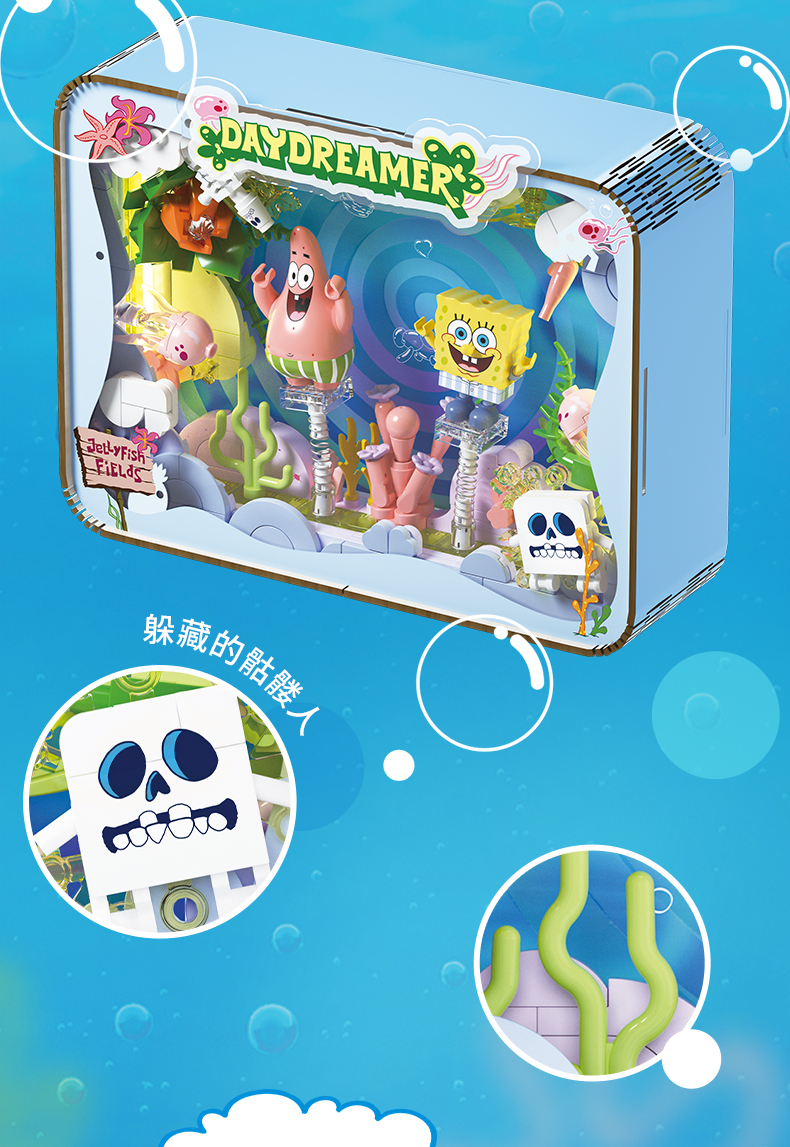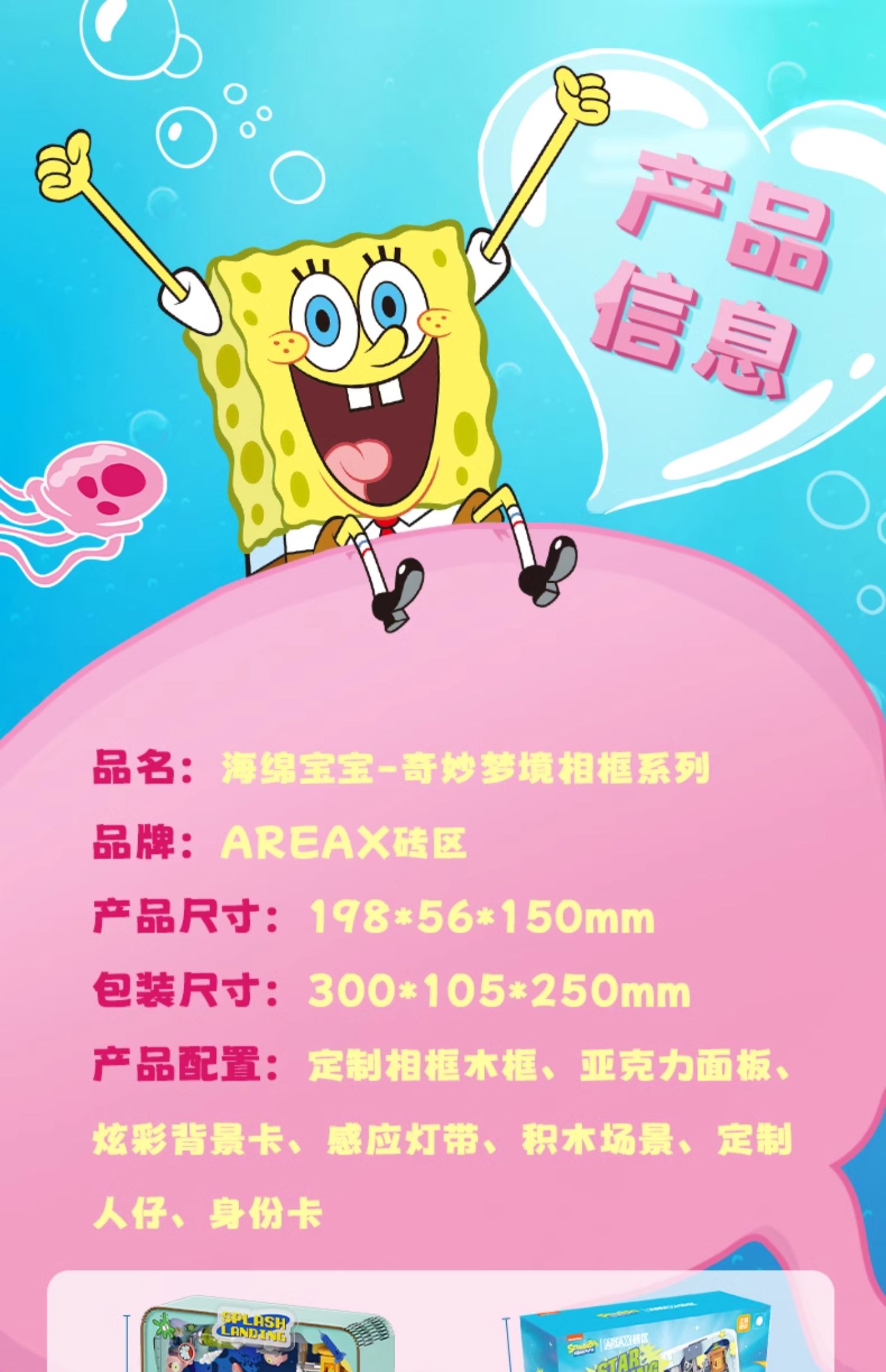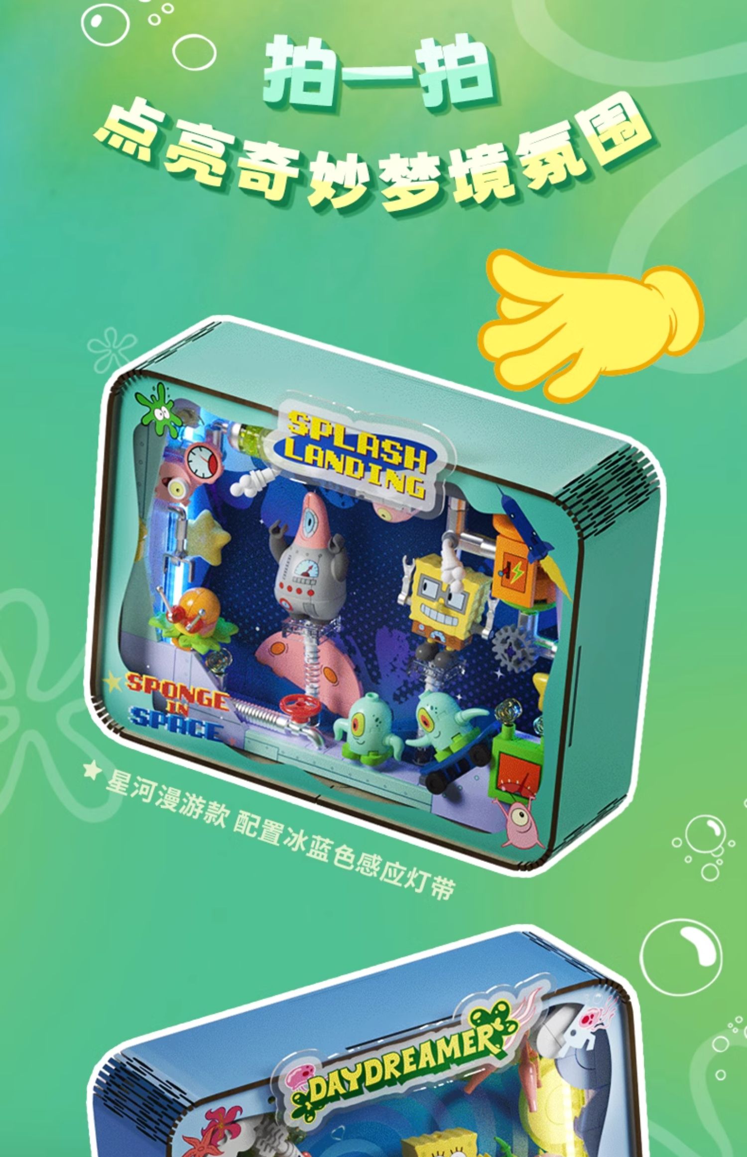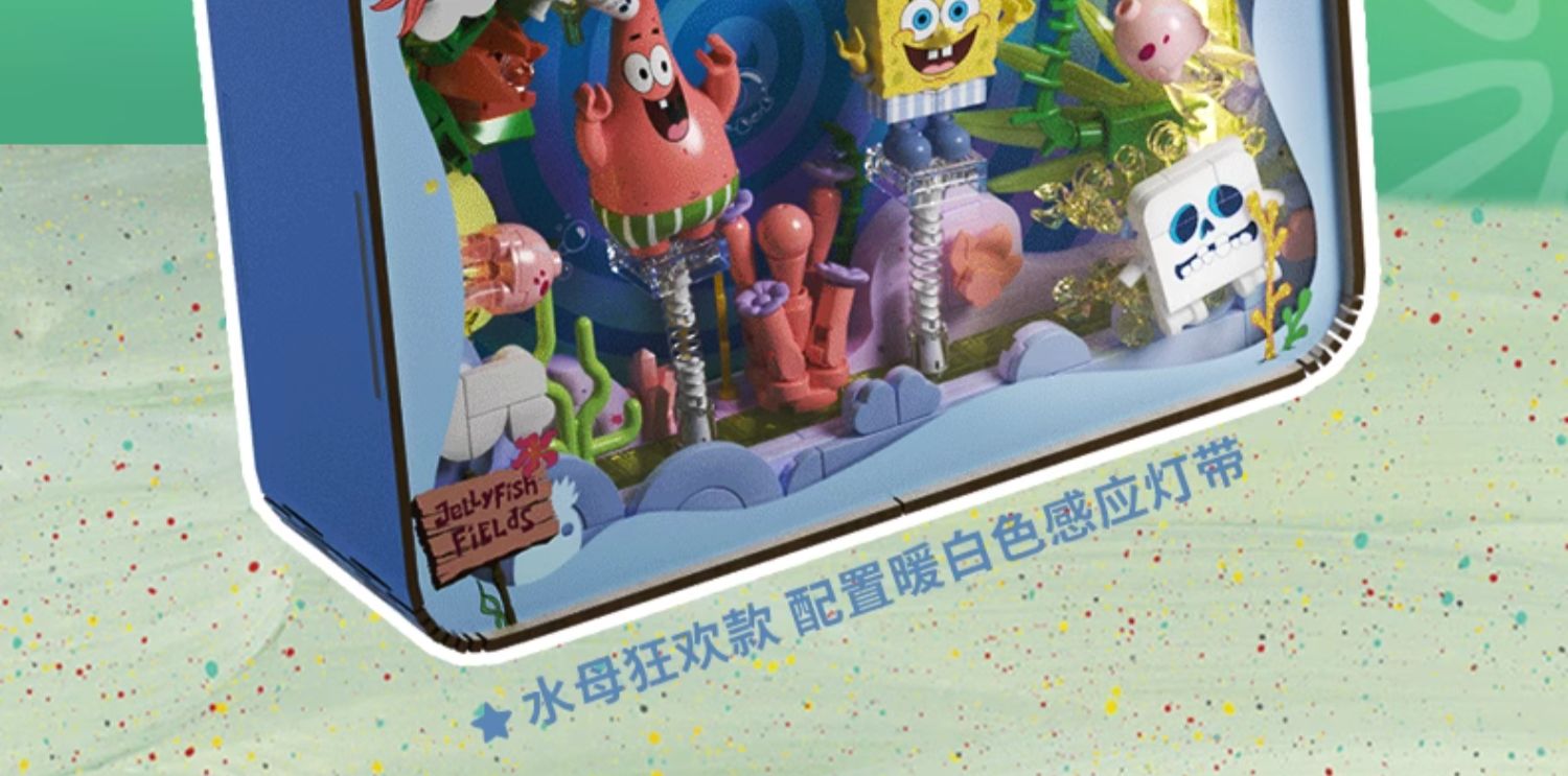 Areax砖区海绵宝宝正版授权积木 水母狂欢/星河漫游相框造型可选;✅感应灯光,拍打亮灯; ✅弹簧设计,人仔可动; ✅场景还原,木质新款