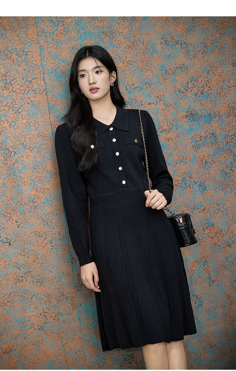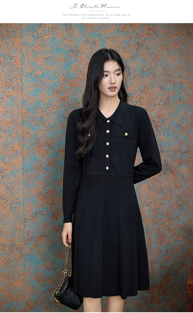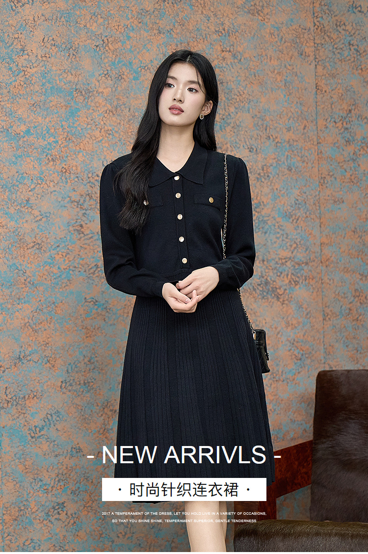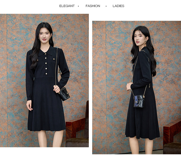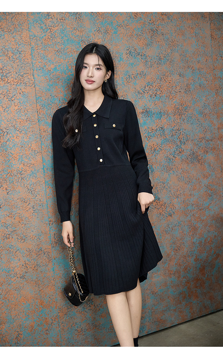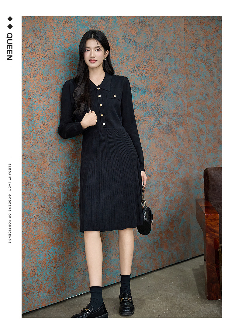 奢姿大码女装2025秋季减龄假口袋设计连衣裙胖妹妹翻领针织裙子9853891040