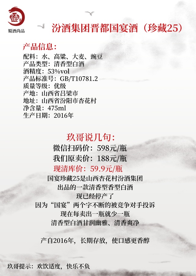 2016年出厂换代老酒,52度汾酒珍藏25 500ml