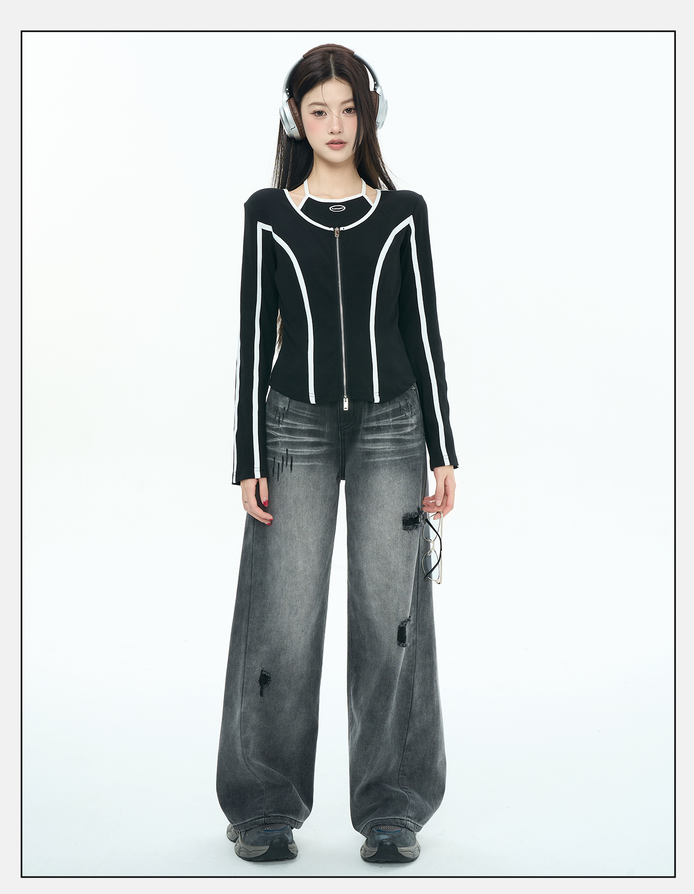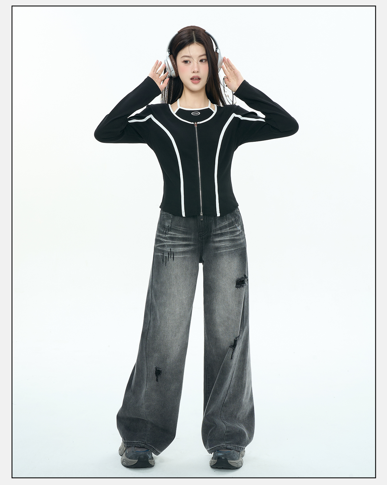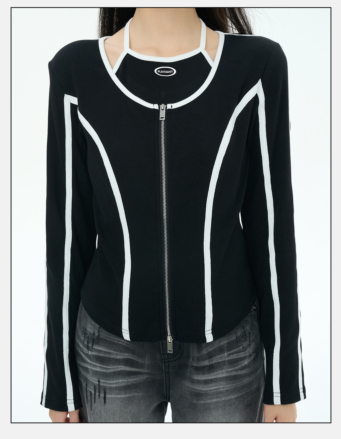 P&X设计师女装2025秋季街头风圆领短款T恤拼接825302208 黑色
