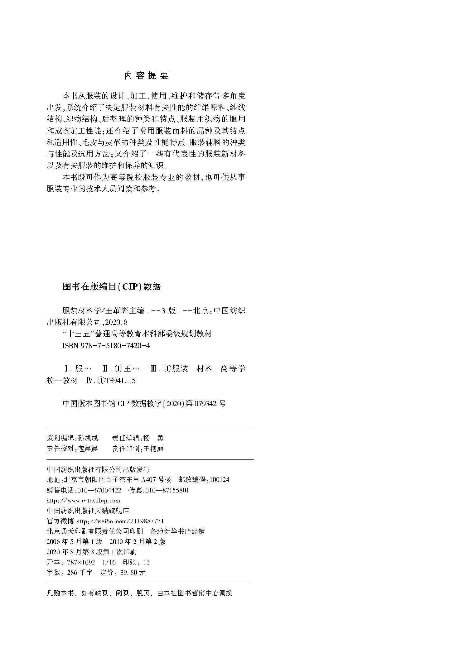 2020新版 服装材料学 第3版三版 王革辉 常见服装面料品种 服装材料学应用技术 服装衬料里料絮料性能选用方法 服装维护保养知识书