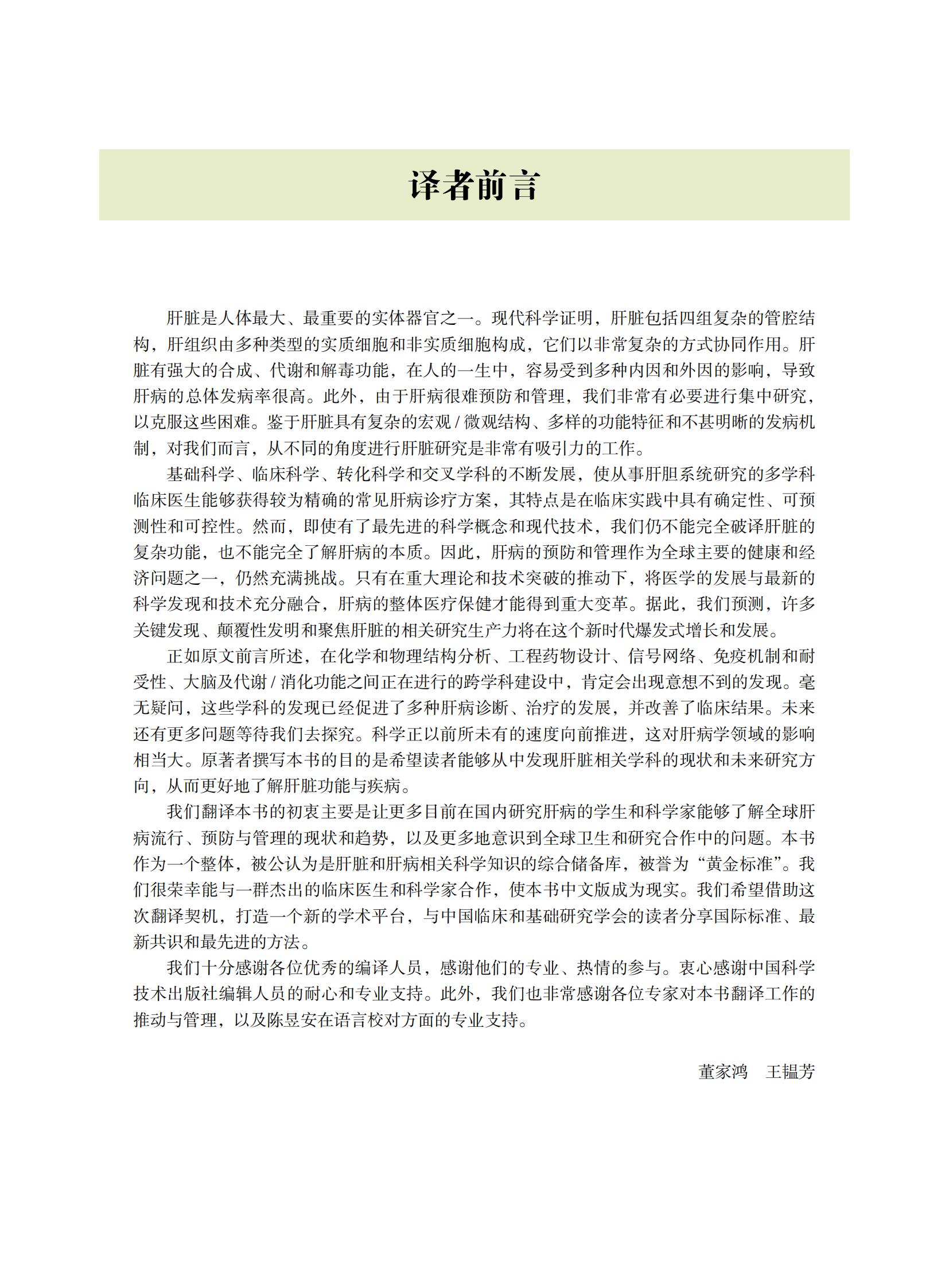 本书引进自 Wiley 出版社,是一部被誉为业内“黄金标准”的肝脏及肝病相关知识综合教科书。全书共七篇 86 章,全新第 6 版在前一版的基础上优化和更新了许多内容,同时还补充了最新基础研究和临床研究进展,内容涉及化学和物理结构分析、工程药物设计、信号网络、免疫机制和耐受性、大脑及代谢 / 消化功能之间的跨学科建设对于多种肝病的诊断、治疗及改善临床结果等方面,涵盖了多领域的专业知识,以期最大限度地为医学专业人员提供学科发展现状和未来研究方向的参考,从而更好地了解肝脏功能与疾病。此外,书中还分享了国际标准、最新共识及先进的研究方法,可作为专业医务人员有价值的案头参考书。