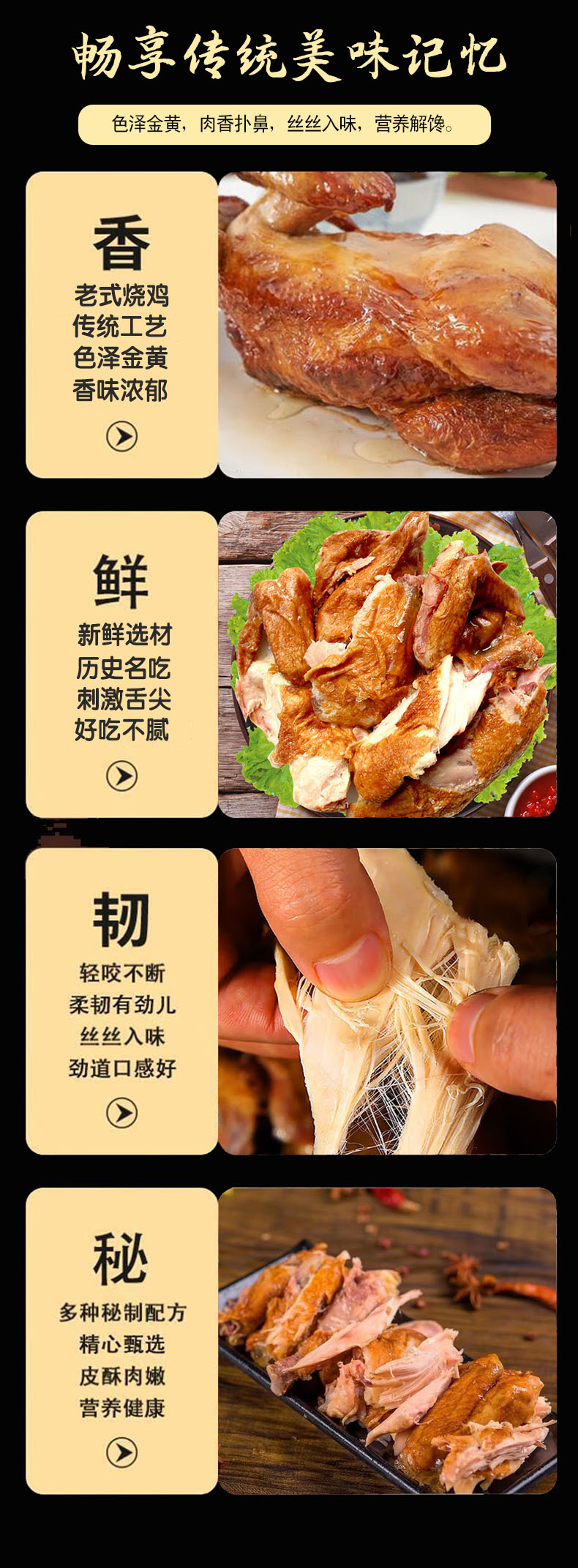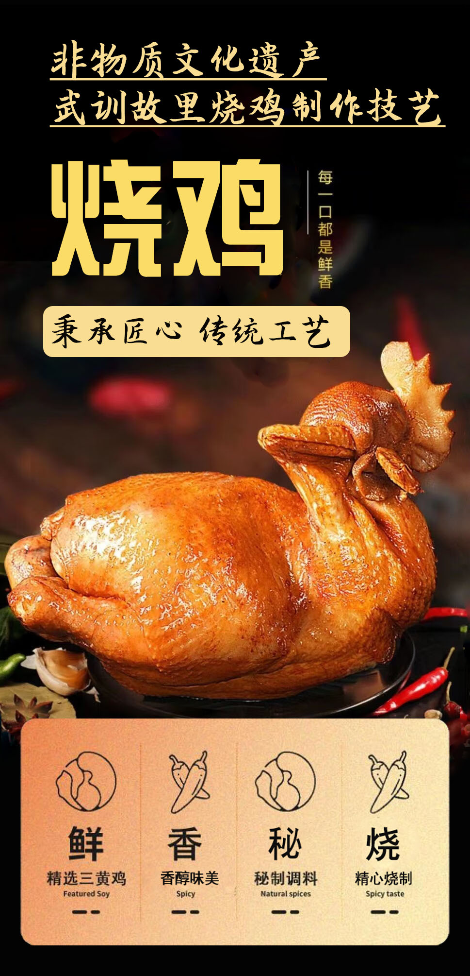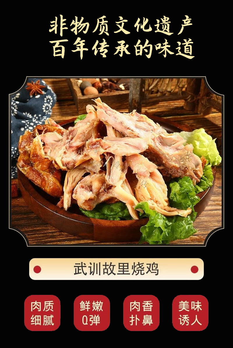 武训烧鸡,8袋组合,非遗技艺,甄选三黄鸡,二十多味香辛料腌制入味,老汤古法工艺烹饪,色泽金黄,肉香扑鼻,丝丝入味,营养解馋,开袋即食,吃法多样M