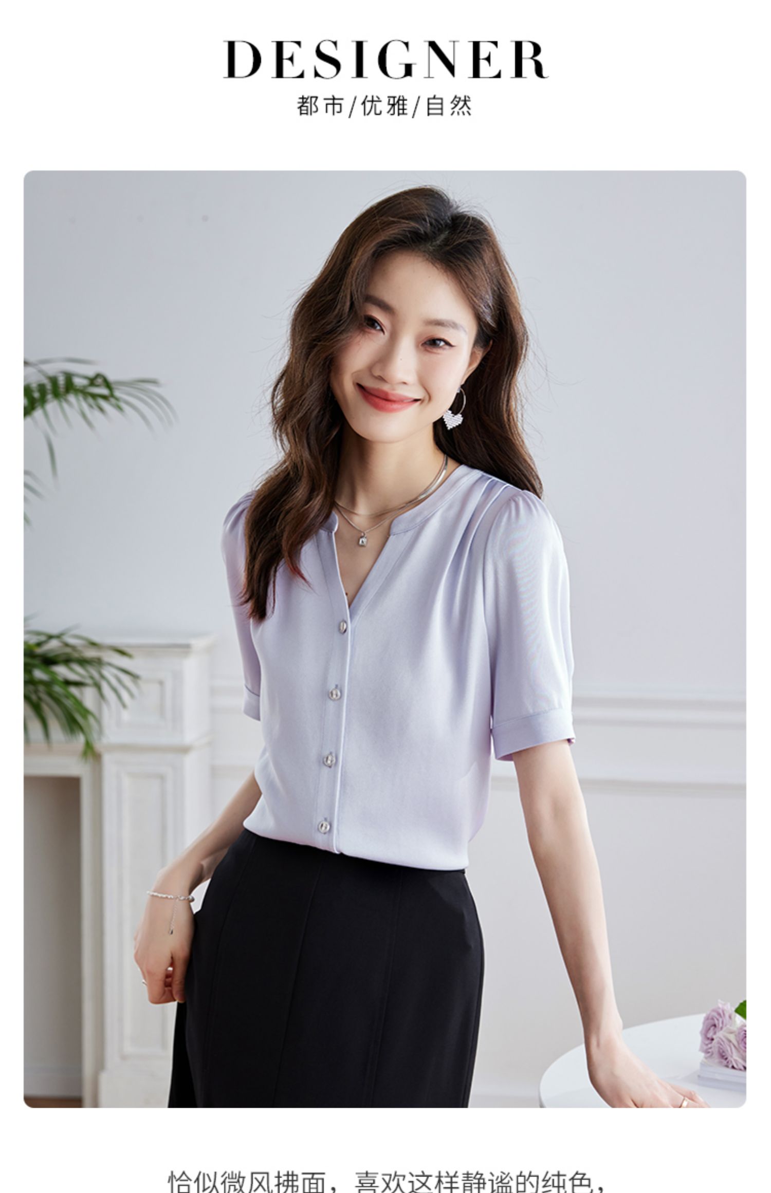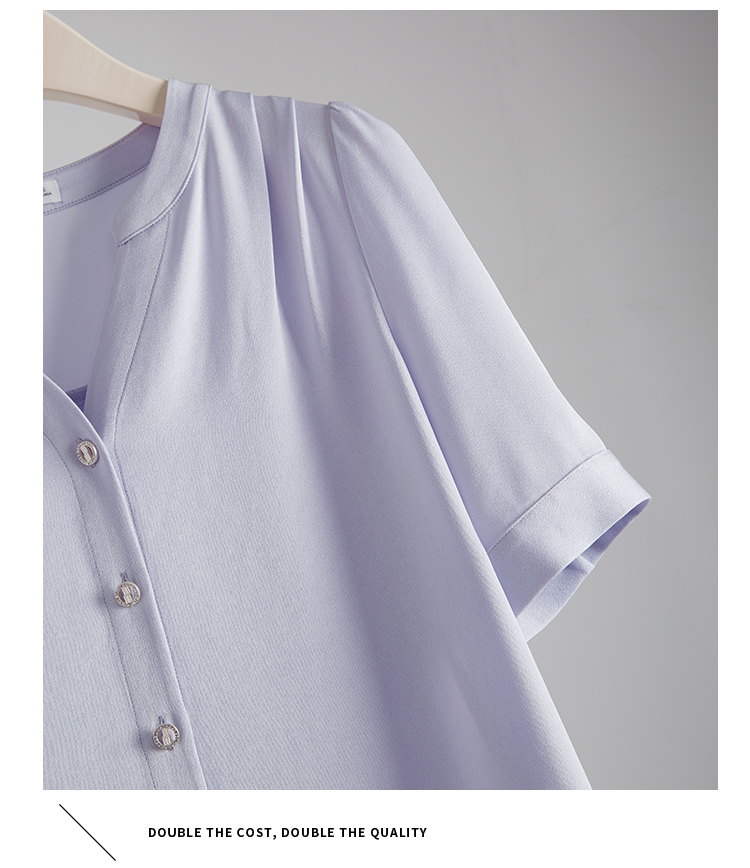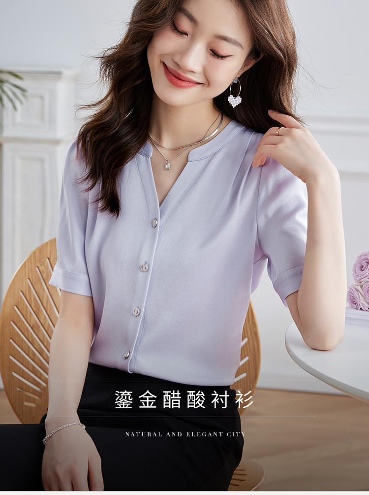 【专属特价】熙世界高端鎏金醋酸衬衫女夏2025新款通勤百搭纯色法式小v领上衣