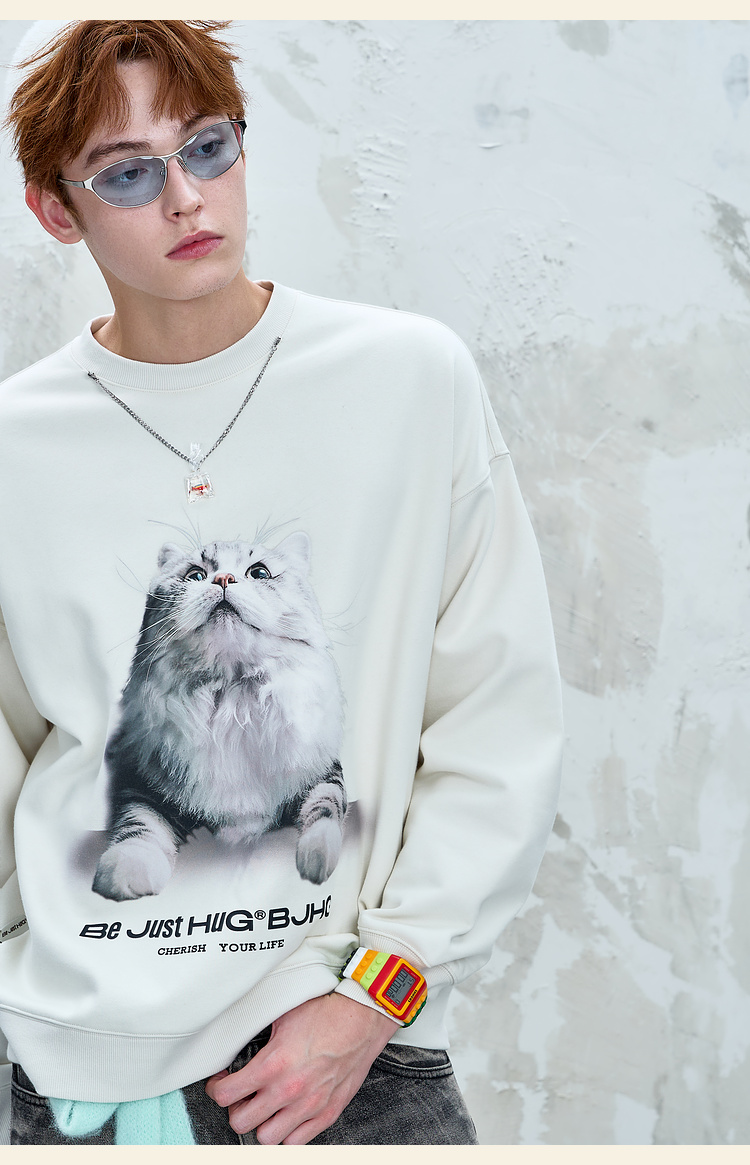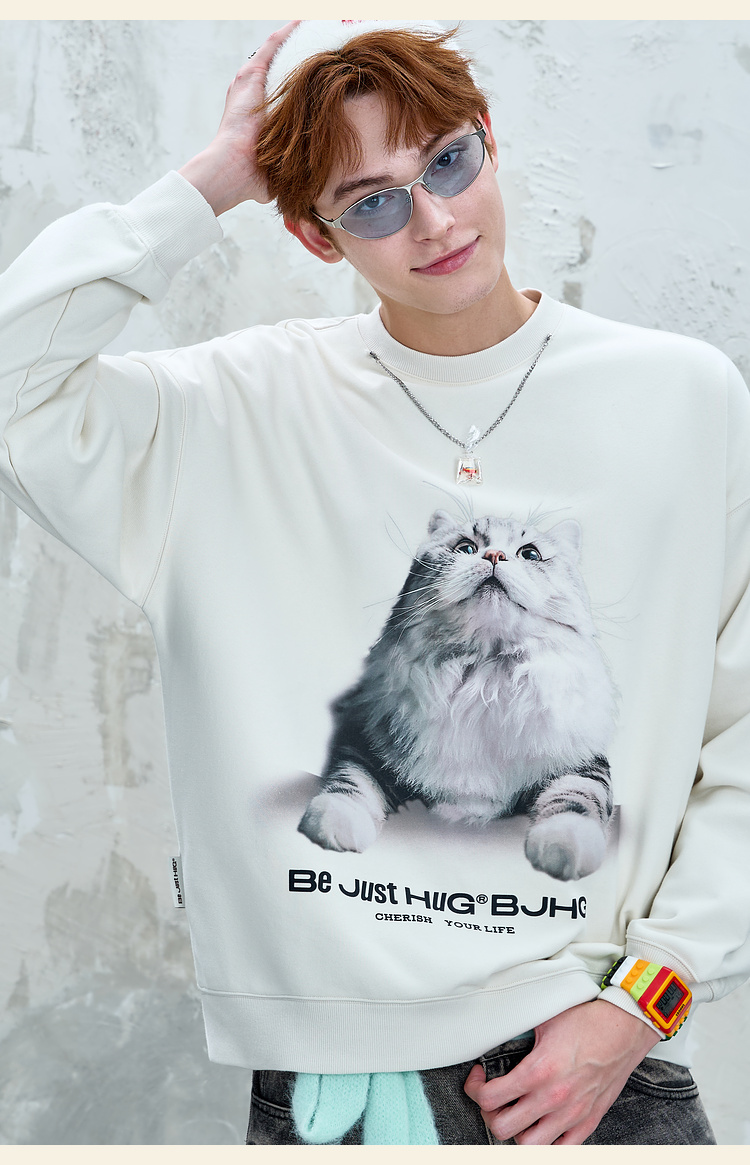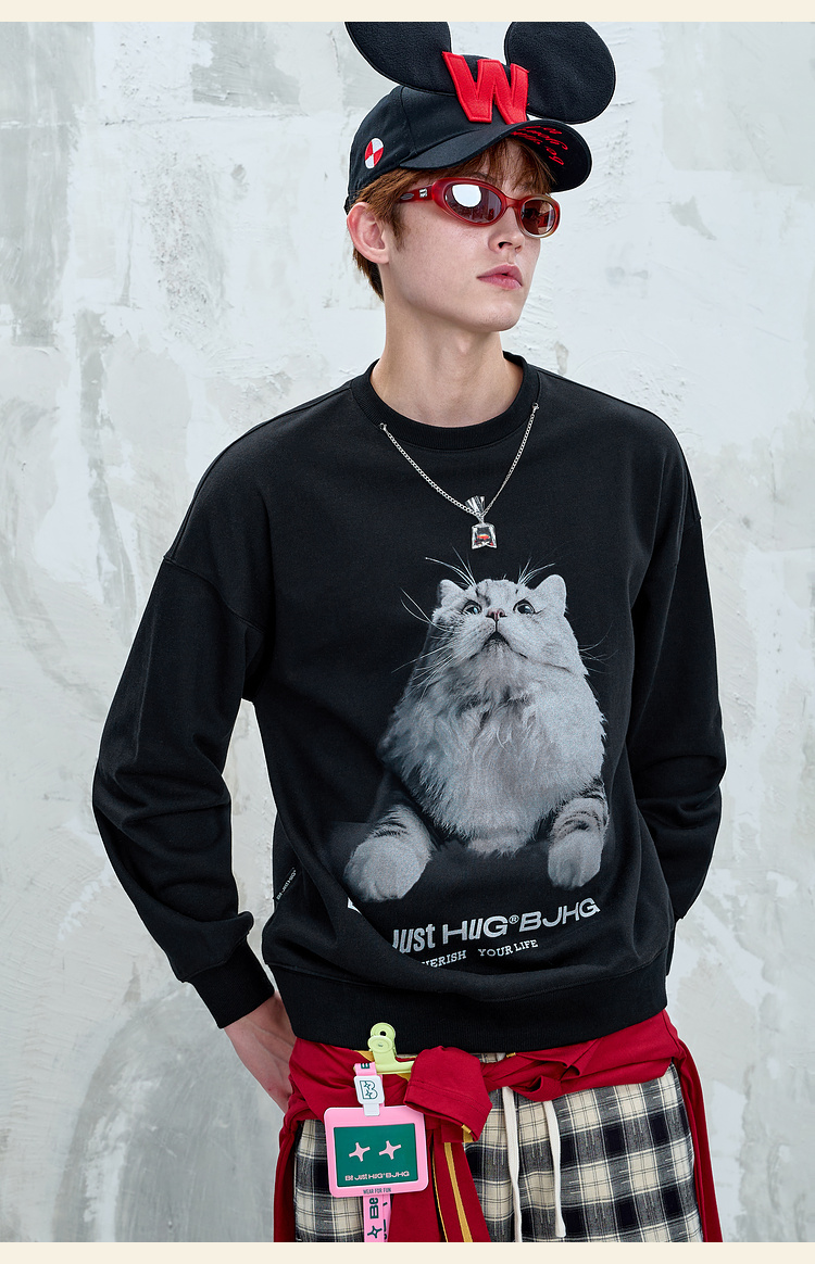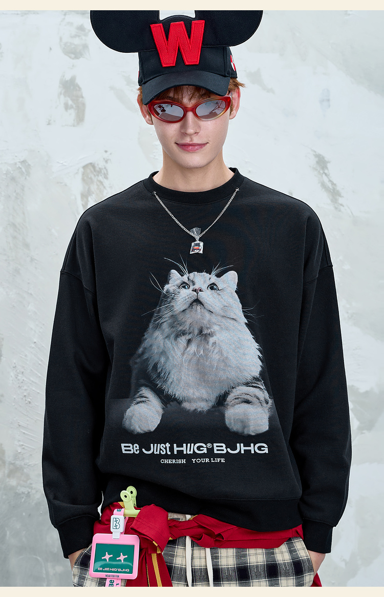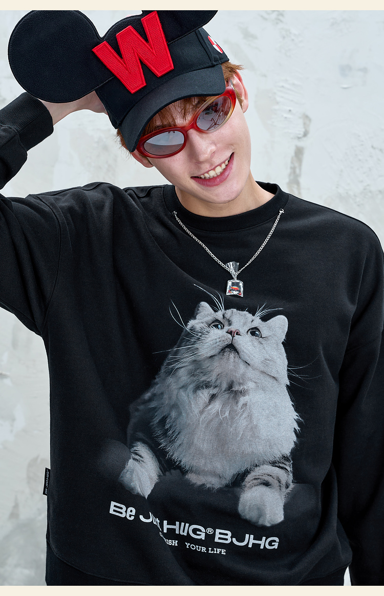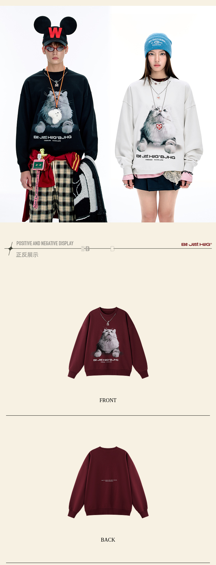 BJHG不计后果 小猫长袖t恤男款秋季美式宽松休闲暖皮恒温情侣卫衣