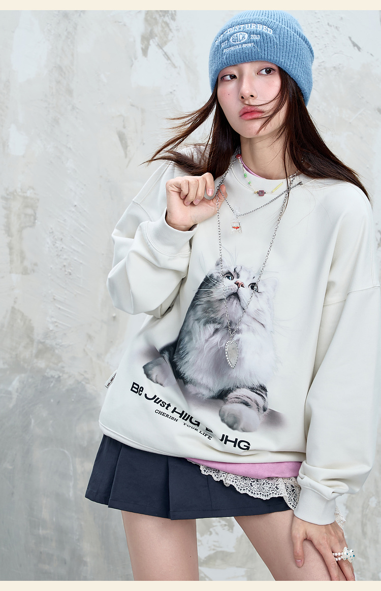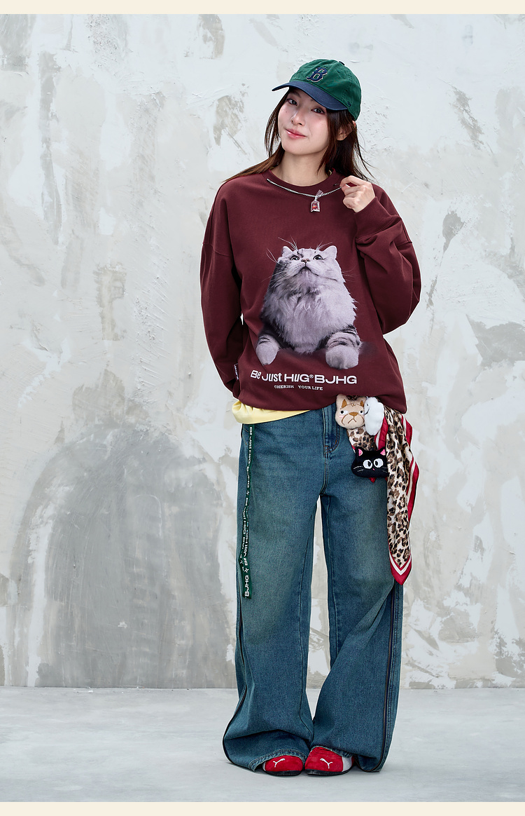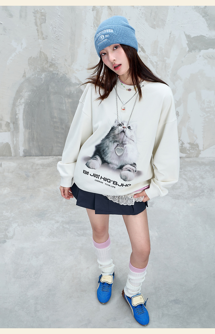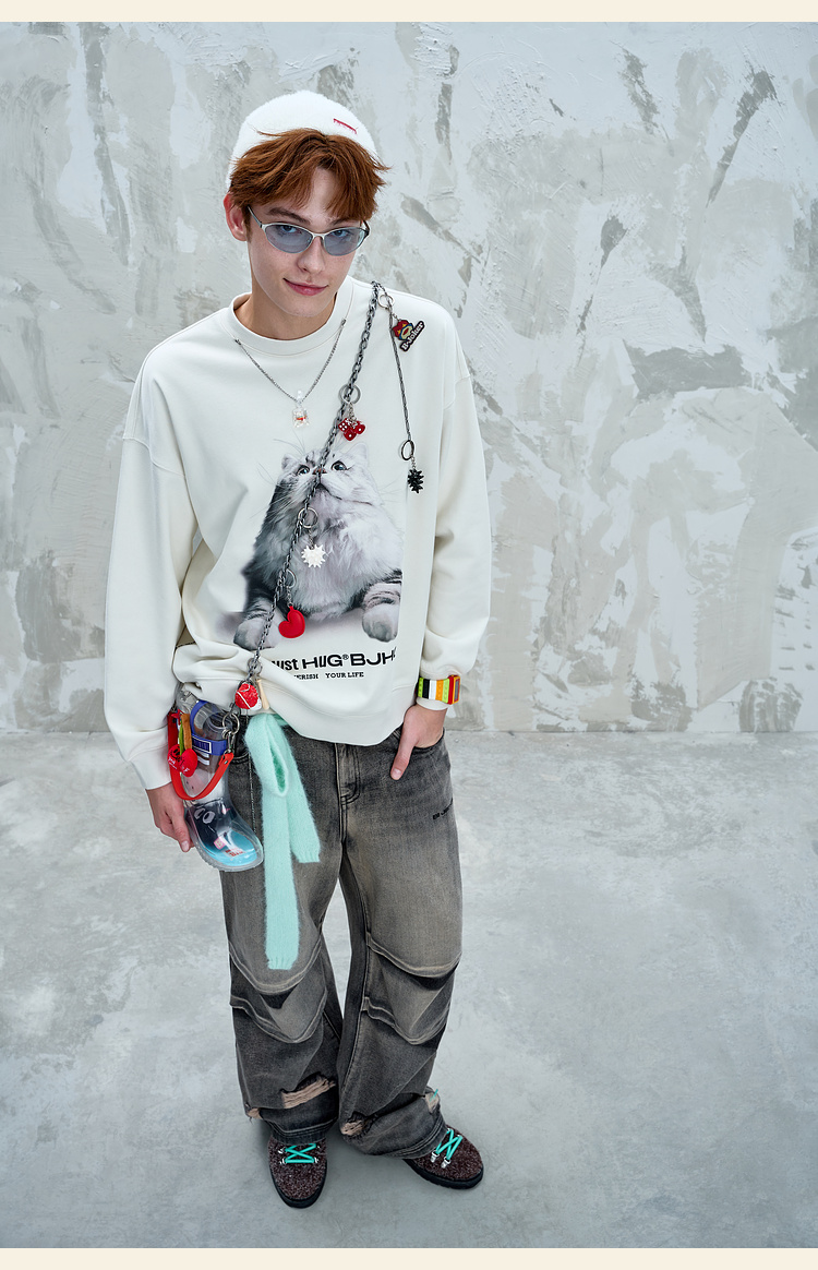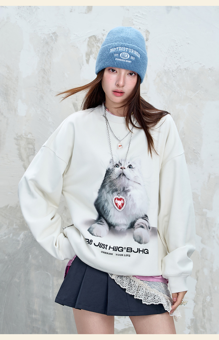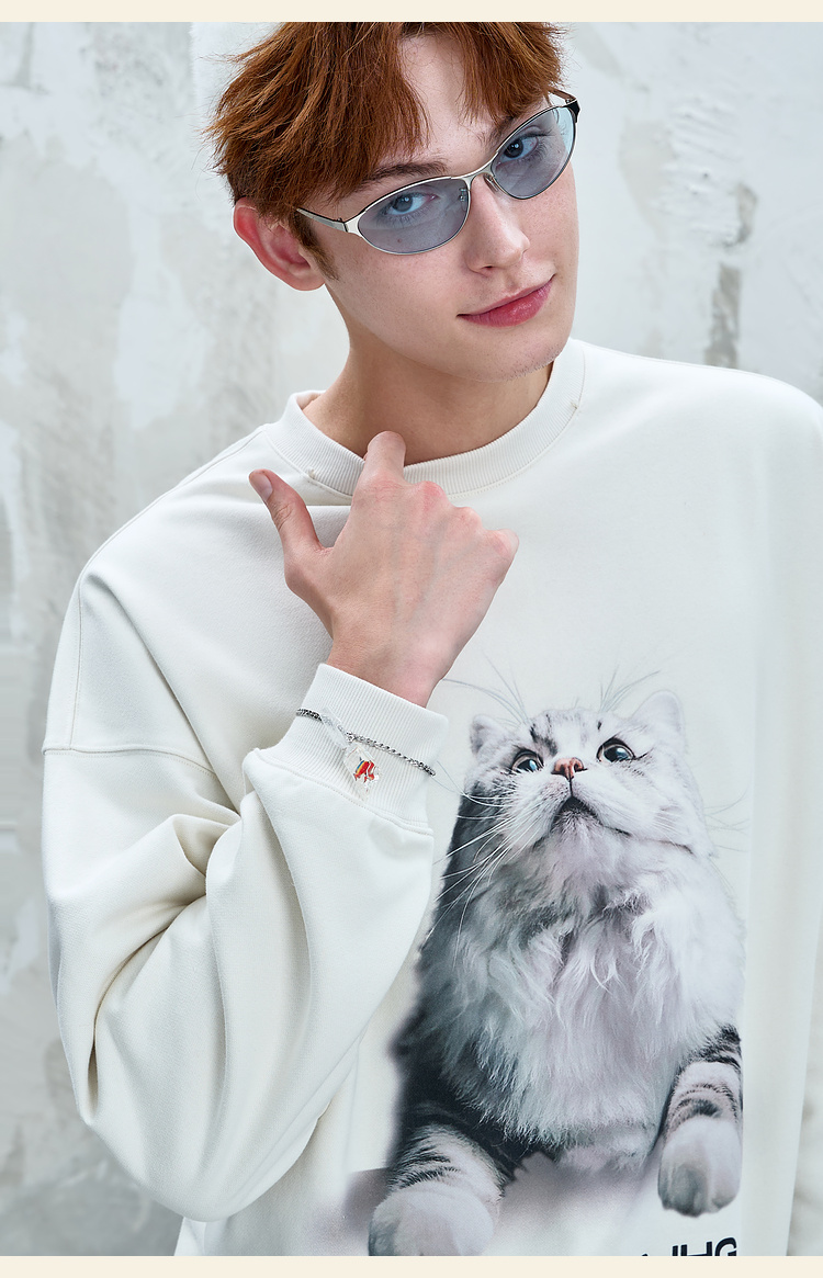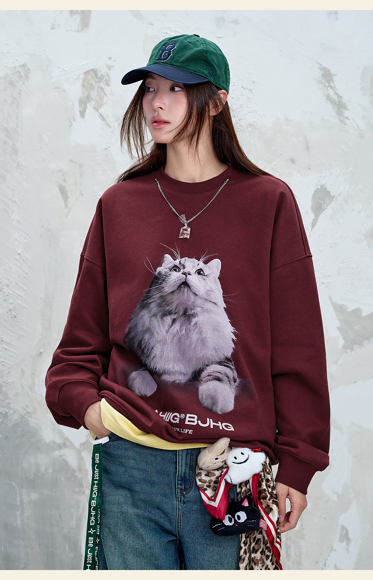 BJHG不计后果 小猫长袖t恤男款秋季美式宽松休闲暖皮恒温情侣卫衣