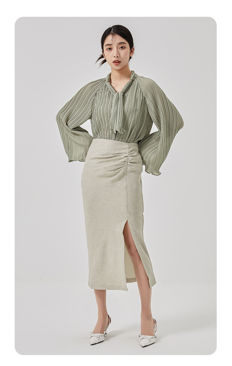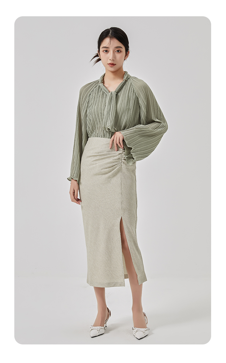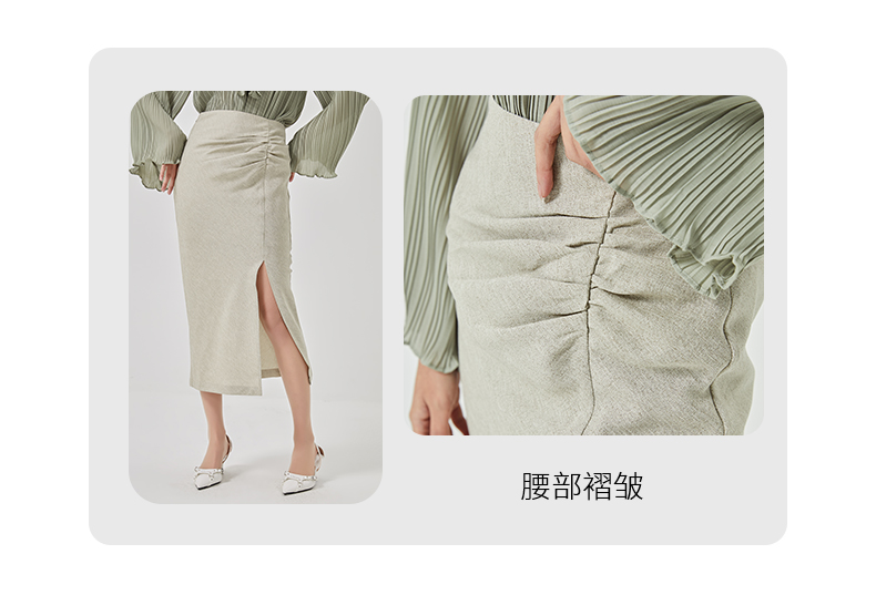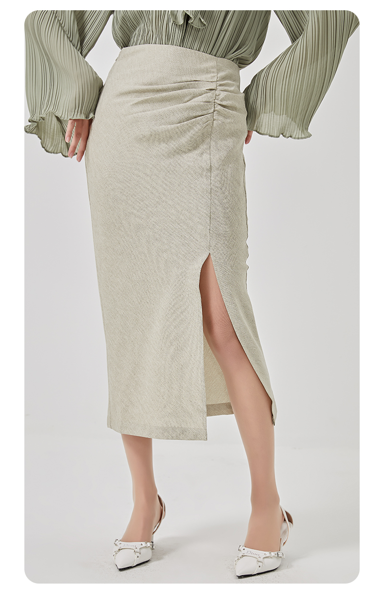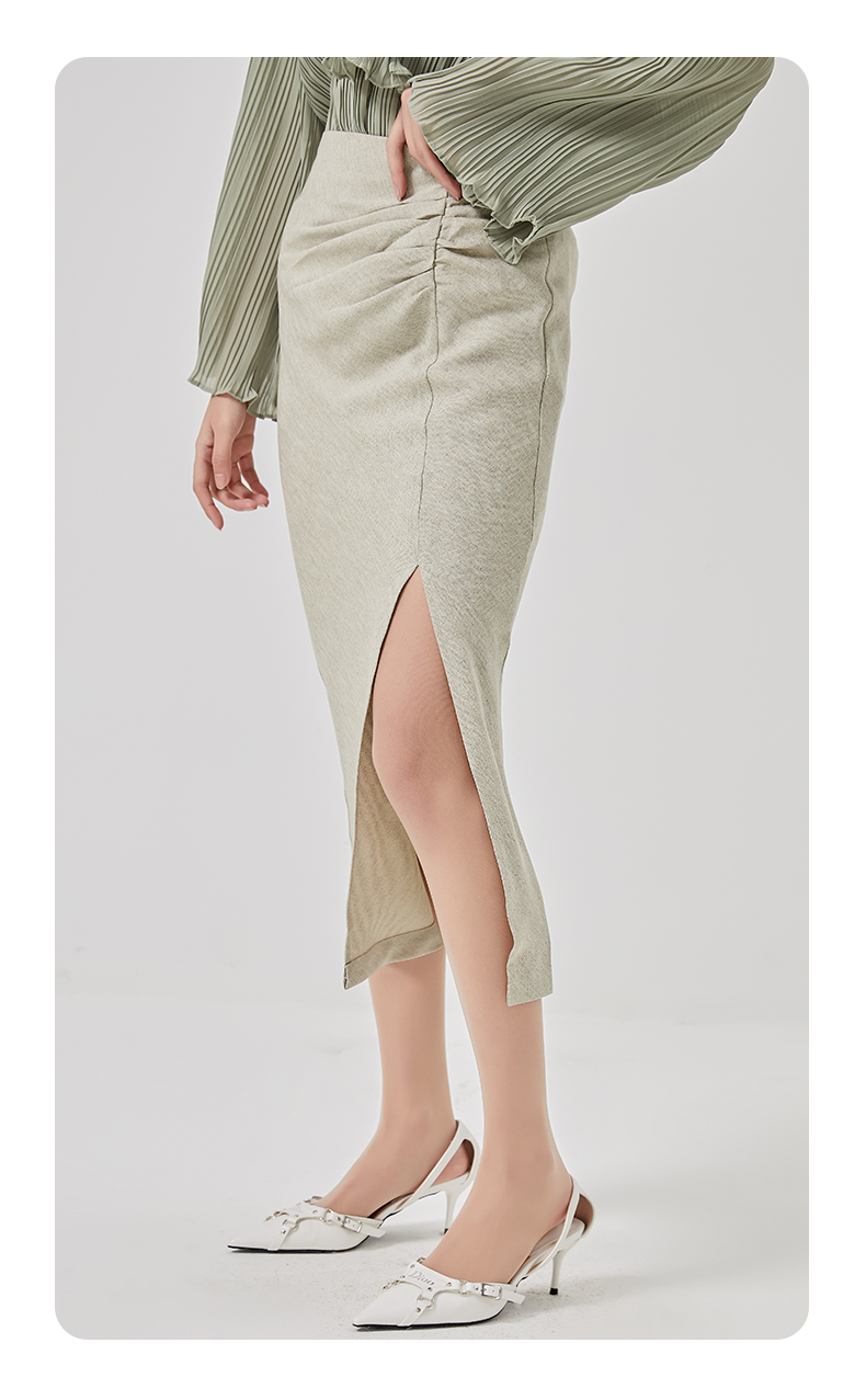 oldcolour2023春季新款高腰气质包臀抽褶开叉半身裙女HO14063423