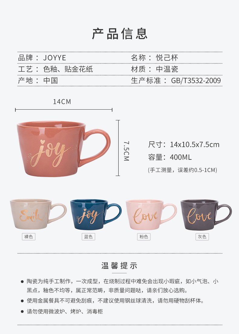 JOYYE卓艺单品悦己杯TFC0118015咖啡杯喝水杯子小精致欧式小奢华水杯办公室女家用马克杯