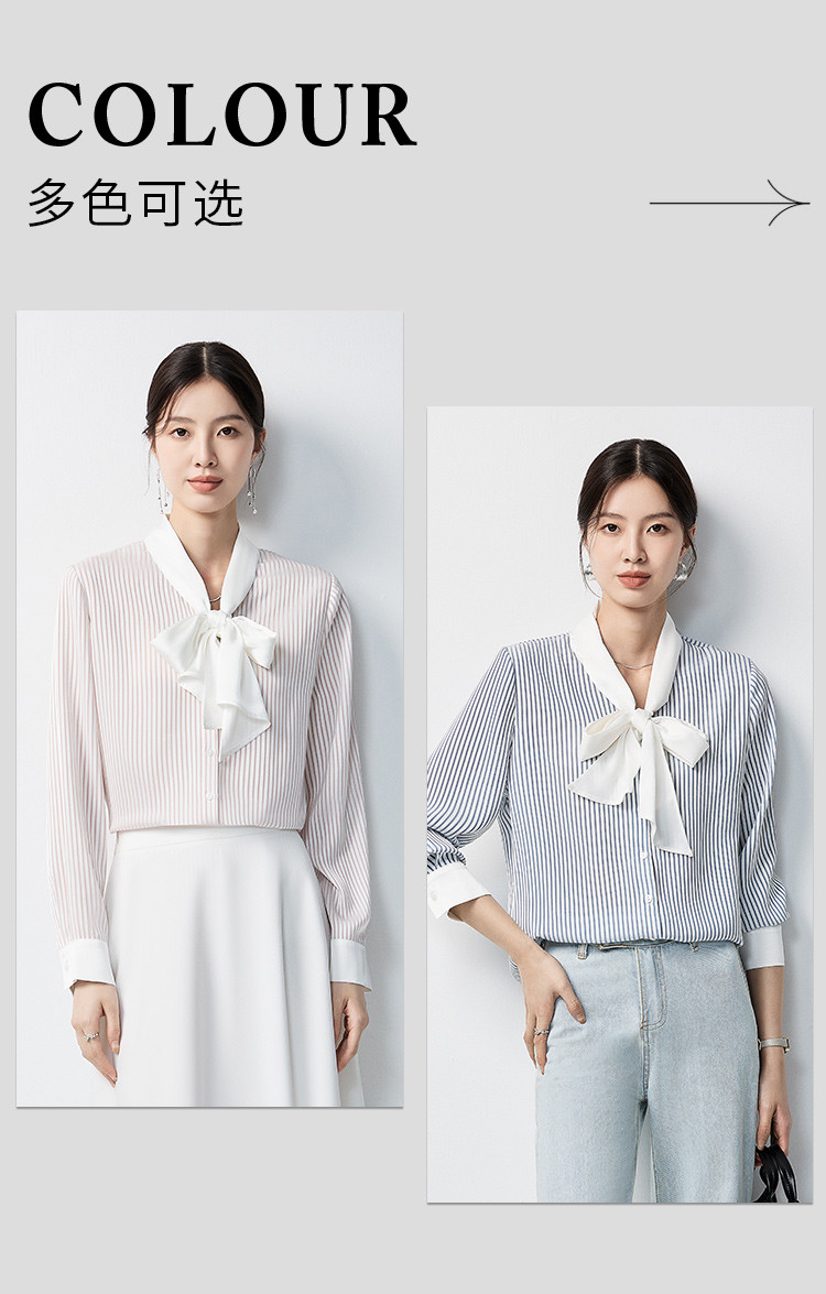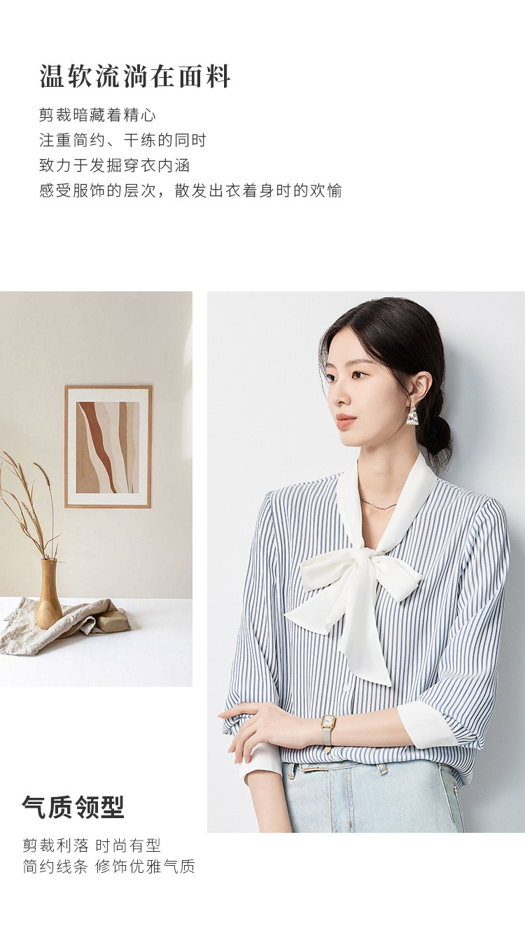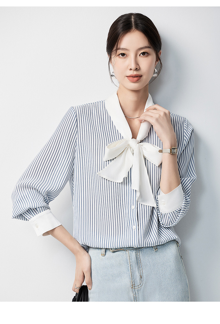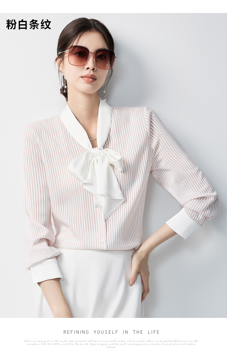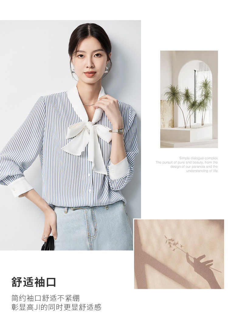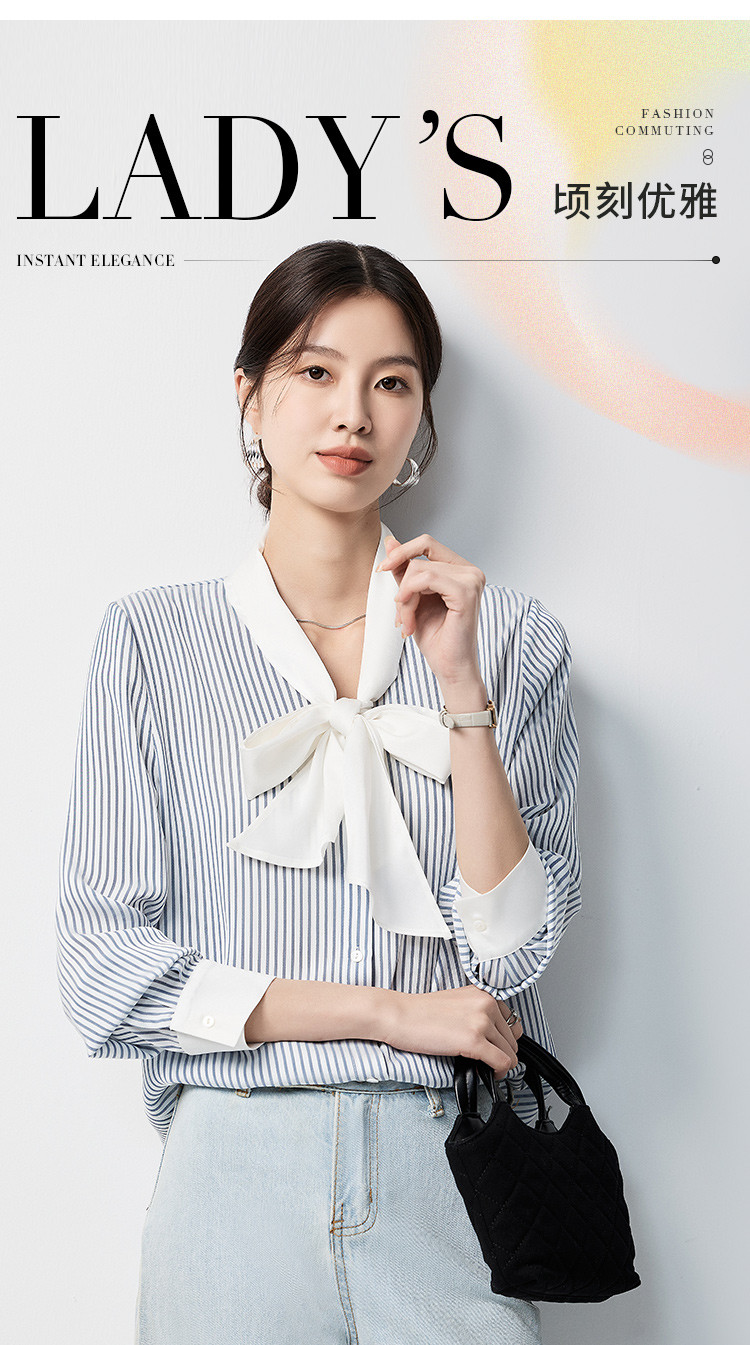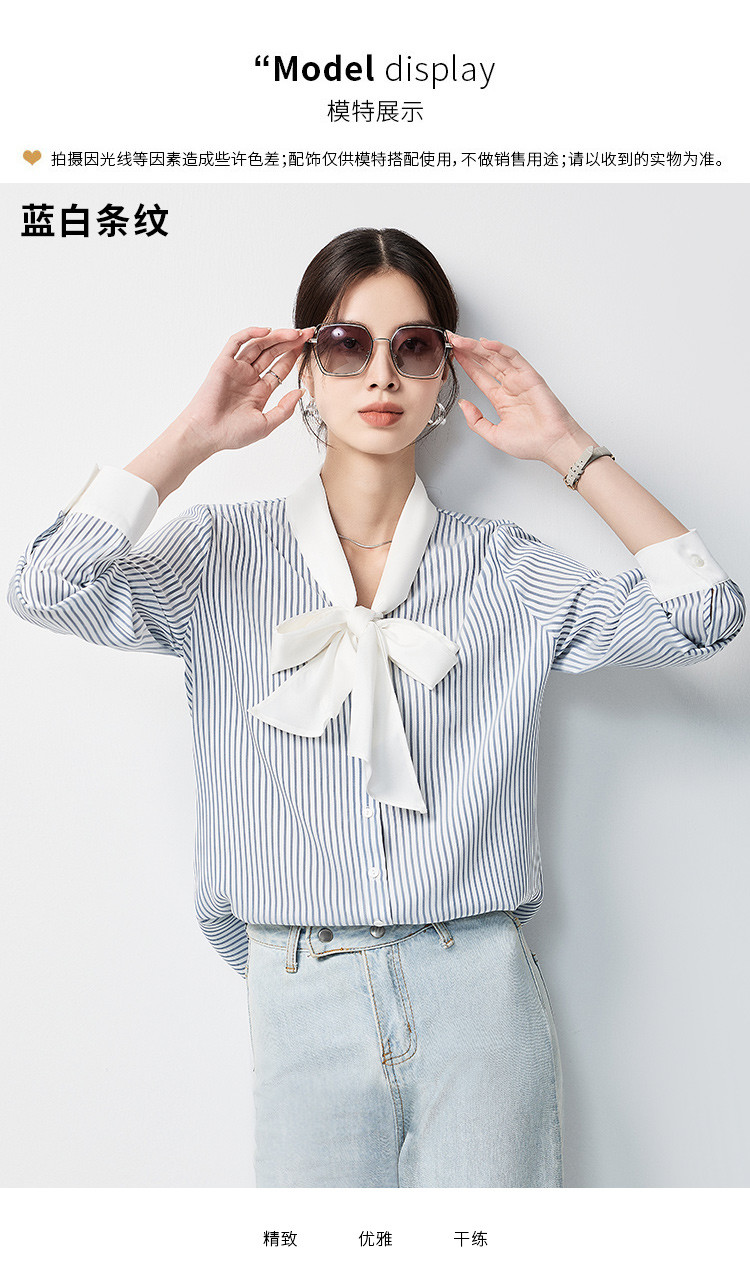 罗蒙春秋蝴蝶结条纹长袖衬衫女士知性优雅通勤百搭衬衣女