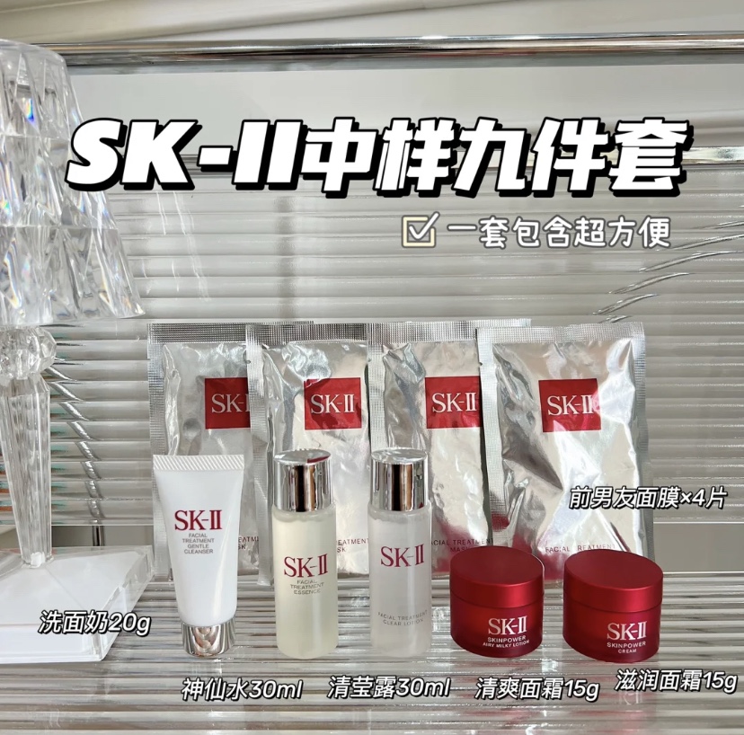 SK-II SK2旅行装中样九件套 套装/套盒(洁面20g+清莹露30ml+神仙水30ml+精华霜15g*2+面膜4片) QM