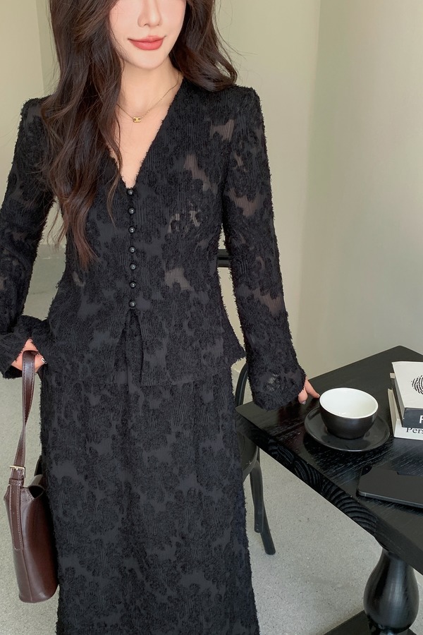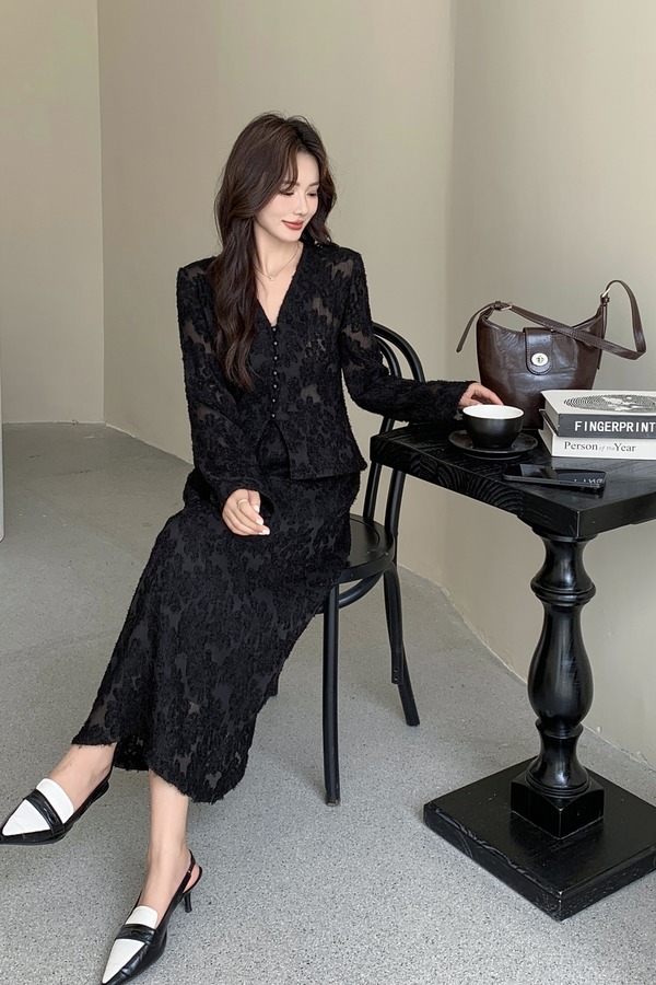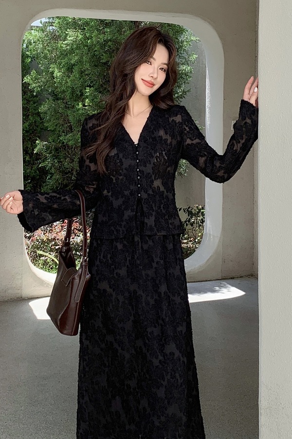Le Malene 经典舒适休闲长袖立体花开衫半裙套装 21042