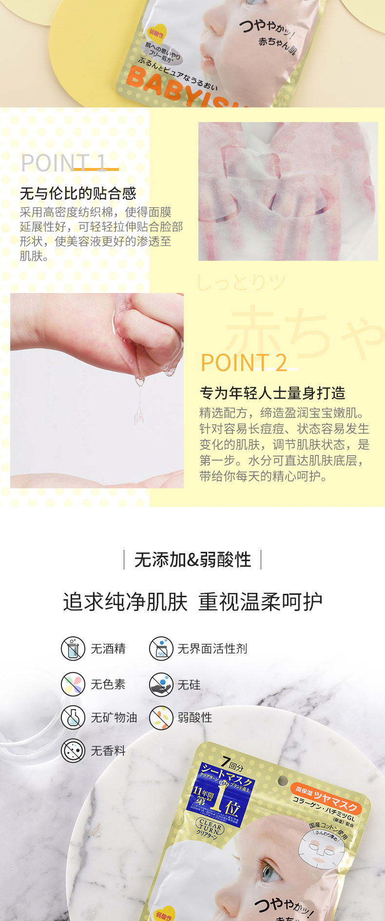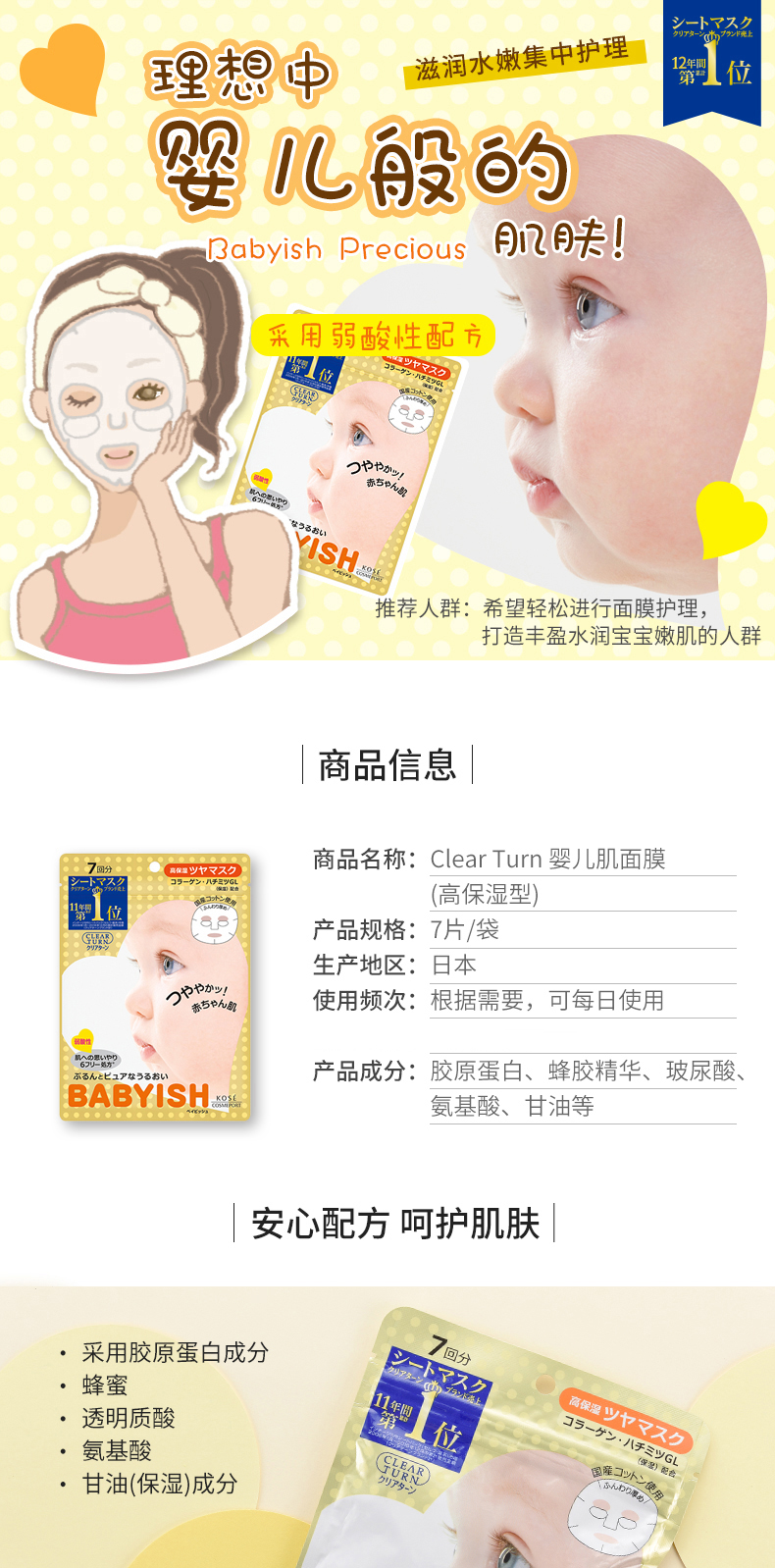 配合采用胶原蛋白,蜂蜜,透明质酸,氨基酸等,面膜的材质是纯棉质地,温和亲肤,不闷豆,在日本本土是12年间累计销量NO.1的面膜~