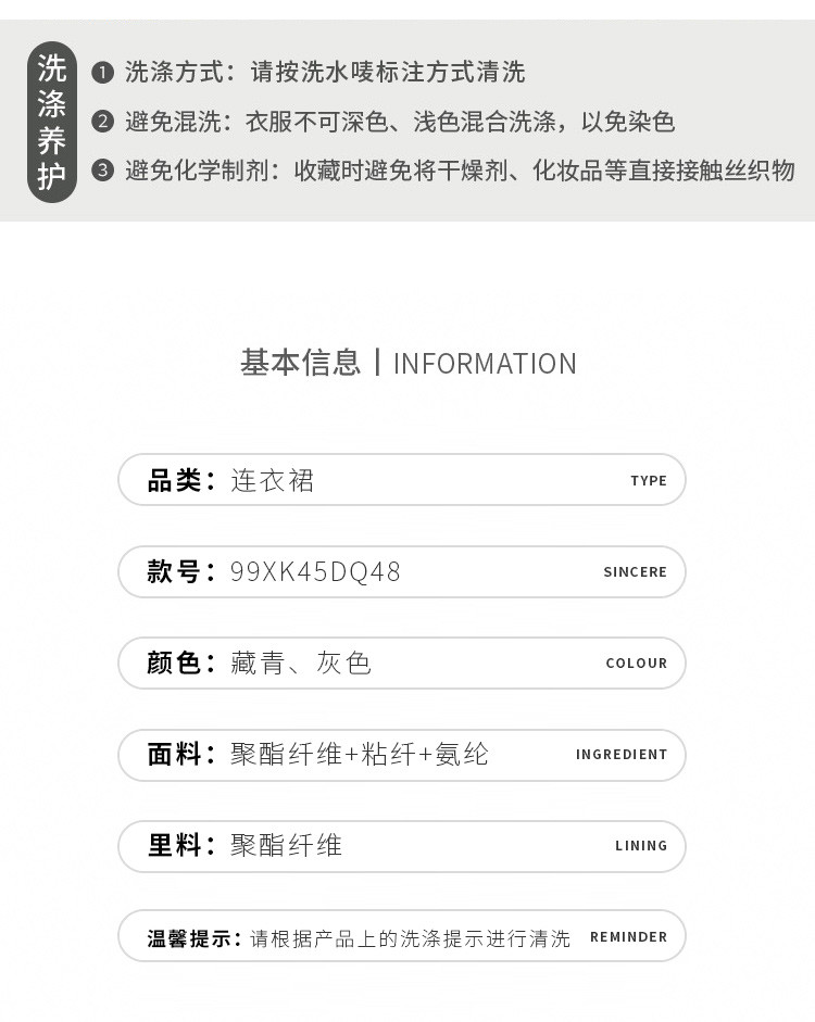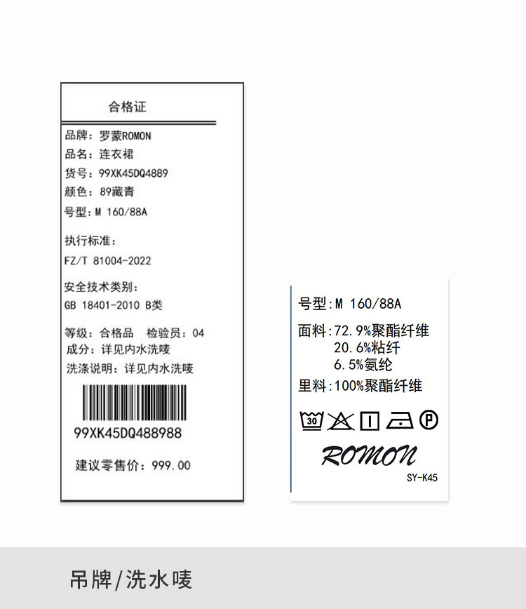面料:72.9%聚酯纤维20.6%粘纤6.5%氨纶 里料:100%聚酯纤维