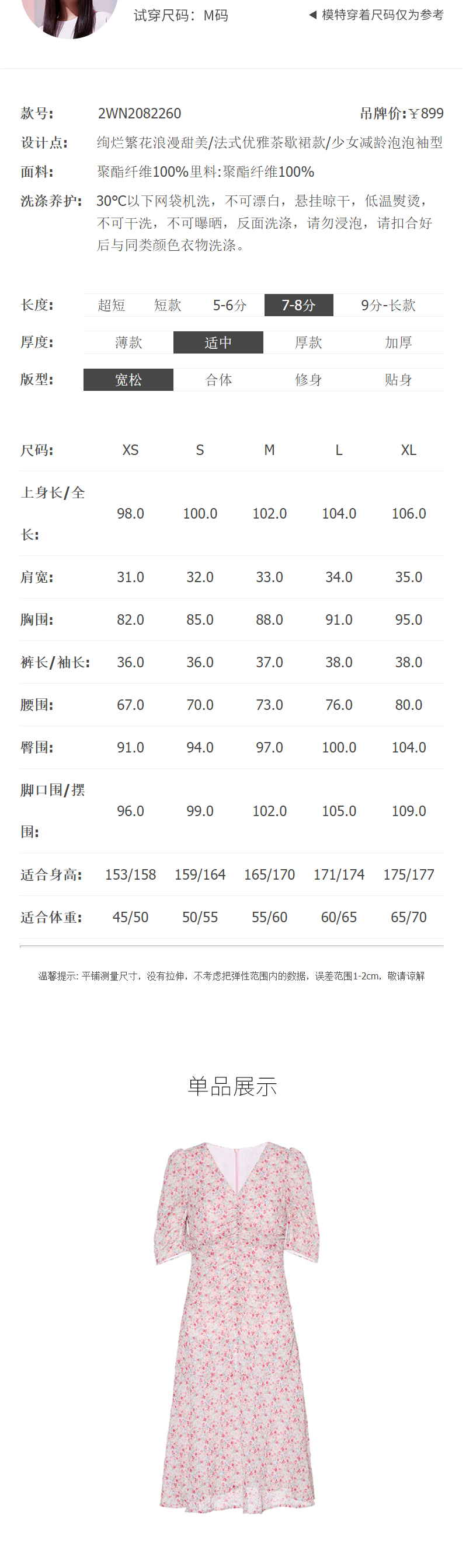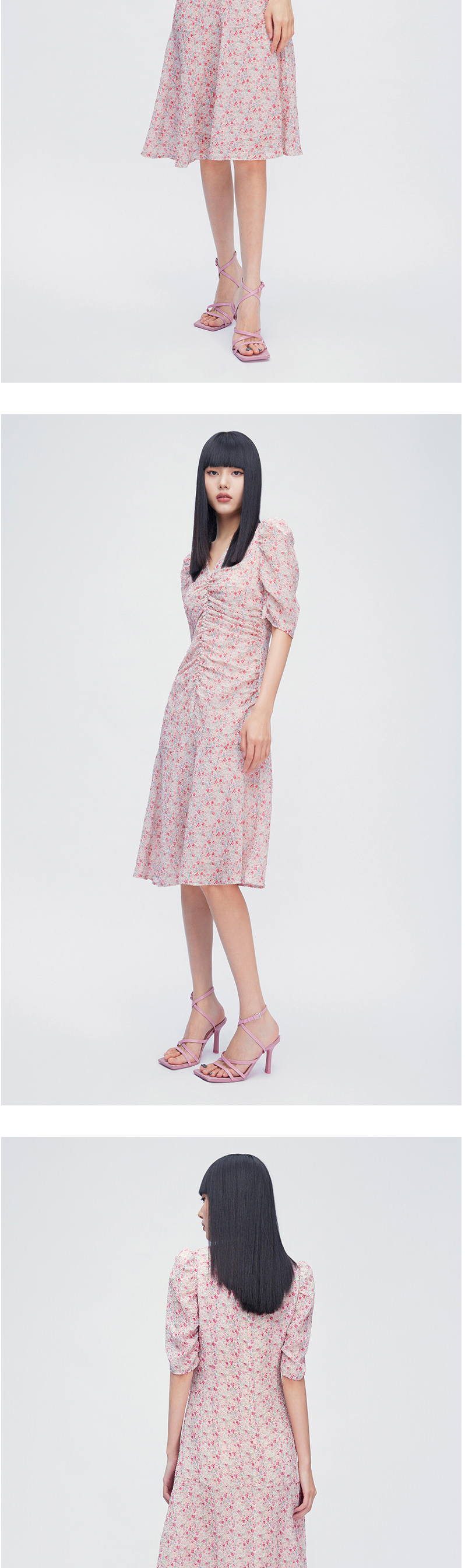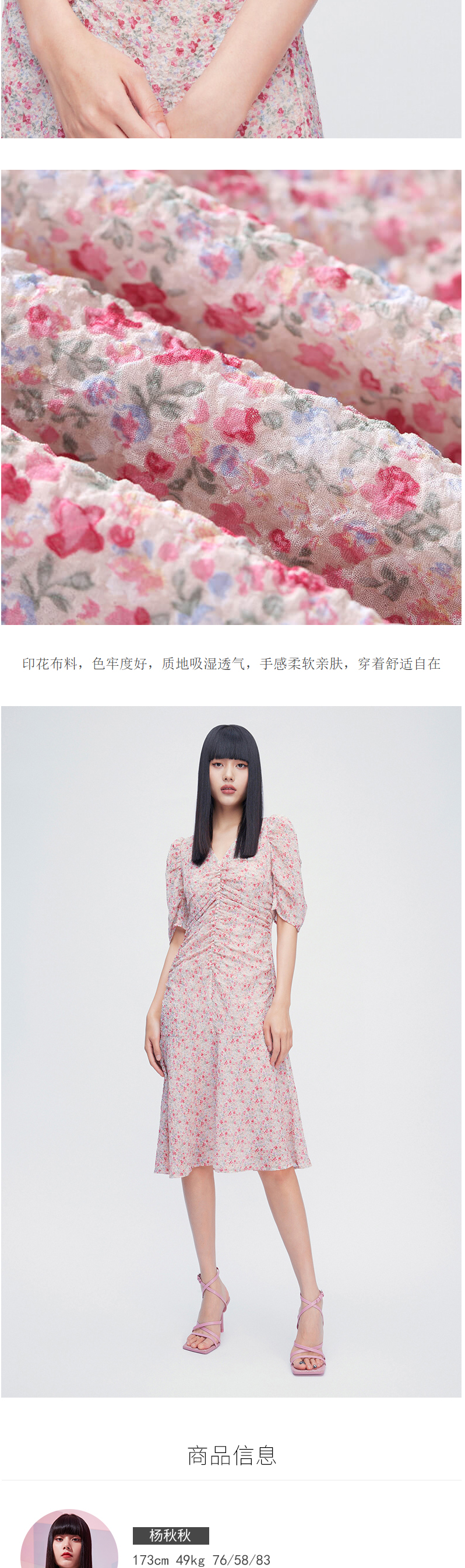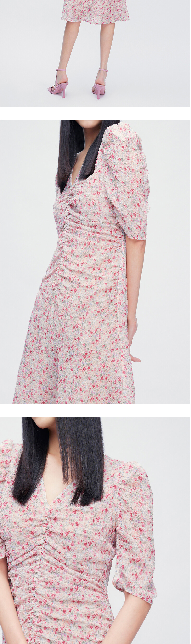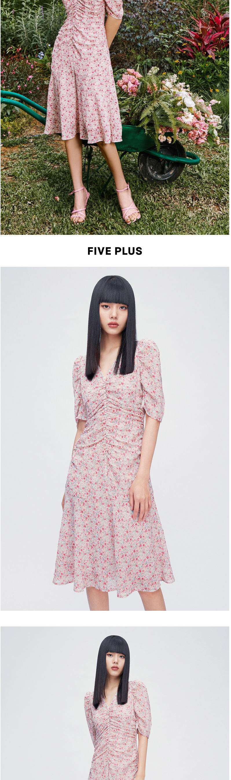 FIVE PLUS2022新款女夏装V领碎花连衣裙泡泡袖修身中长茶歇裙法式2WN2082260