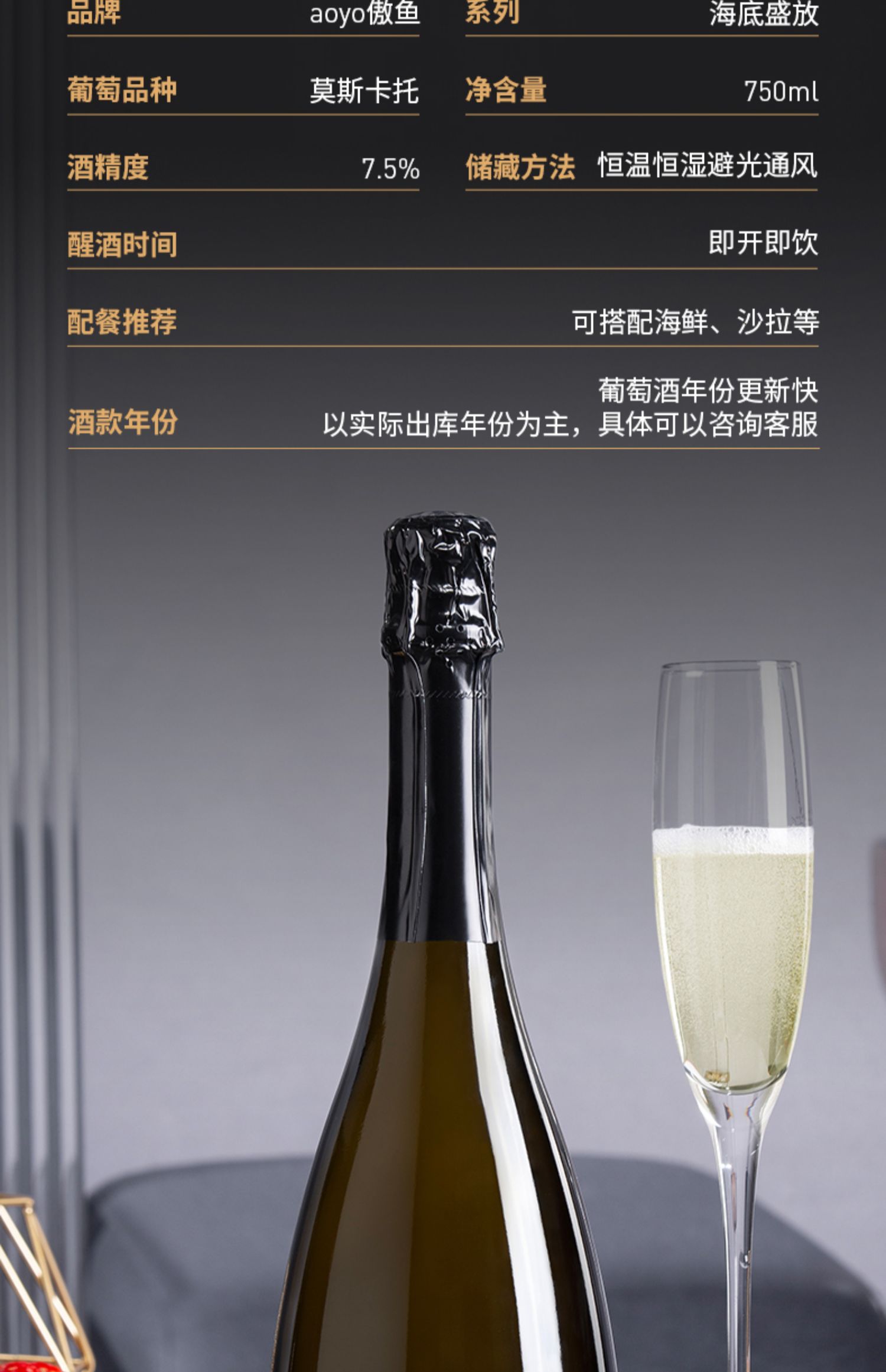 傲鱼海底盛放莫斯卡托甜白起泡酒750ML-1瓶(无礼盒)100%智利原瓶进口【XPTX】