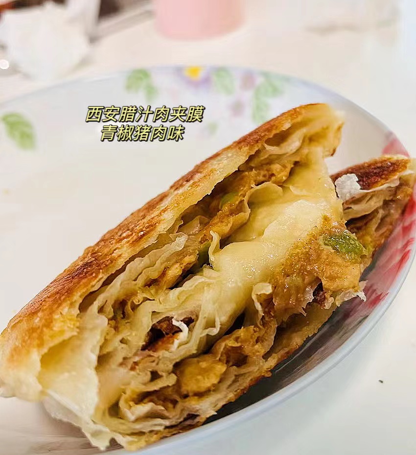 肉夹馍的馅料,香而不腻,青椒口感很新鲜。饼皮酥的掉渣,真的太好吃了!