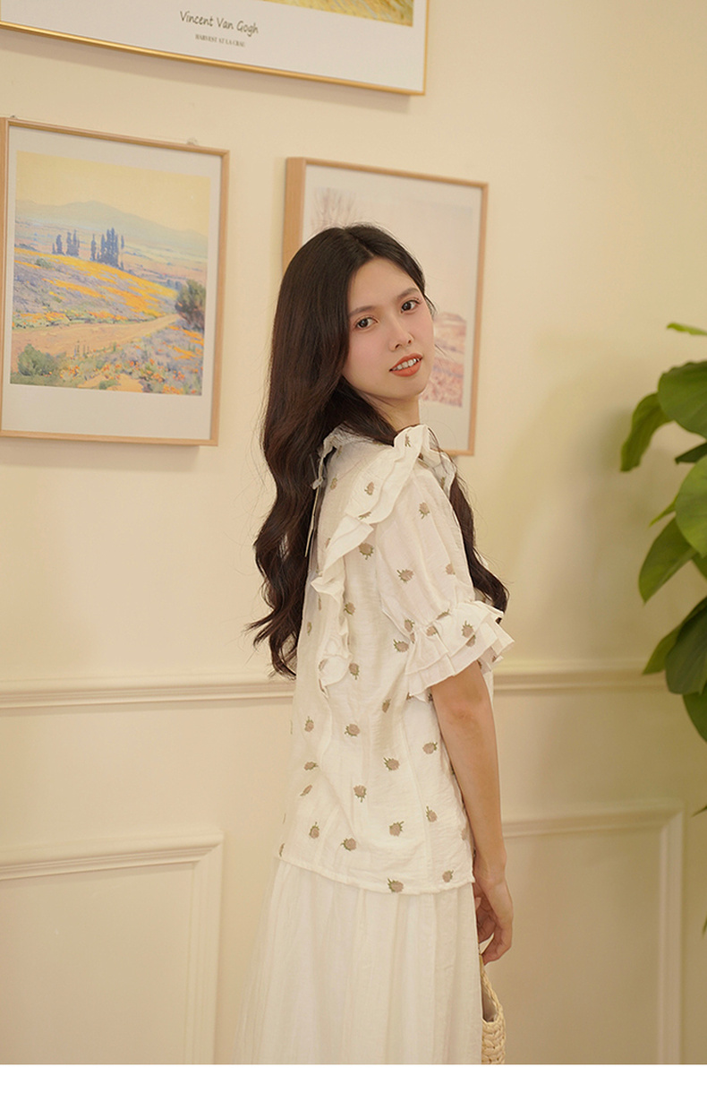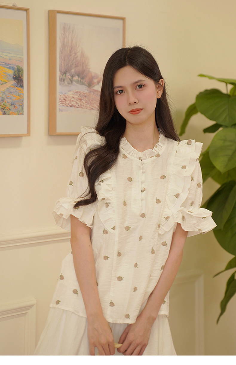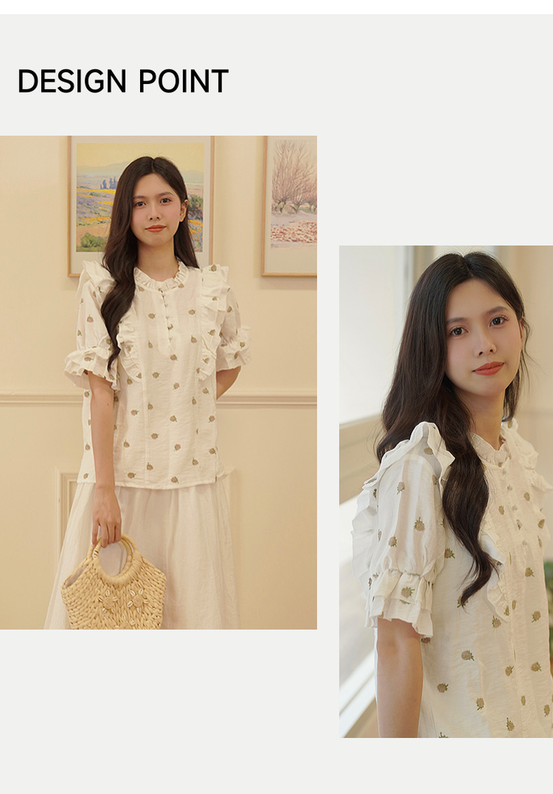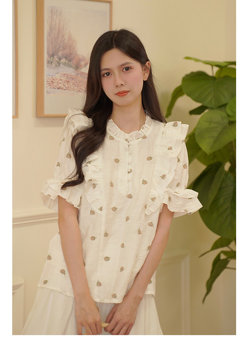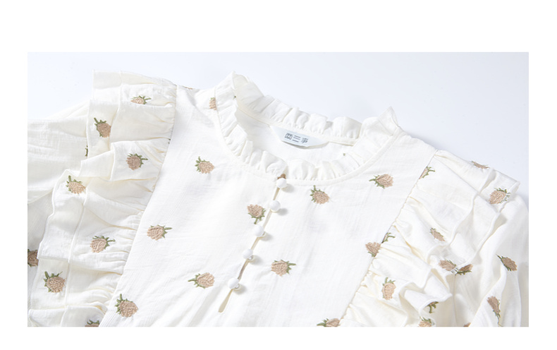 两三事飞花漫舞2024夏季新款小清新碎花刺绣荷叶边拼接衬衫女