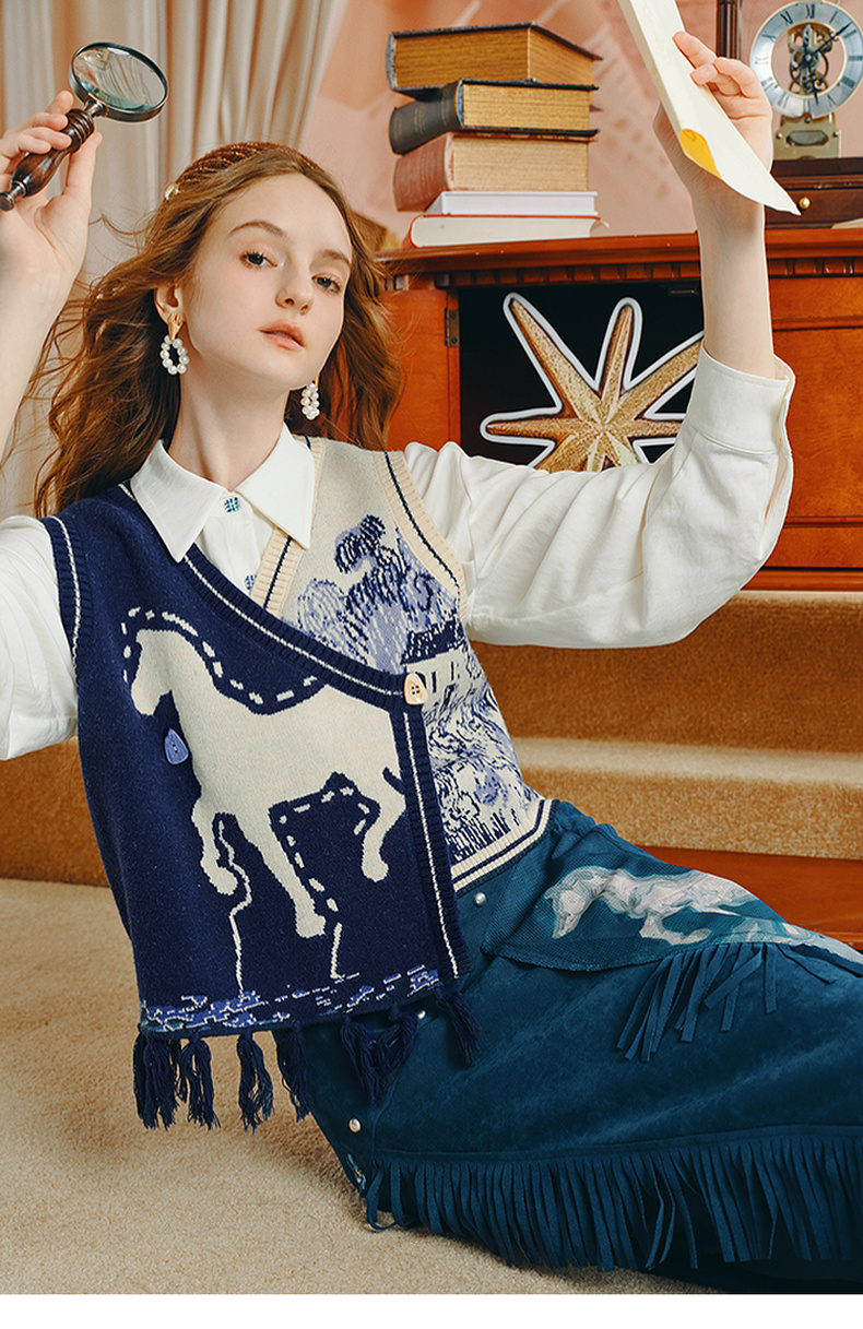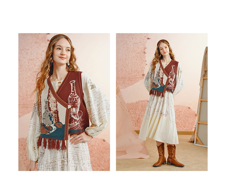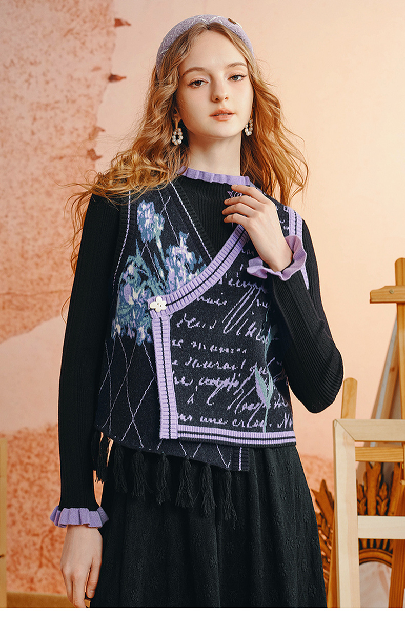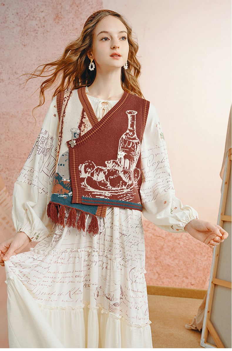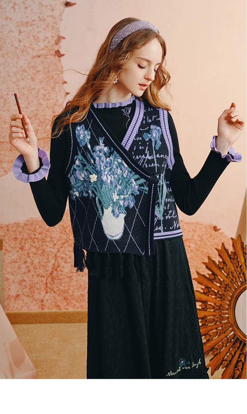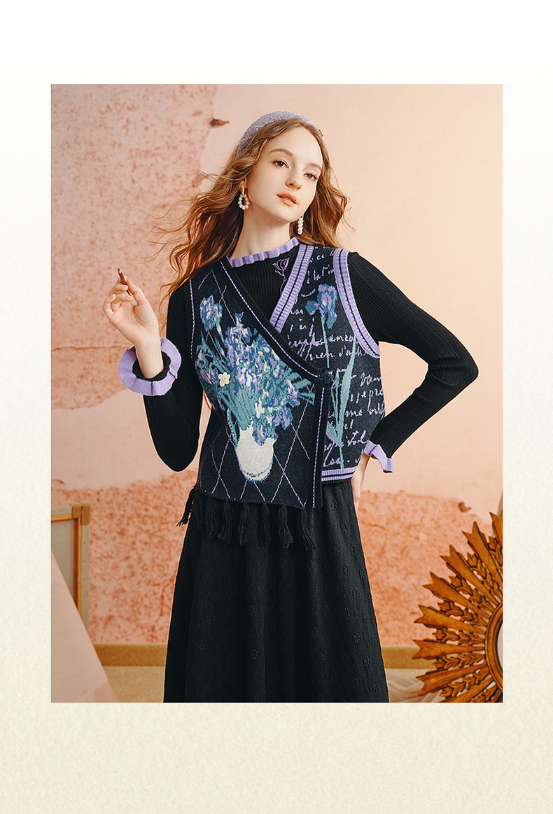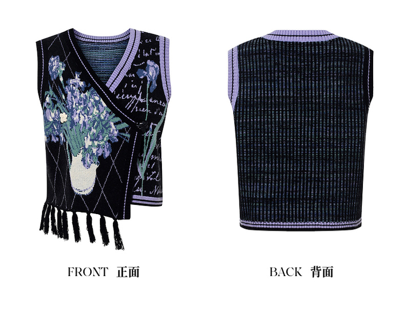 两三事梵高文艺旷野诗行2025秋季新款流苏下摆花色无袖针织开衫女