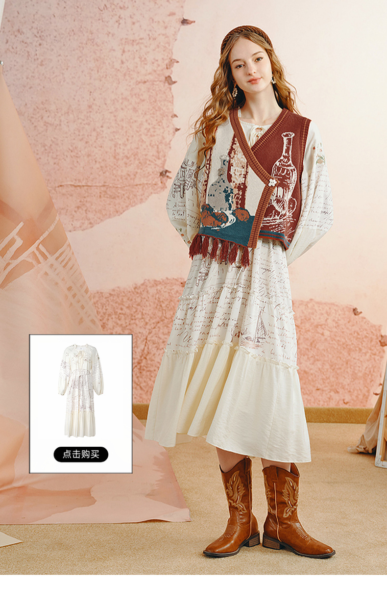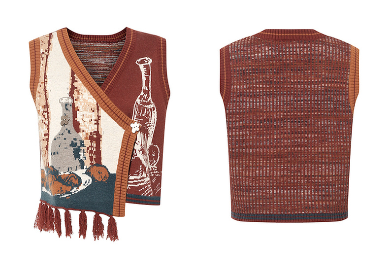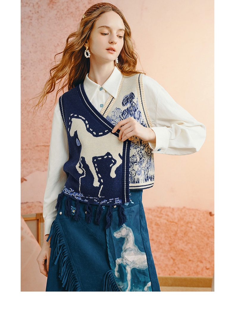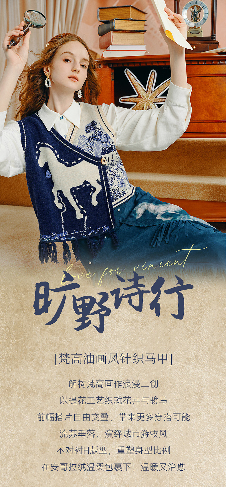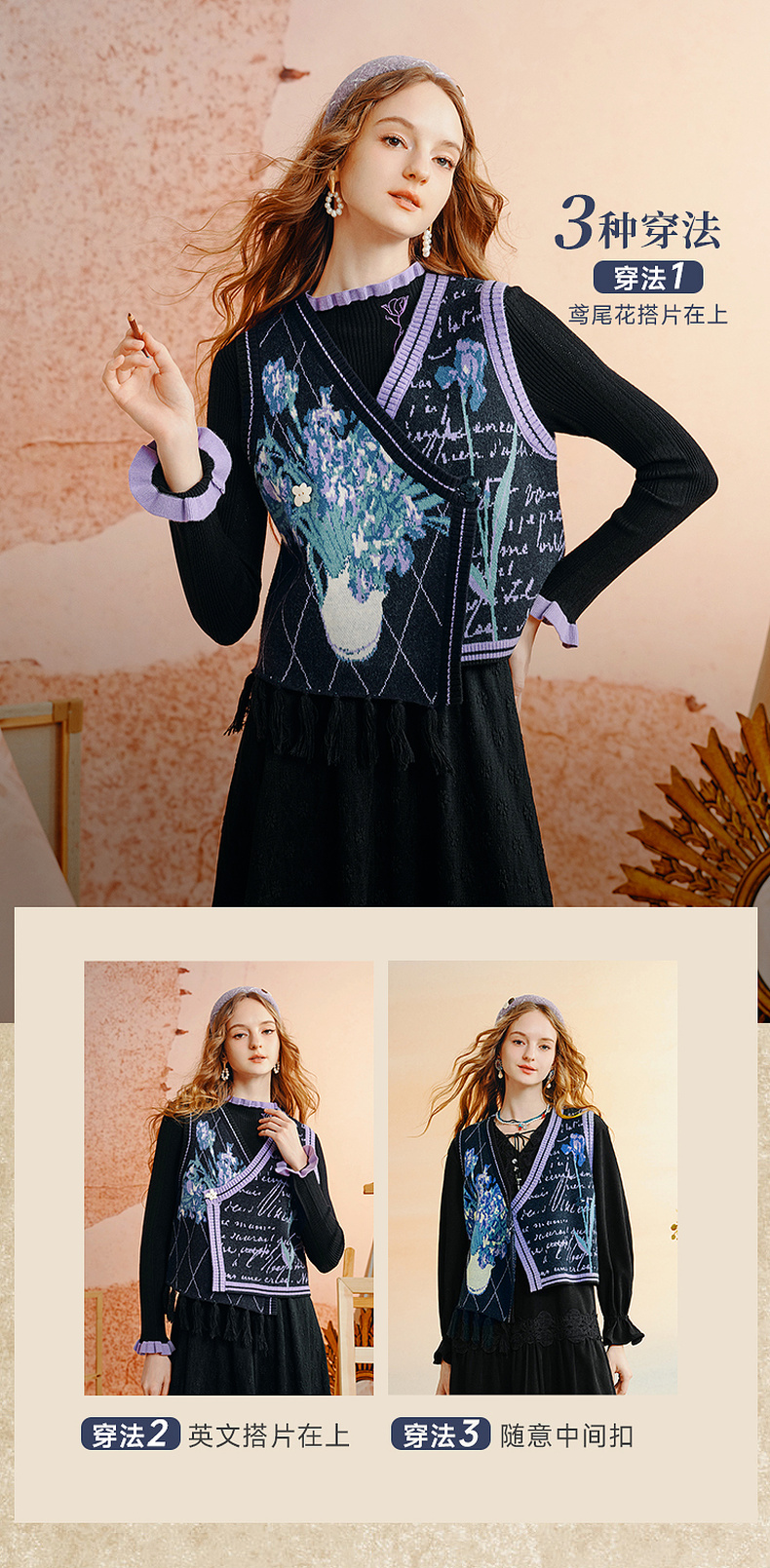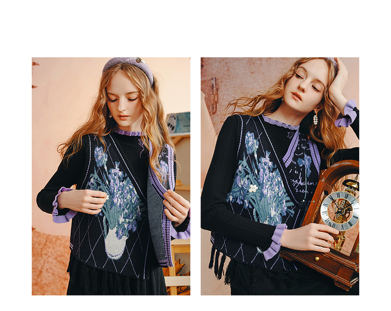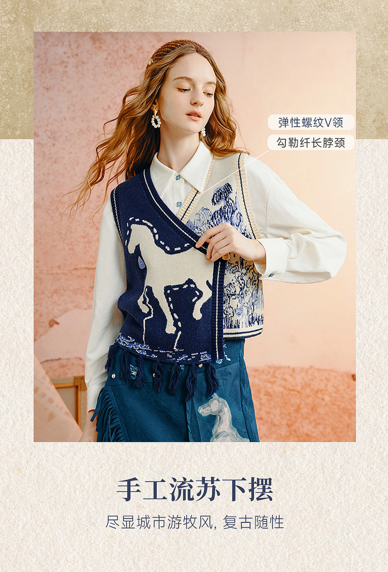 两三事梵高文艺旷野诗行2025秋季新款流苏下摆花色无袖针织开衫女