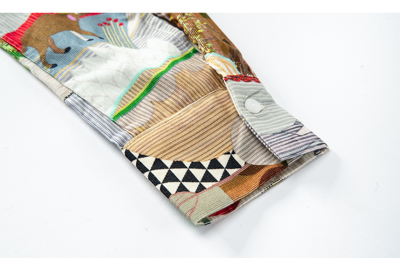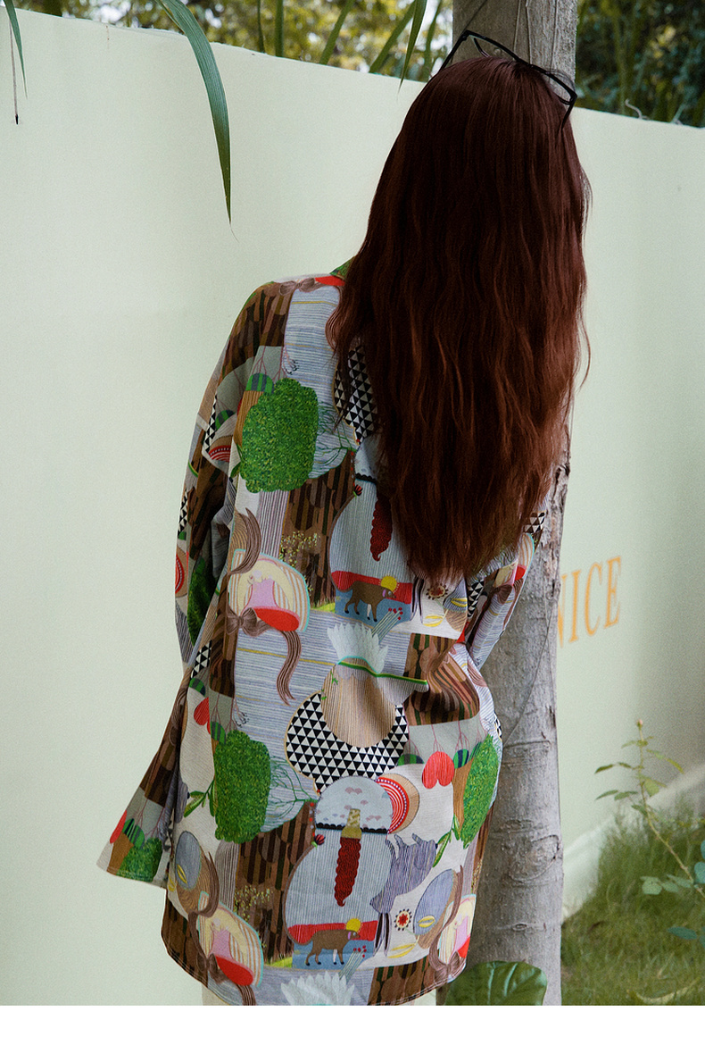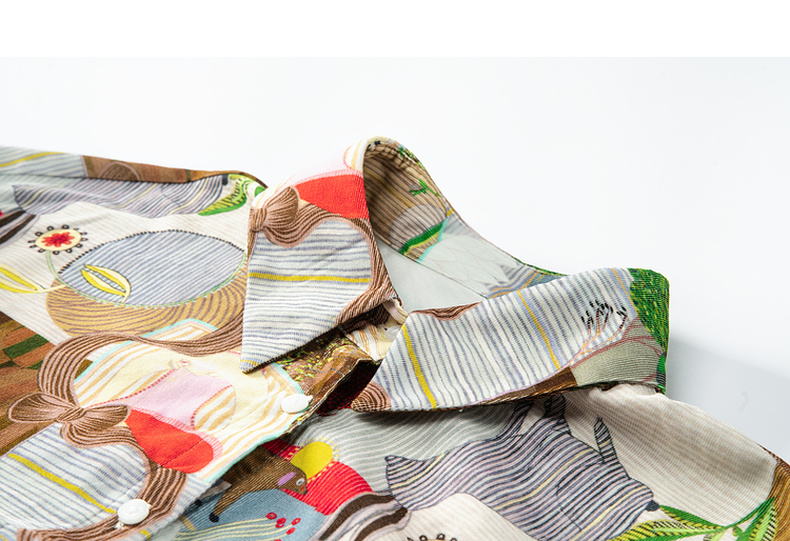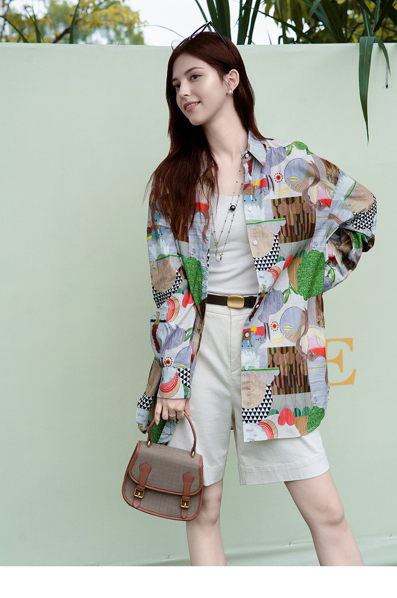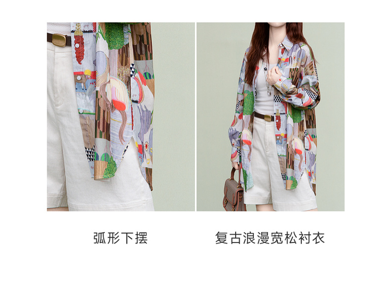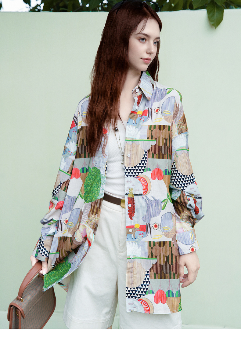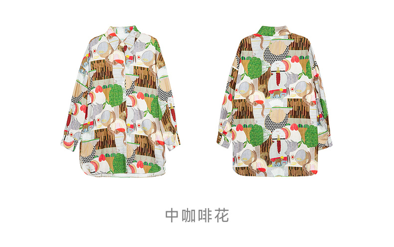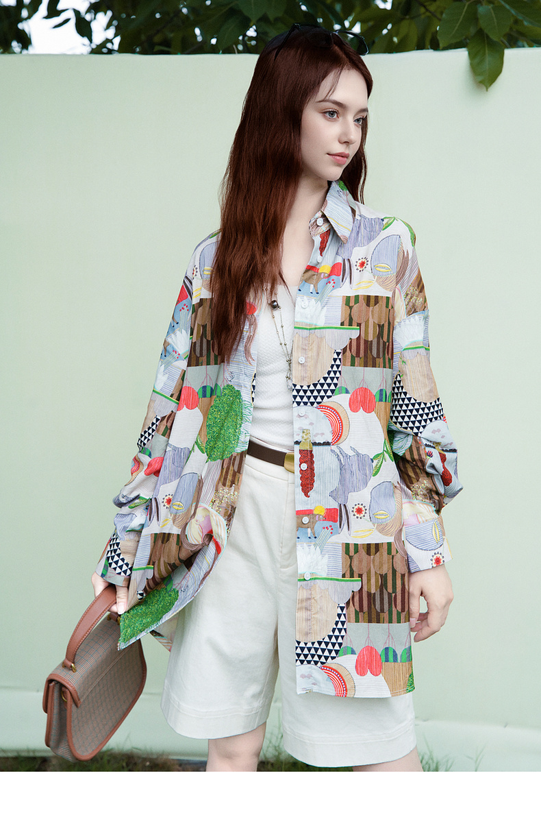 谜底大廓形花色衬衫长袖女2025秋新品原创印花中长衬衣257MC7303