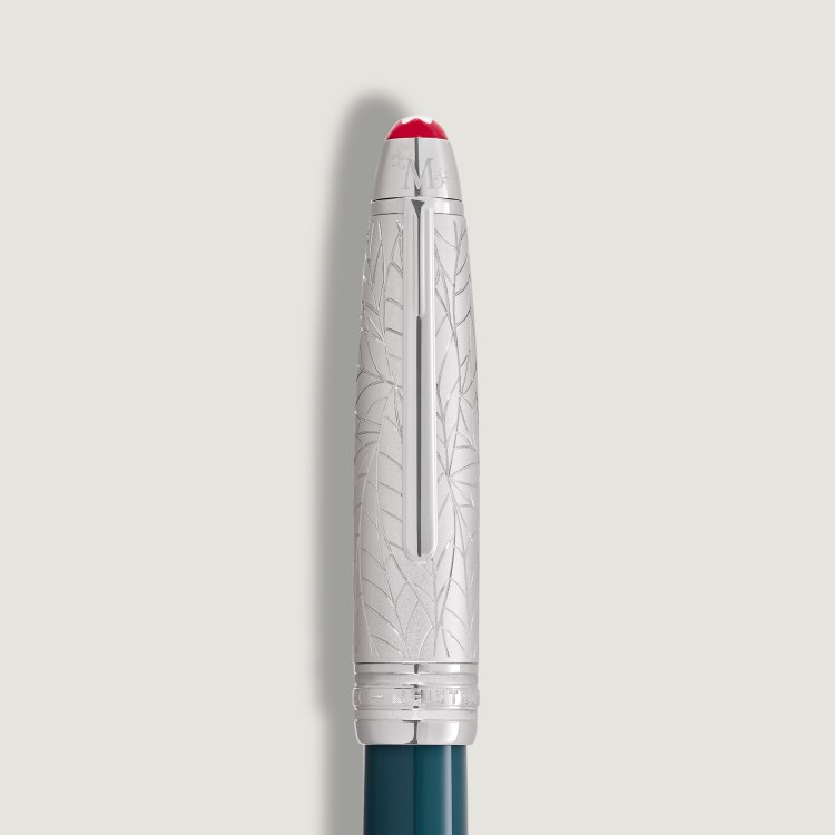 这款签字笔向罗密欧致敬,采用蓝绿色名贵树脂制成。镀铂金笔帽饰有一朵玫瑰,周围簇拥着树叶图案,象征着朱丽叶的热切祈盼:愿他们的爱永不被家族宿怨玷污,正如玫瑰纯净而迷人的芬芳,蔡绕不绝。