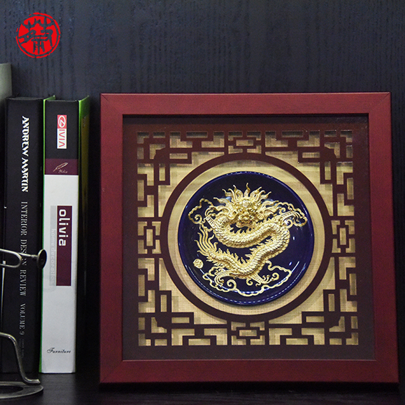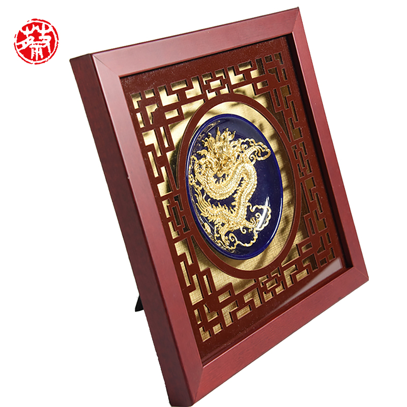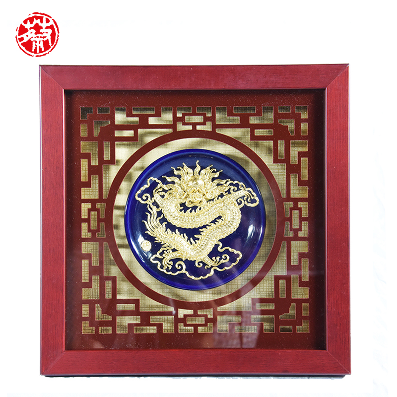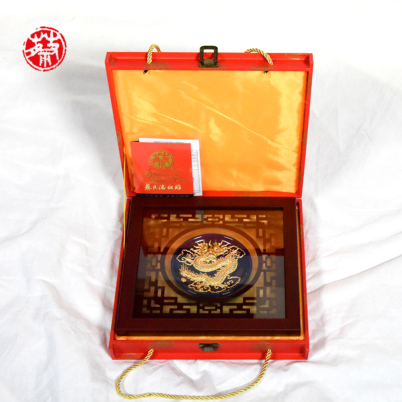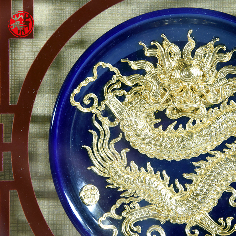 正龙盘采用了传统正面龙纹样,是龙纹中最尊贵的一种纹饰。蔡氏漆线雕技艺最擅长龙凤纹样的刻画,龙鳞整齐排列、龙爪苍劲有力、龙须随风飘扬。整件作品远看霸气十足,近看却十分细腻,是一件传统纹样的经典之作。