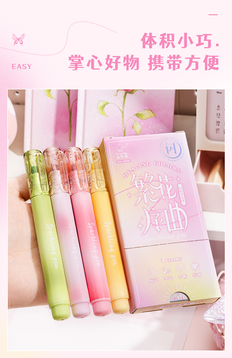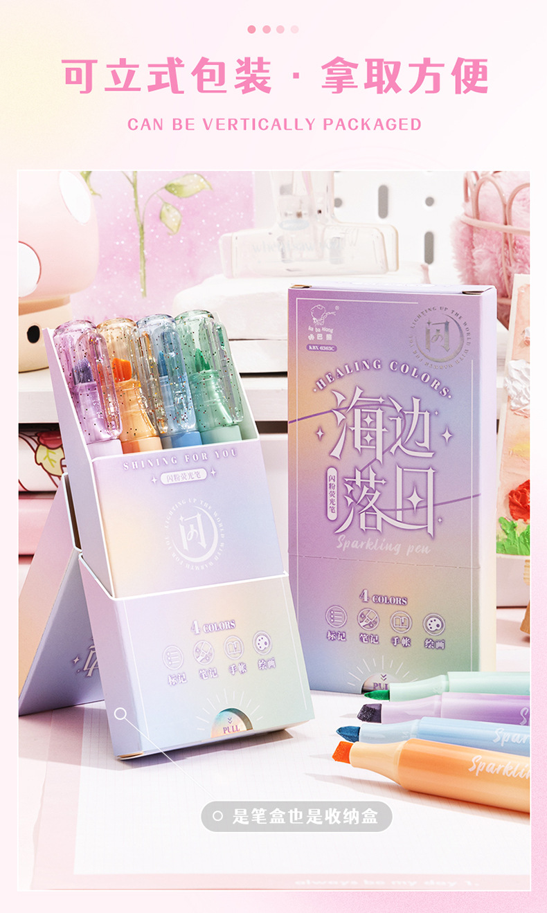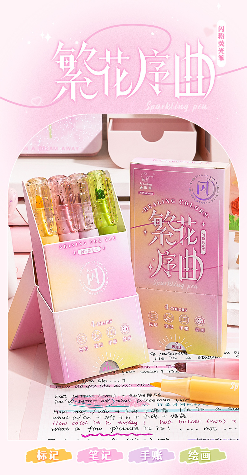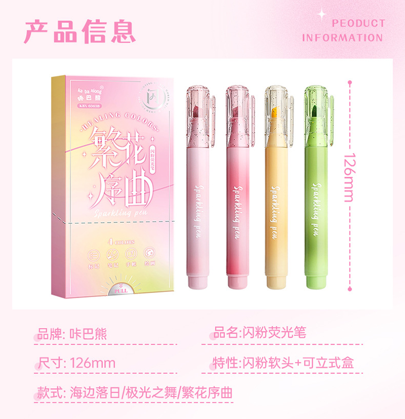 咔巴熊可立式闪粉荧光笔 【一盒四支套盒装】可爱学生ins彩色绘画笔 重点便携手账笔
