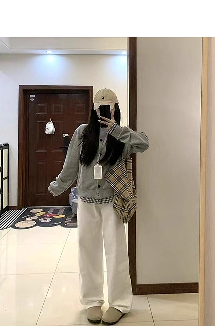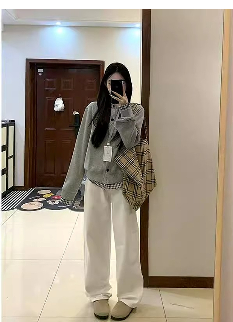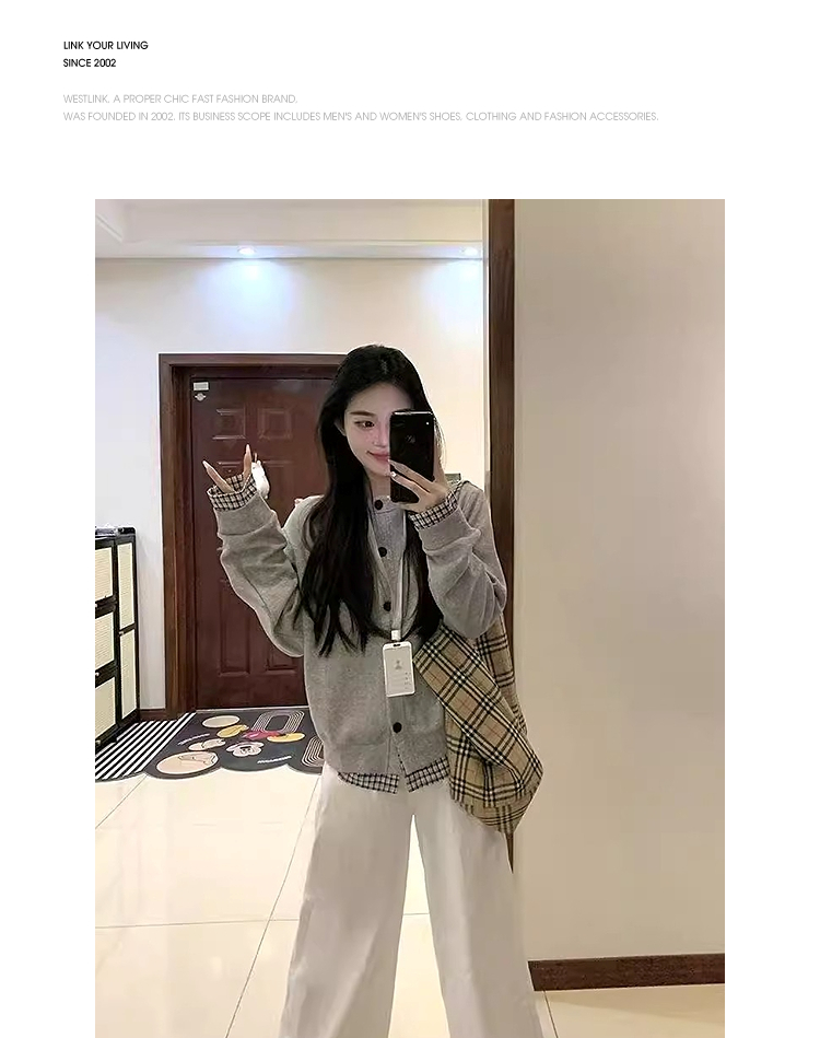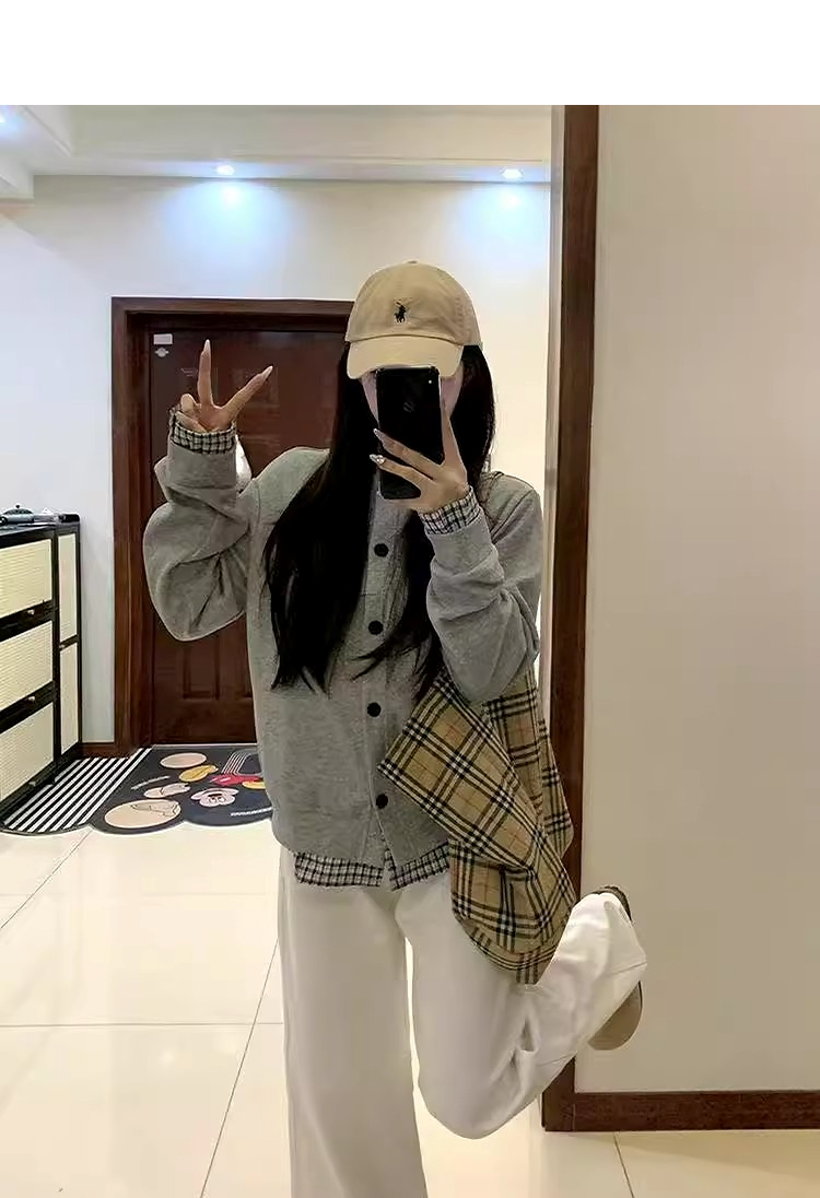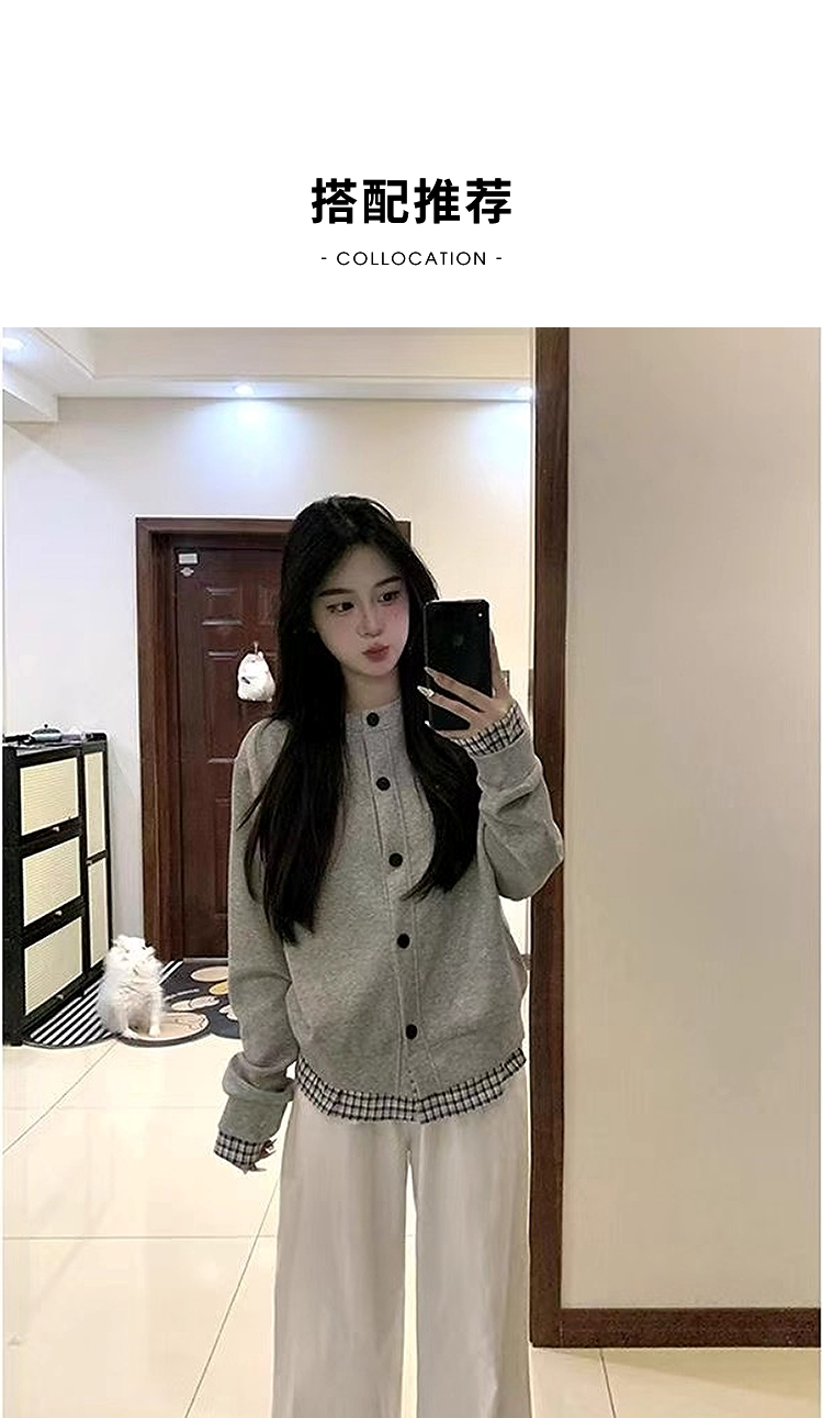 西遇假两件格子拼接毛衣外套女冬新款学院风圆领灰色针织开衫SS051855