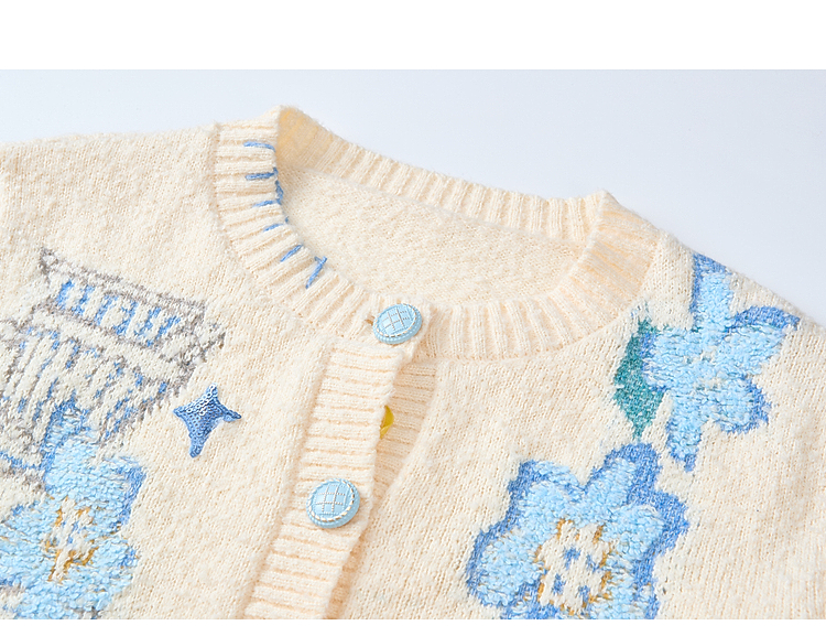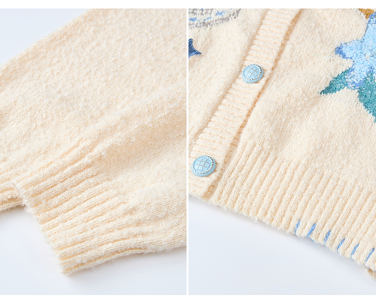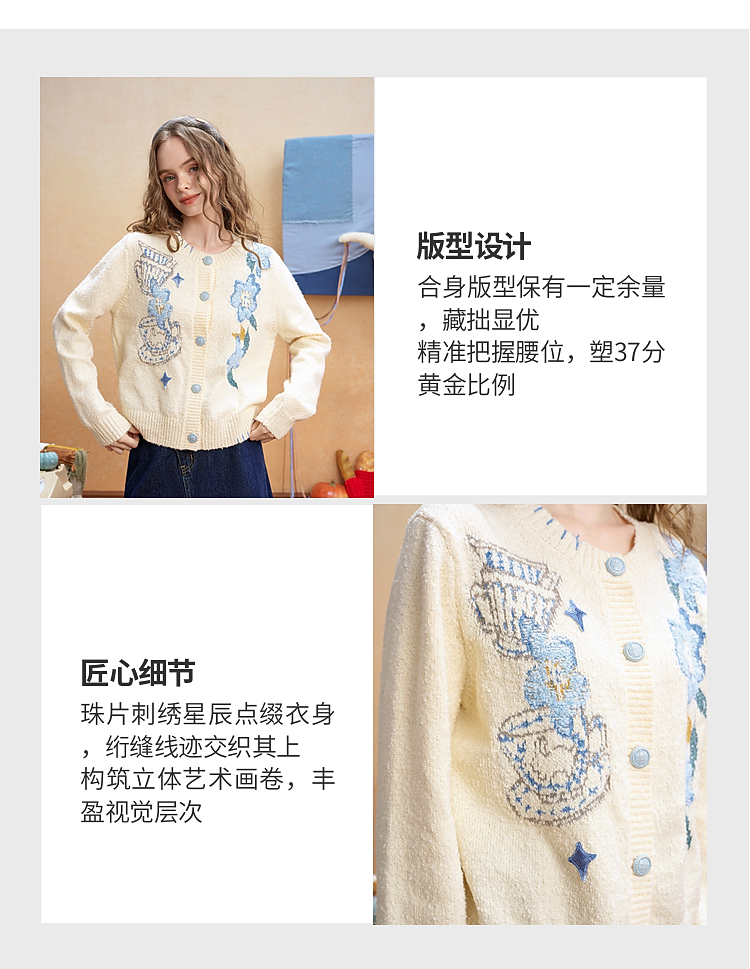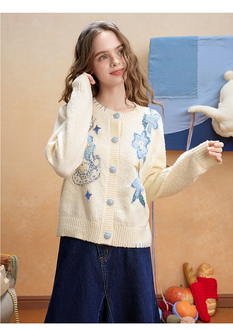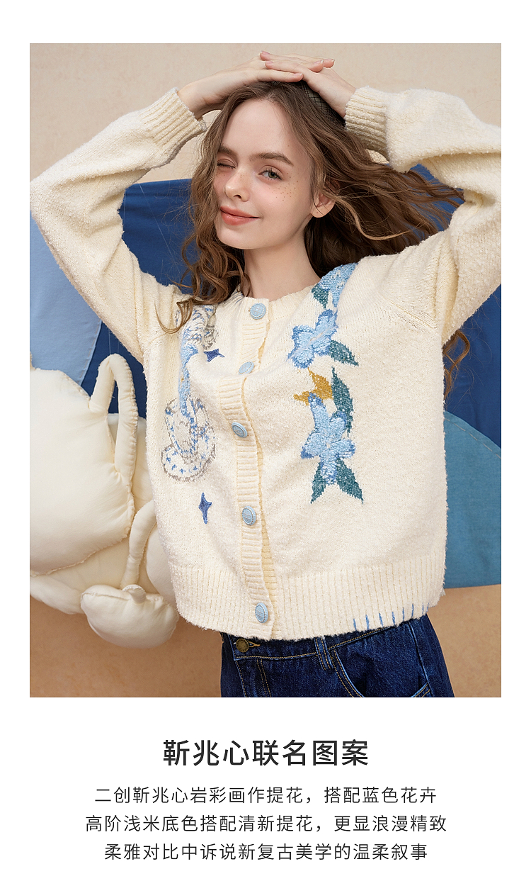 两三事 融雪之时 2025冬季新款甜美提花刺绣毛衣开衫女宽松